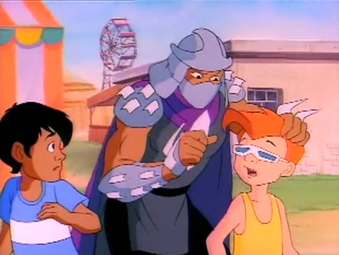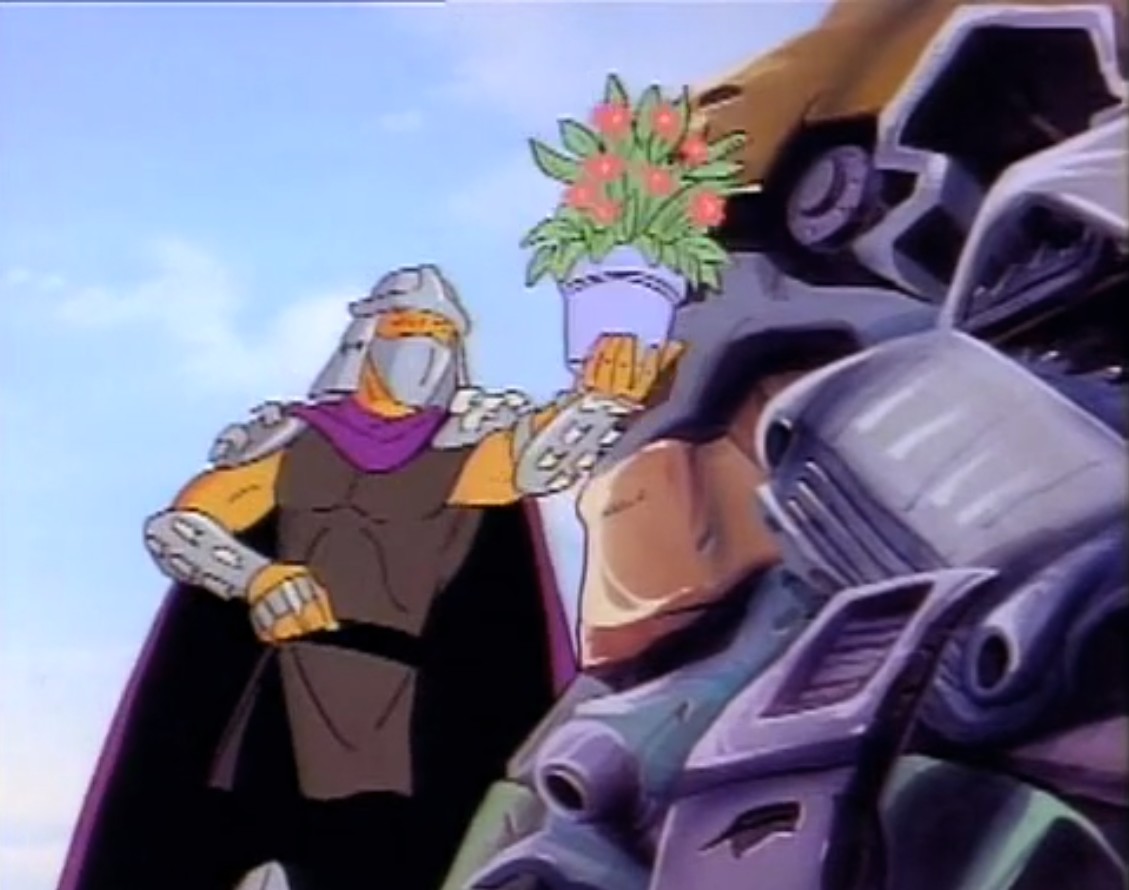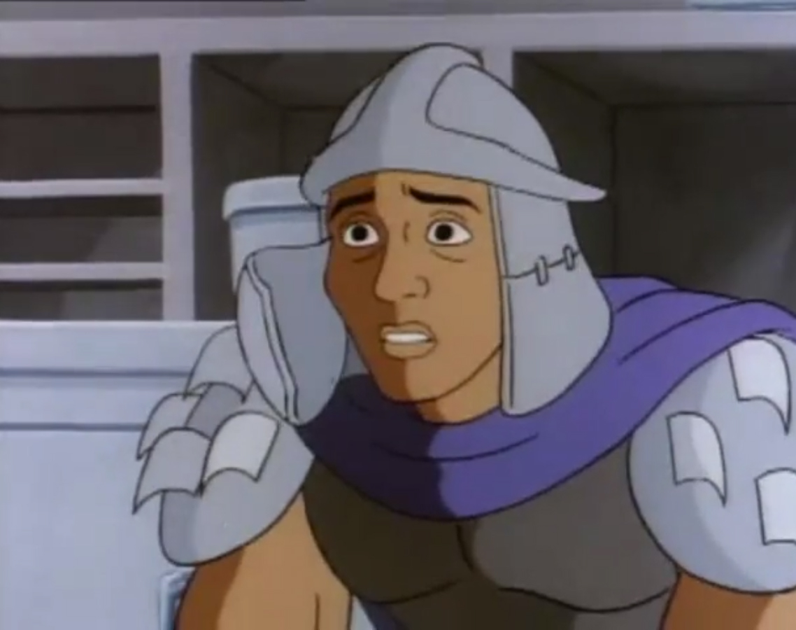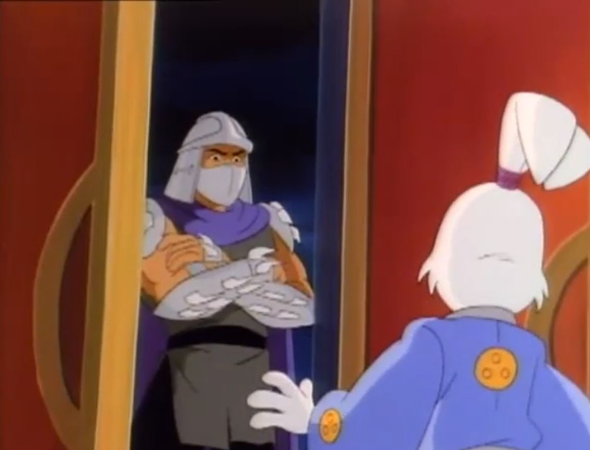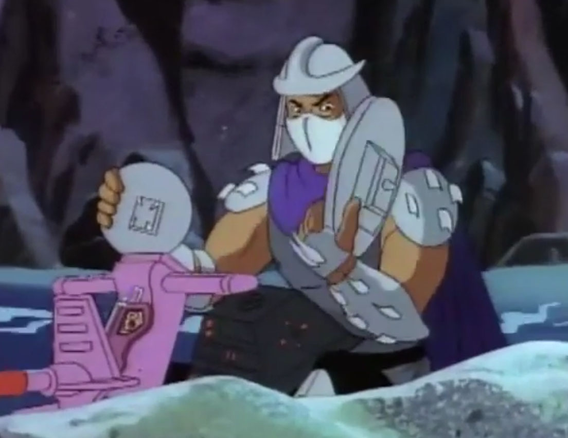 Shredder eut également l’esprit transformé après avoir reçu une décharge d’un appareil qui possédait les données de personnalité de Michaelangelo. Il voulait détruire les tortues puis capturer le président des États-Unis. Se prenant pour la tortue, il partit pour le repaire. Splinter découvrit qu’il ne fallait surtout pas que le vrai nom de leur ennemi soit prononcé, ce qui arriva inévitablement. Cela avait pour effet de rendre sa personnalité à Shredder, qui s’attaqua à Raphael et à Leonardo, qu’il plaça dans une pizza géante prête à partir au four. Les tortues réussirent à lui faire reprendre la conscience de Michaelangelo et de les délivrer. Finalement, ces changements pouvaient être une aubaine pour les frères, qui décidèrent de se jouer de leur ennemi pour le suivre et détruire sa machine. Bebop et Rocksteady crurent encore que leur chef était devenu Michaelangelo (Tortue inattendue, S3 E18).