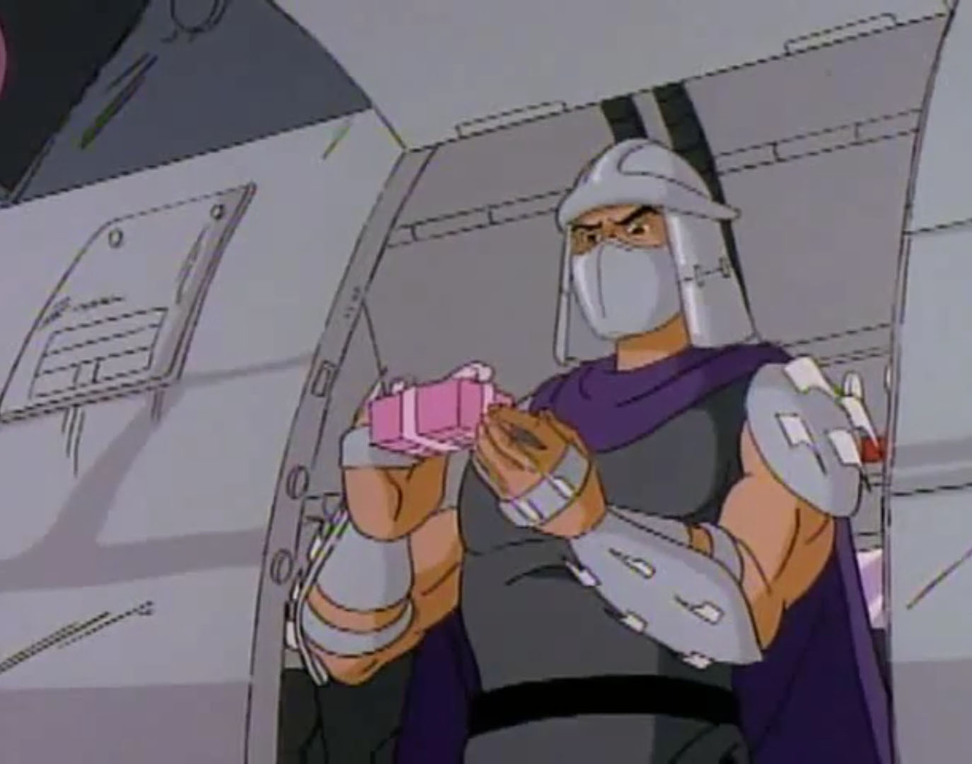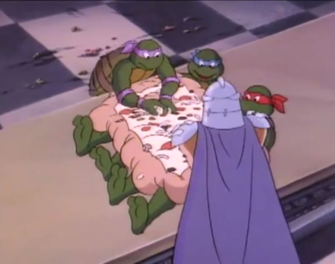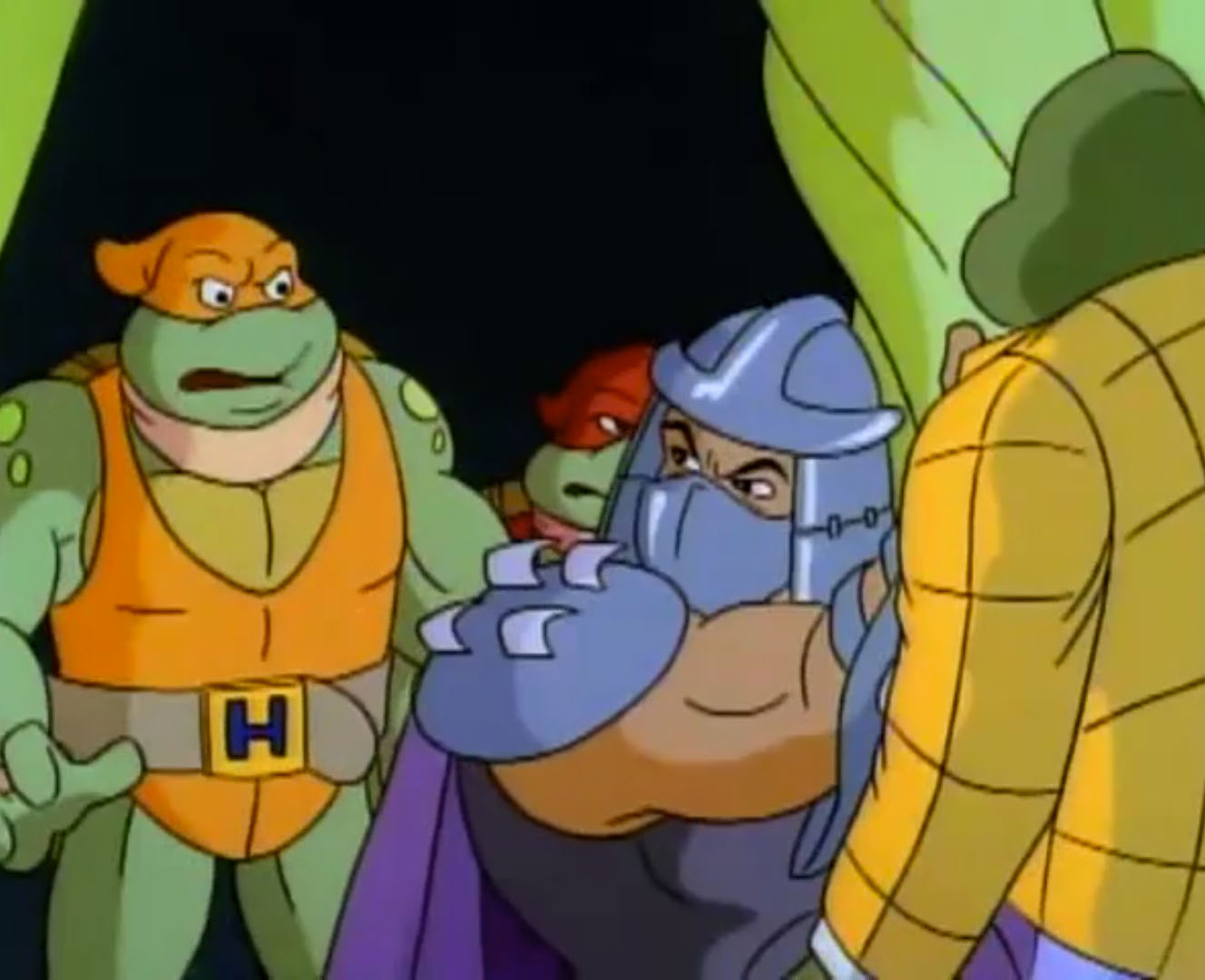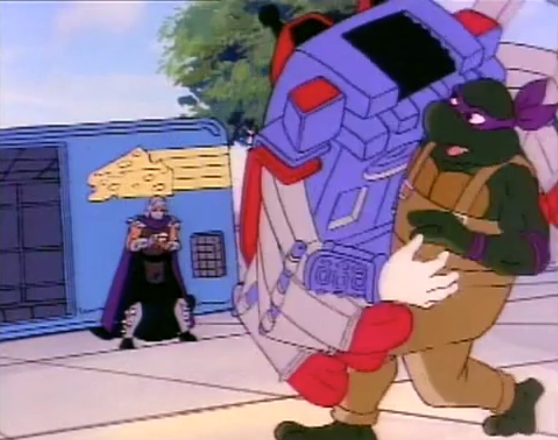 Shredder eut également l’esprit transformé après avoir reçu une décharge d’un appareil qui possédait les données de personnalité de Michaelangelo. Il voulait détruire les tortues puis capturer le président des États-Unis. Se prenant pour la tortue, il partit pour le repaire. Splinter découvrit qu’il ne fallait surtout pas que le vrai nom de leur ennemi soit prononcé, ce qui arriva inévitablement. Cela avait pour effet de rendre sa personnalité à Shredder, qui s’attaqua à Raphael et à Leonardo, qu’il plaça dans une pizza géante prête à partir au four. Les tortues réussirent à lui faire reprendre la conscience de Michaelangelo et de les délivrer. Finalement, ces changements pouvaient être une aubaine pour les frères, qui décidèrent de se jouer de leur ennemi pour le suivre et détruire sa machine. Bebop et Rocksteady crurent encore que leur chef était devenu Michaelangelo (Tortue inattendue, S3 E18).