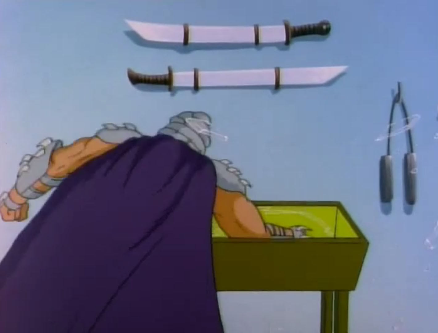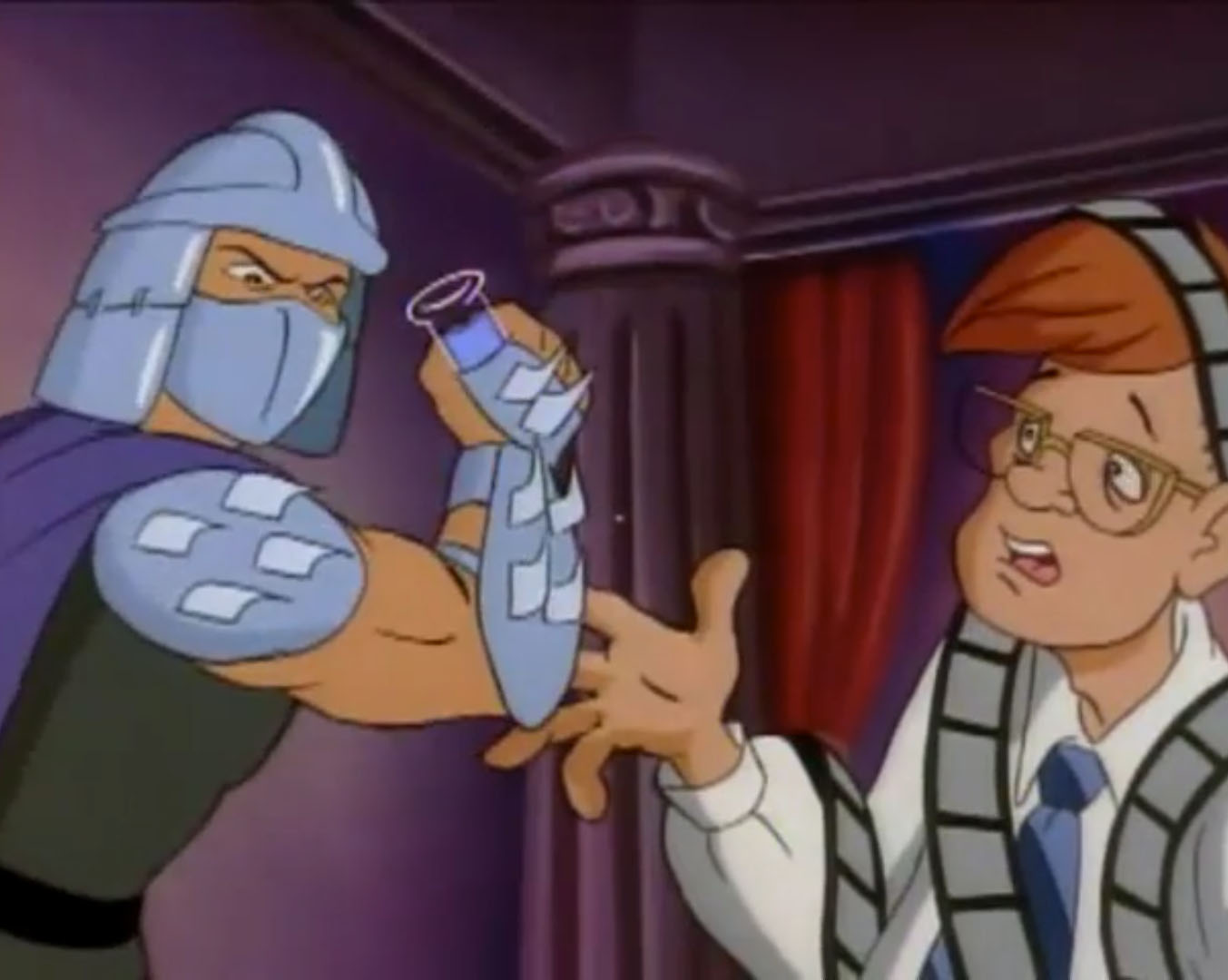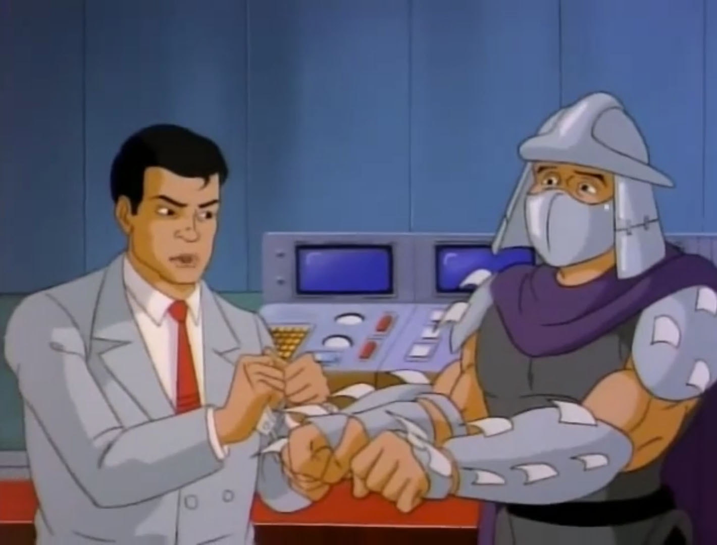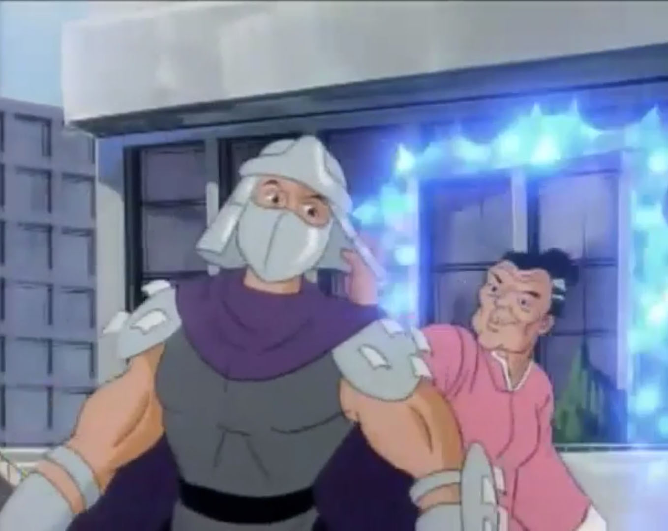 Au cours des épisodes, il arrive de nombreux problèmes à Shredder. Alors qu’il se trouvait dans un entrepôt, les tortues intervinrent pour venir en aide à April. Dans le combat, Splinter et Shredder se retrouvèrent sur le plateau d’une machine qui s’activa et qui intervertit leurs pensées.