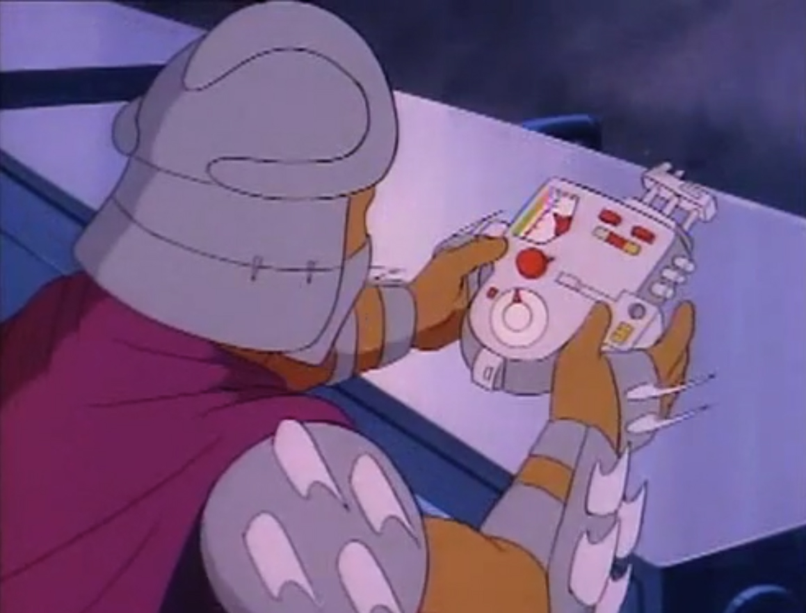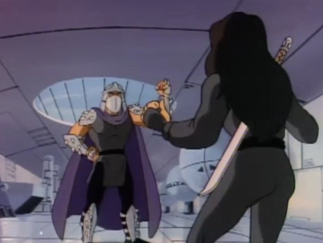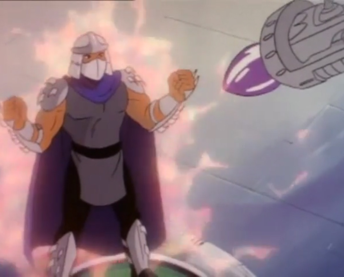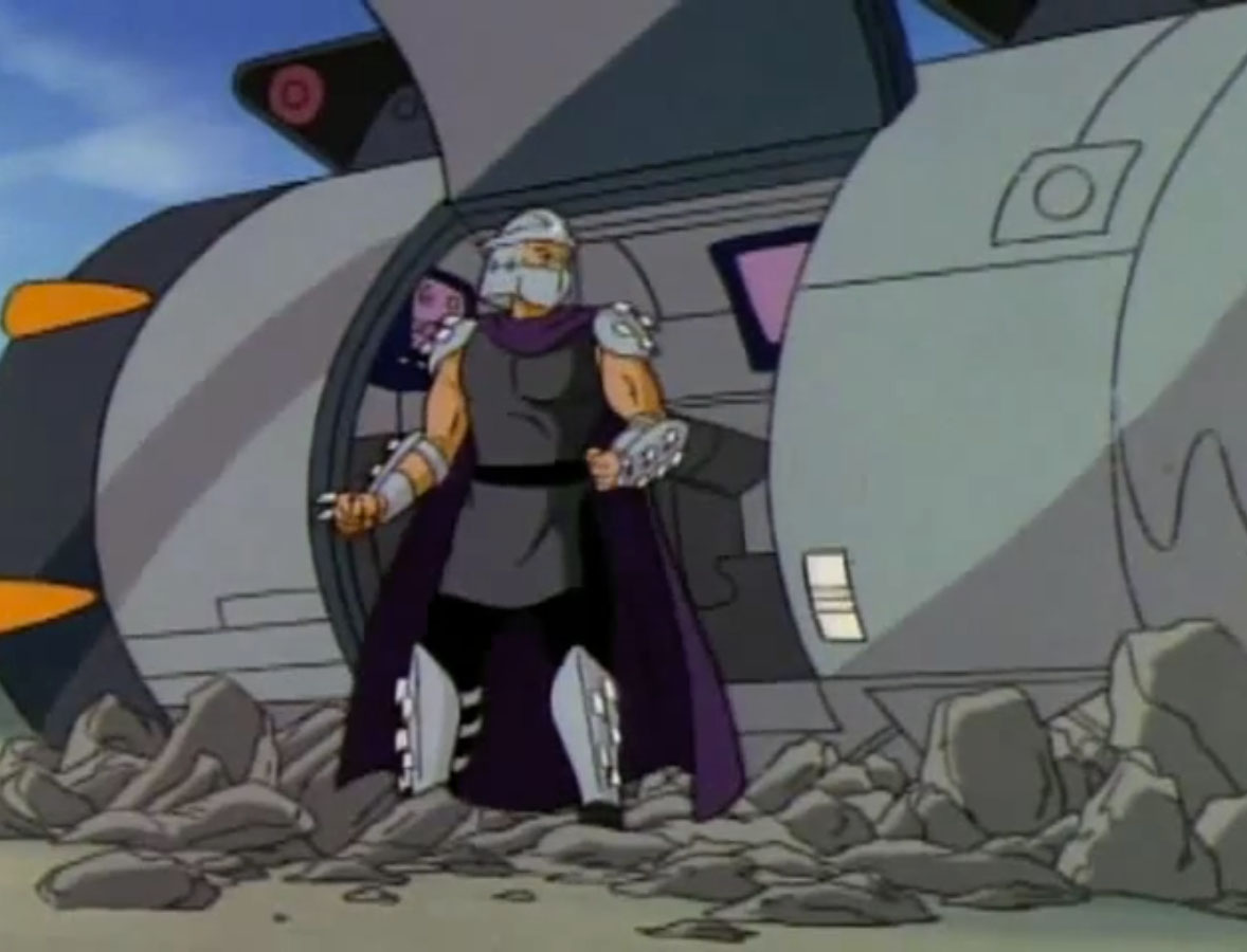 Mais face à la provocation des reptiles, il leur offrit un ultime combat dans la salle des commandes de l’appareil. C’était ce que les ninjas désiraient. Pendant que les frères luttaient contre leur ennemi, le poussant hors du Technodrome, Donatello et Michaelangelo parvinrent à reprogrammer la machine pour ouvrir un portail et quitter la Terre.