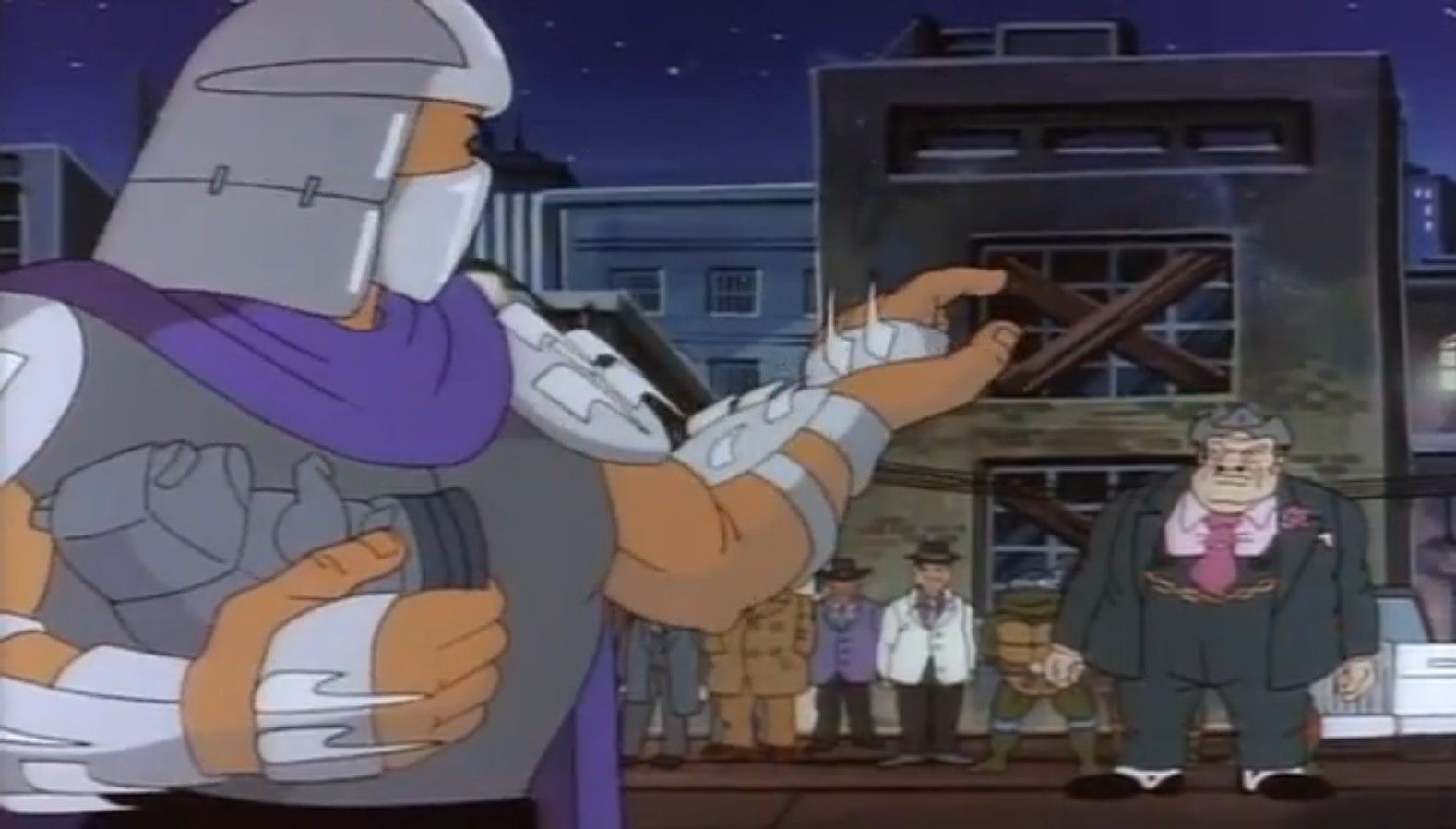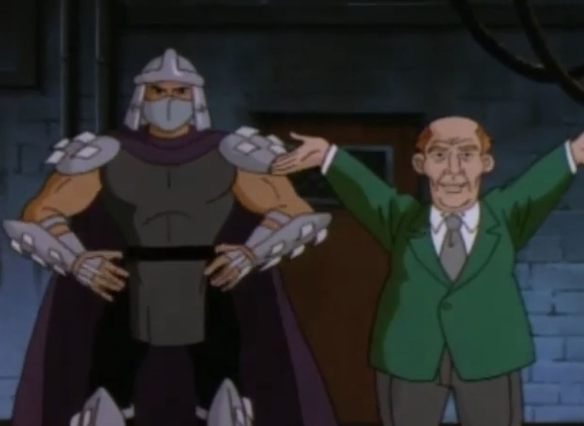 Voulant faire régner la terreur pour faire fructifier ses affaires, Shredder employa un grand nombre de délinquants pour commettre des vols et des dégradations. C’est à ce moment que la journaliste April, de Channel 6, s’intéressa à cette vague de crimes. Devenant gênante, il ordonna à ses hommes de la faire taire. En prenant la fuite, la journaliste fit la connaissance des tortues, qui lui vinrent en aide. Dans leur périple, ils découvrirent que le Foot Clan existait toujours (Sur la piste des tortues, S1 E1).Voyant que Yoshi était toujours vivant, Shredder voulut l’anéantir à tous prix. Il demanda pour cela à Krang de lui fournir la technologie nécessaire. En échange, il lui fabriquerait un corps robotique afin de pouvoir mieux se mouvoir. L’extraterrestre lui proposa de lui donner du mutagène et de l’utiliser sur ses hommes pour qu’ils puissent rivaliser contre les tortues. Il créa alors les mutants Bebop et Rocksteady.