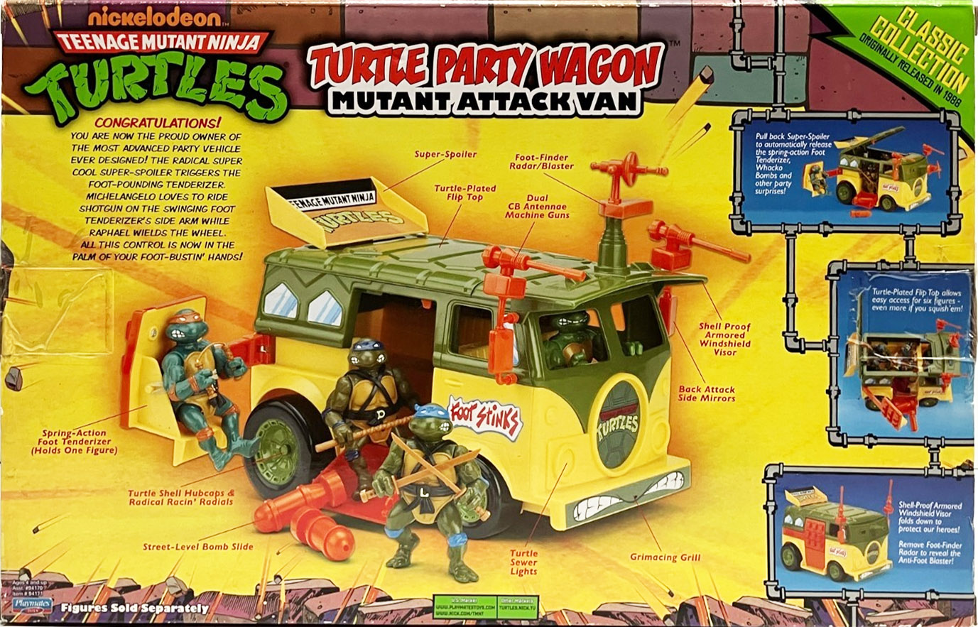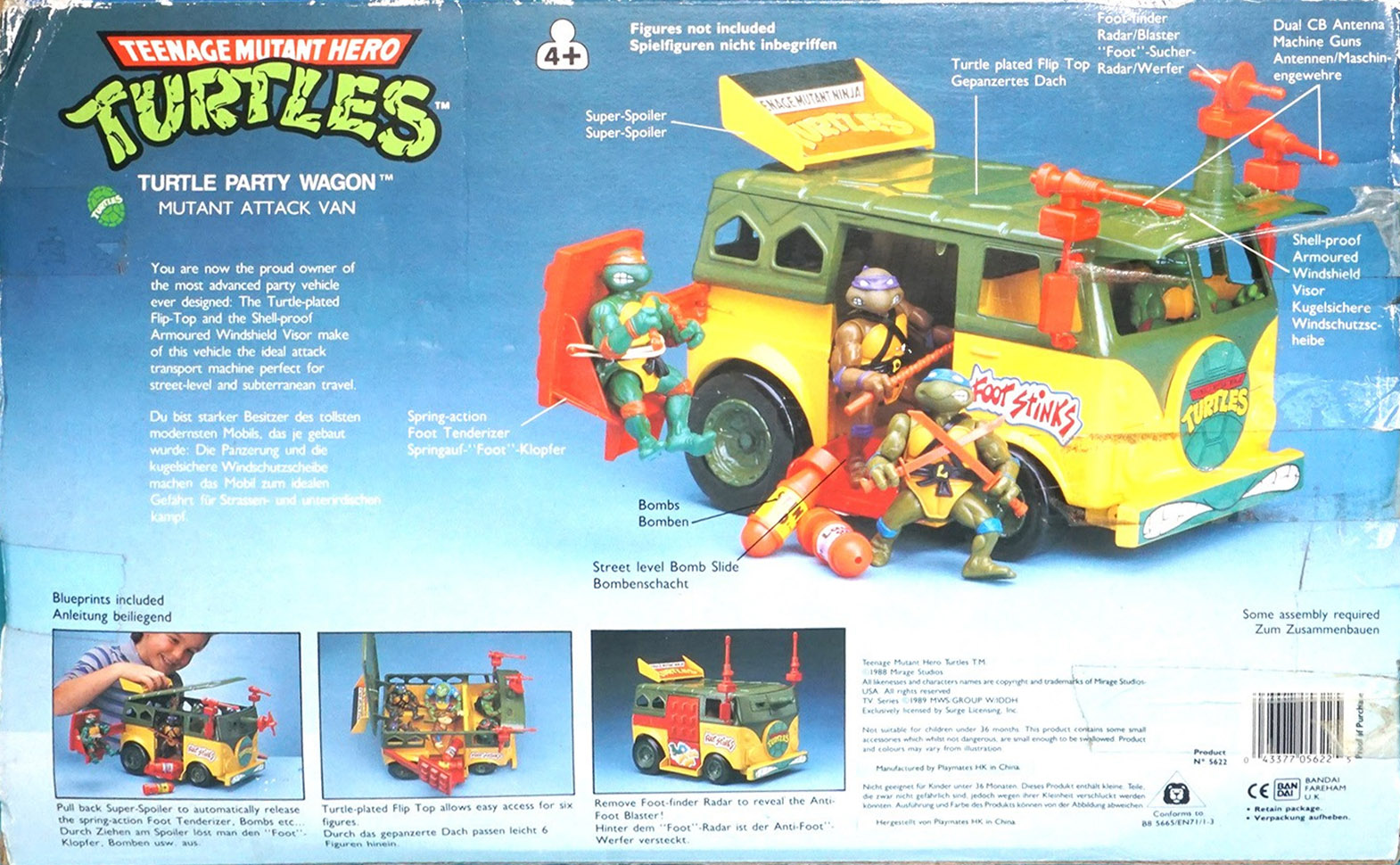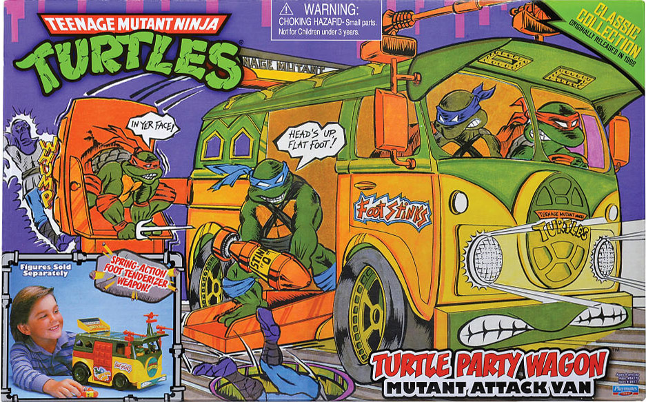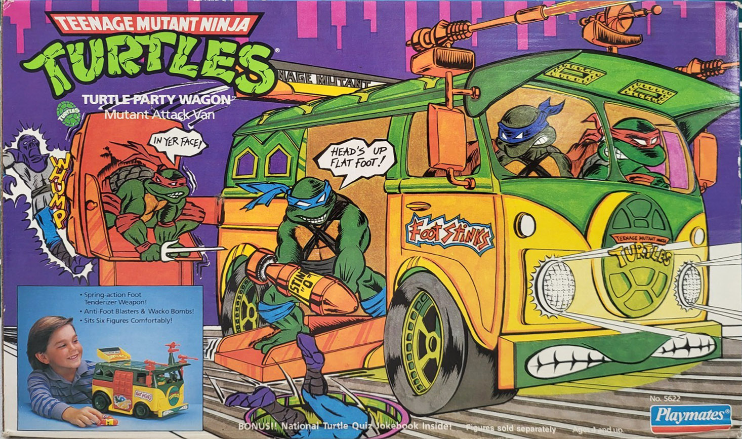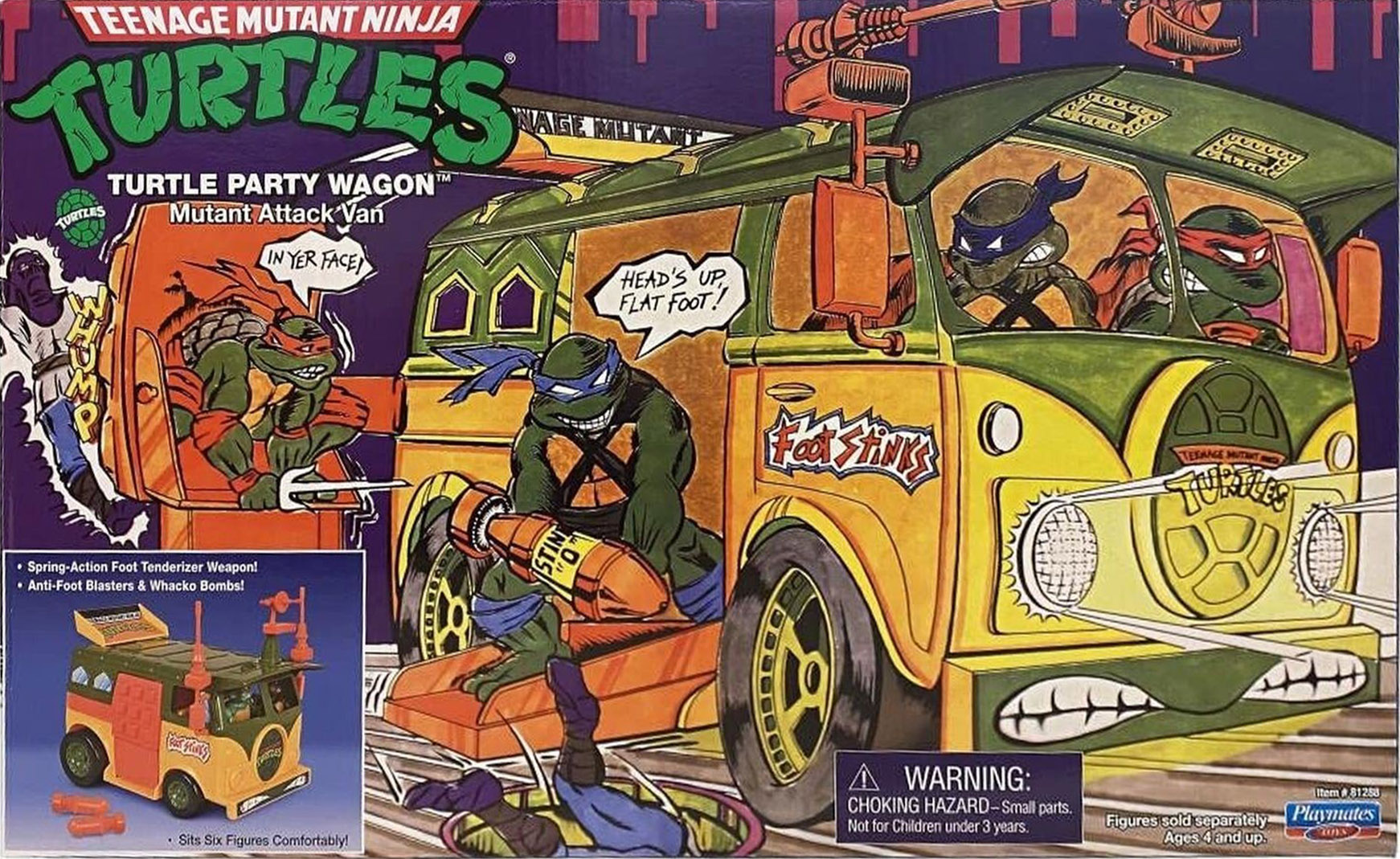 Le Party wagon était le véhicule par excellence des Tortues Ninja. Ce camion possède un toit ouvrant permettant de disposer les figurines à l’arrière sur les sièges, ou à l’avant, à raison de 5 personnages dont 4 derrière. Par ailleurs, il est possible de fixer une tortue sur la porte latérale, à l’aide d’un élastique. Celle-ci est maintenue fermée à l’aide d’un blocage situé dans le toit. Une fois ce dernier ouvert, un mécanisme à ressort permet de déplier la porte, qui révèle la tortue prête au combat. La petite trappe sous la porte tombe à son tour, libérant les bombes qui roulent sur les ennemis. Hélas, le mécanisme est extrêmement fragile et tend très facilement à se casser, rendant impossible la tenue du bras de la porte.