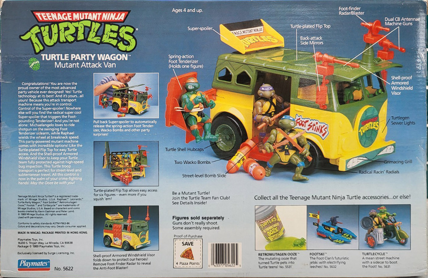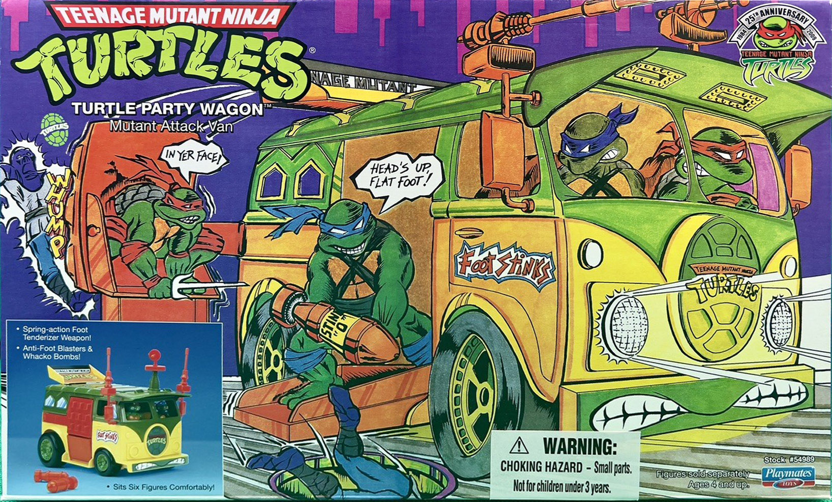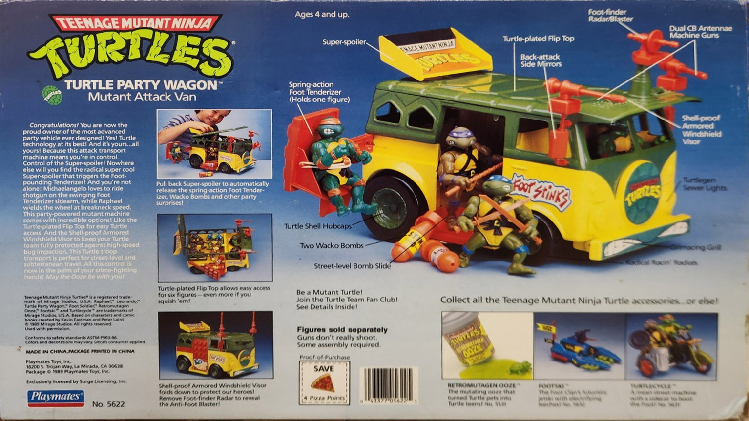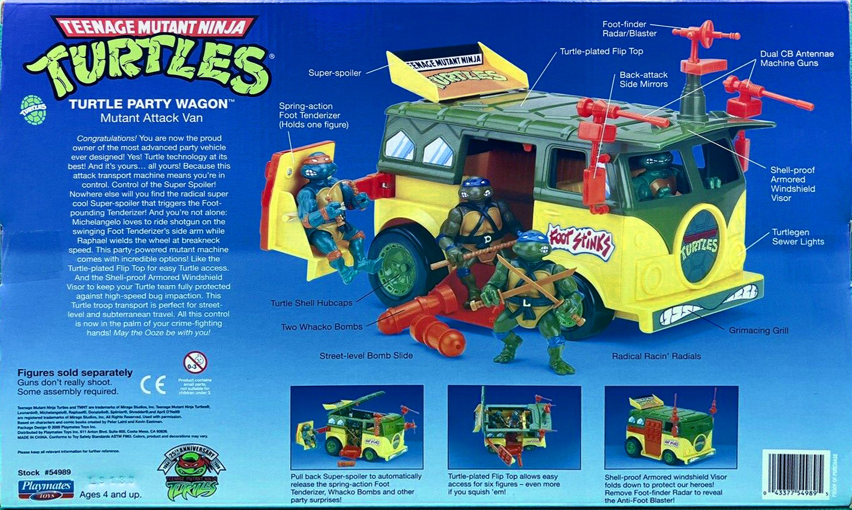 Le Party wagon était le véhicule par excellence des Tortues Ninja. Ce camion possède un toit ouvrant permettant de disposer les figurines à l’arrière sur les sièges, ou à l’avant, à raison de 5 personnages dont 4 derrière. Par ailleurs, il est possible de fixer une tortue sur la porte latérale, à l’aide d’un élastique. Celle-ci est maintenue fermée à l’aide d’un blocage situé dans le toit. Une fois ce dernier ouvert, un mécanisme à ressort permet de déplier la porte, qui révèle la tortue prête au combat. La petite trappe sous la porte tombe à son tour, libérant les bombes qui roulent sur les ennemis. Hélas, le mécanisme est extrêmement fragile et tend très facilement à se casser, rendant impossible la tenue du bras de la porte.