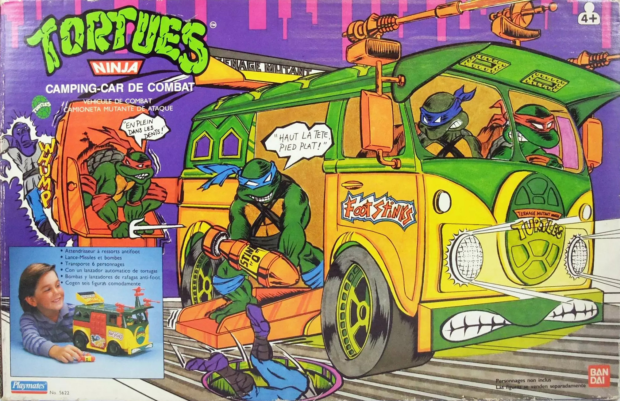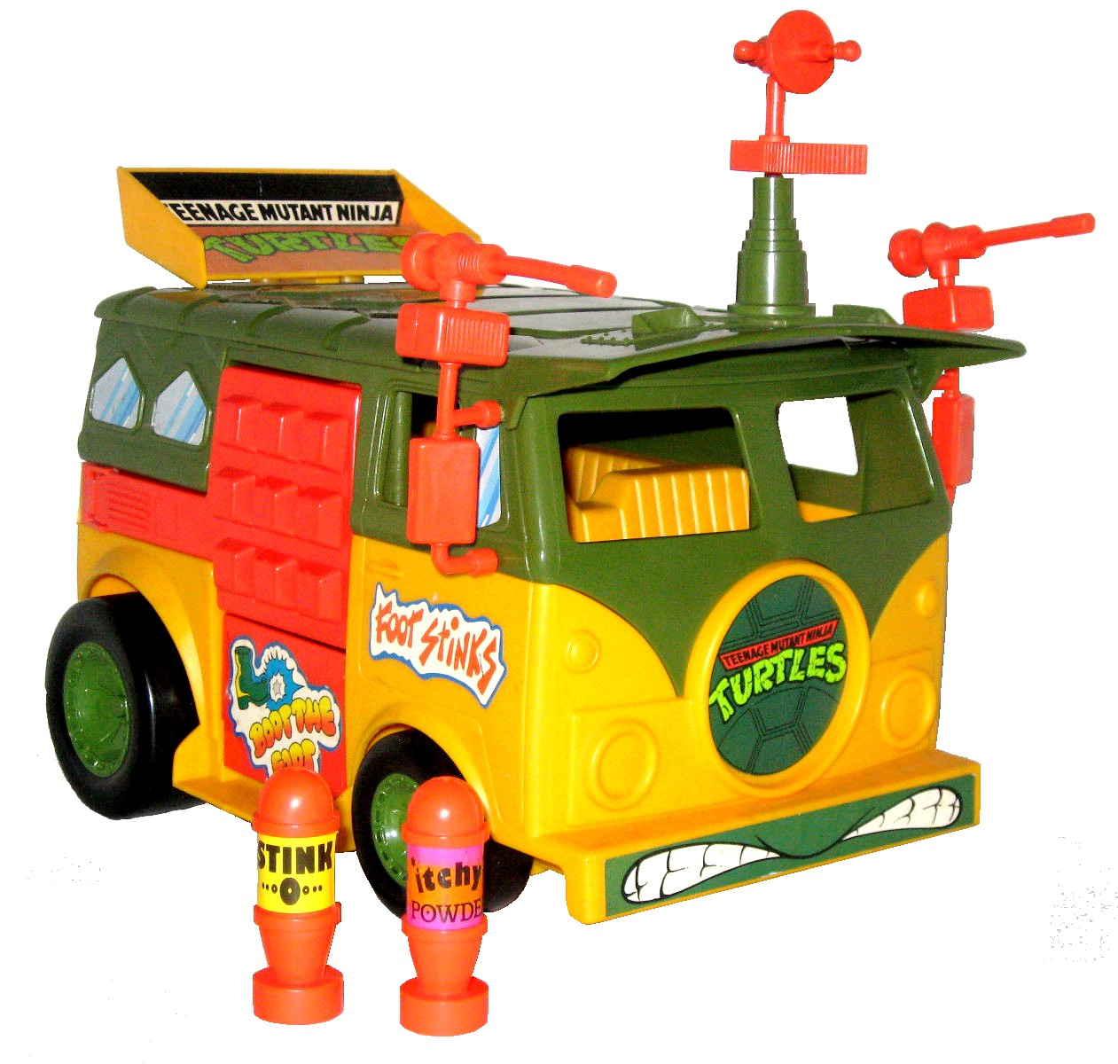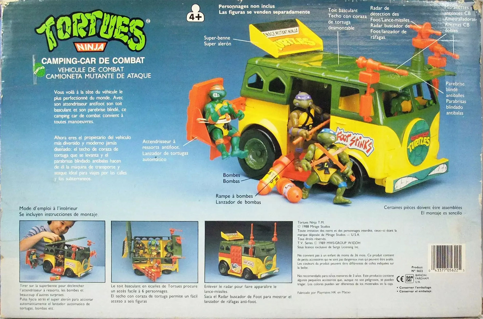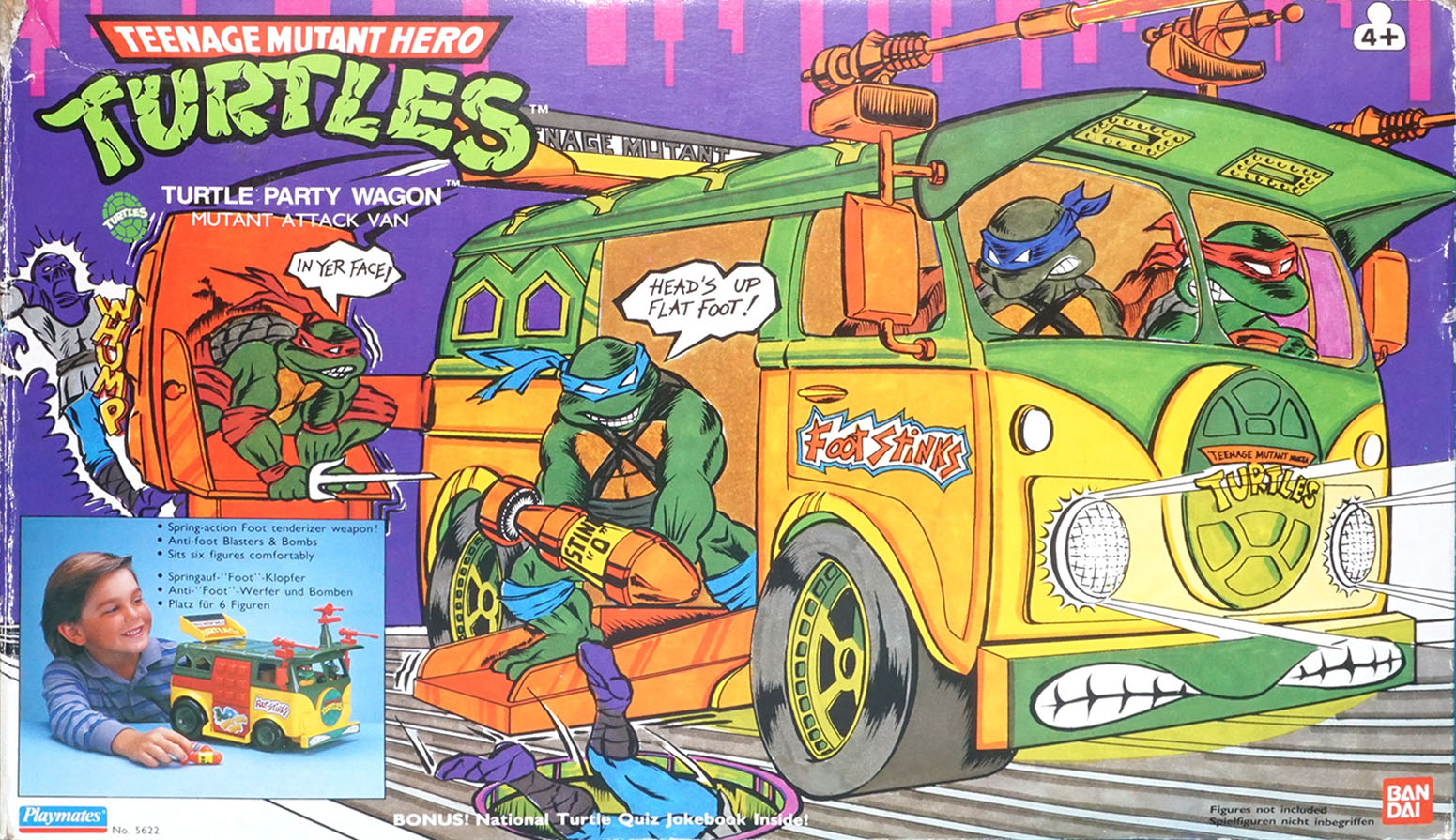 Le Party wagon était le véhicule par excellence des Tortues Ninja. Ce camion possède un toit ouvrant permettant de disposer les figurines à l’arrière sur les sièges, ou à l’avant, à raison de 5 personnages dont 4 derrière. Par ailleurs, il est possible de fixer une tortue sur la porte latérale, à l’aide d’un élastique. Celle-ci est maintenue fermée à l’aide d’un blocage situé dans le toit. Une fois ce dernier ouvert, un mécanisme à ressort permet de déplier la porte, qui révèle la tortue prête au combat. La petite trappe sous la porte tombe à son tour, libérant les bombes qui roulent sur les ennemis. Hélas, le mécanisme est extrêmement fragile et tend très facilement à se casser, rendant impossible la tenue du bras de la porte.