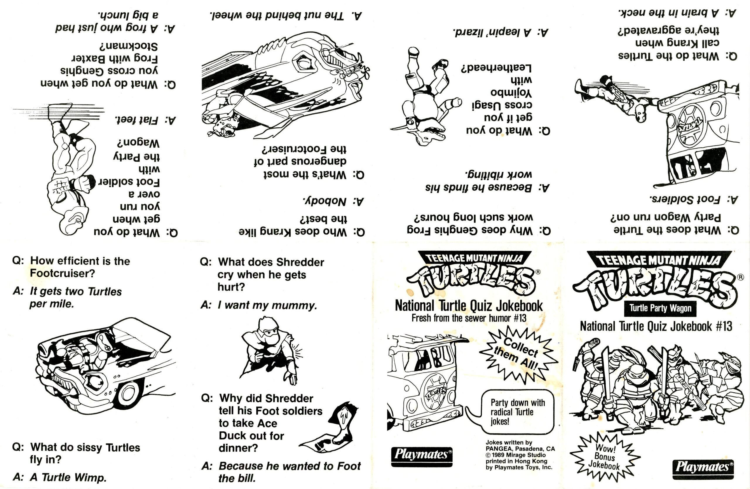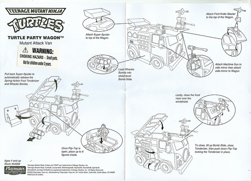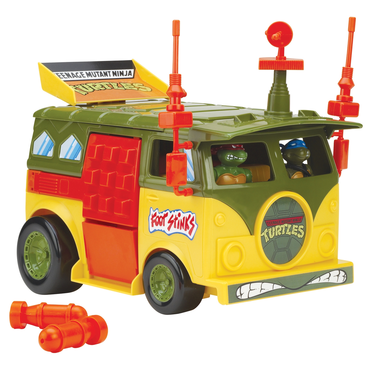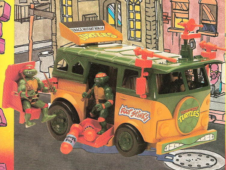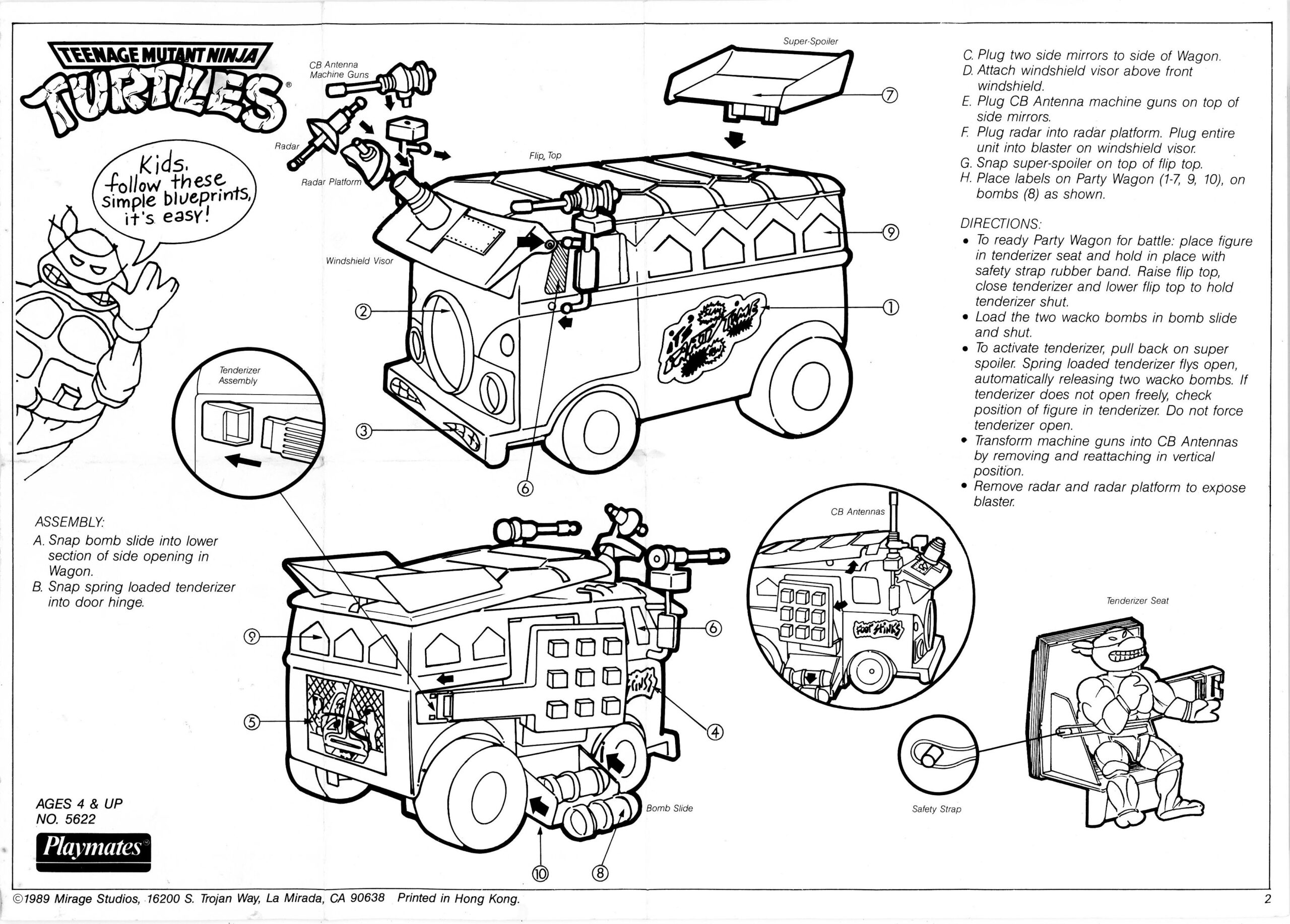 Le Party wagon était le véhicule par excellence des Tortues Ninja. Ce camion possède un toit ouvrant permettant de disposer les figurines à l’arrière sur les sièges, ou à l’avant, à raison de 5 personnages dont 4 derrière. Par ailleurs, il est possible de fixer une tortue sur la porte latérale, à l’aide d’un élastique. Celle-ci est maintenue fermée à l’aide d’un blocage situé dans le toit. Une fois ce dernier ouvert, un mécanisme à ressort permet de déplier la porte, qui révèle la tortue prête au combat. La petite trappe sous la porte tombe à son tour, libérant les bombes qui roulent sur les ennemis. Hélas, le mécanisme est extrêmement fragile et tend très facilement à se casser, rendant impossible la tenue du bras de la porte.