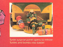Il était prévu à l’origine d’insérer une trappe à l’avant du véhicule, pour libérer des bombes et même une tortue ! Ce mécanisme, que l’on voit sur le catalogue de 1988 du fabriquant, n’a finalement pas été car certainement trop onéreux. Il est toutefois intéressant de voir l’idée perdurer jusqu’au stade quasi-final de la production.