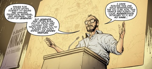 Ainsi, Karai vint lui rendre une visite directement après sa conférence (The secret history of the Foot Clan, part. 1), puis le lendemain devant son université pour qu’il la suive. Oroku Saki voulait s’entretenir directement avec lui, disant qu’il possédait également un fragment du livre. Les tortues prirent en chasse le véhicule du Foot Clan et Raphael mit un traceur sur le sac du professeur leur permettant de savoir où il se trouvait (The secret history of the Foot Clan, part. 2).