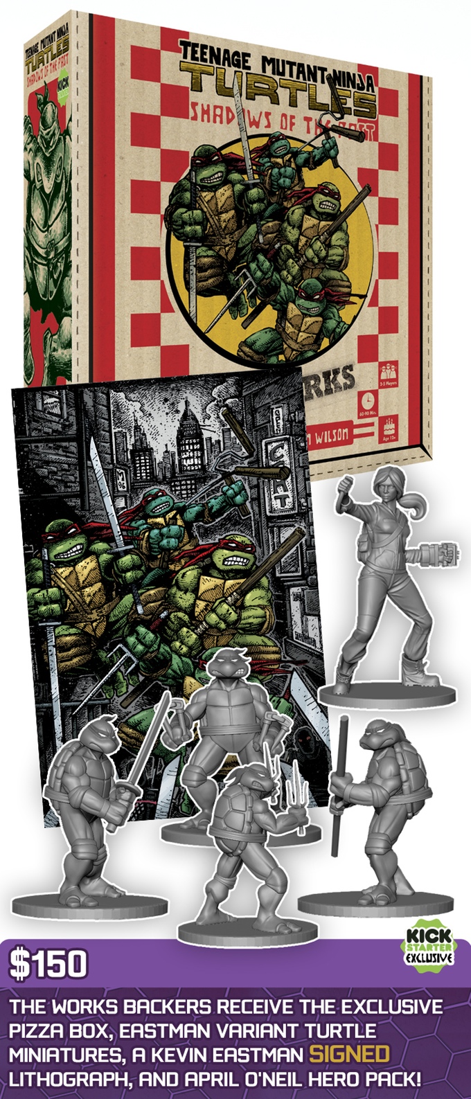 Les adhérents de la version The works et de l’édition limitée à 25 exemplaires bénéficieront aussi d’April et de ses cartes, mais surtout des quatre Tortues Ninja issues des dessins de Kevin Eastman, de Splinter et des Mousers.