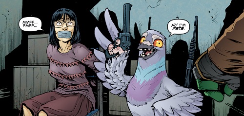 Pete était un pigeon qui avait été transformé en mutant par Old Hob dans le but de se créer une armée de mutants. Le mutagène utilisé était celui issu du bocal que Splinter avait dérobé à StockGen (TMNT #26). Étant sa première création, il ne possédait pas encore toutes les clés pour en faire un mutant dont les facultés cognitives étaient totalement développées. Voyant le résultat, assez décevant, il décida par la suite de capturer Lindsey Baker, de StockGen (TMNT #34).