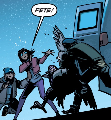 - Pigeon Pete est le premier personnage créé pour la série animée de 2012 à être introduit dans le comic d’IDW Publishing.