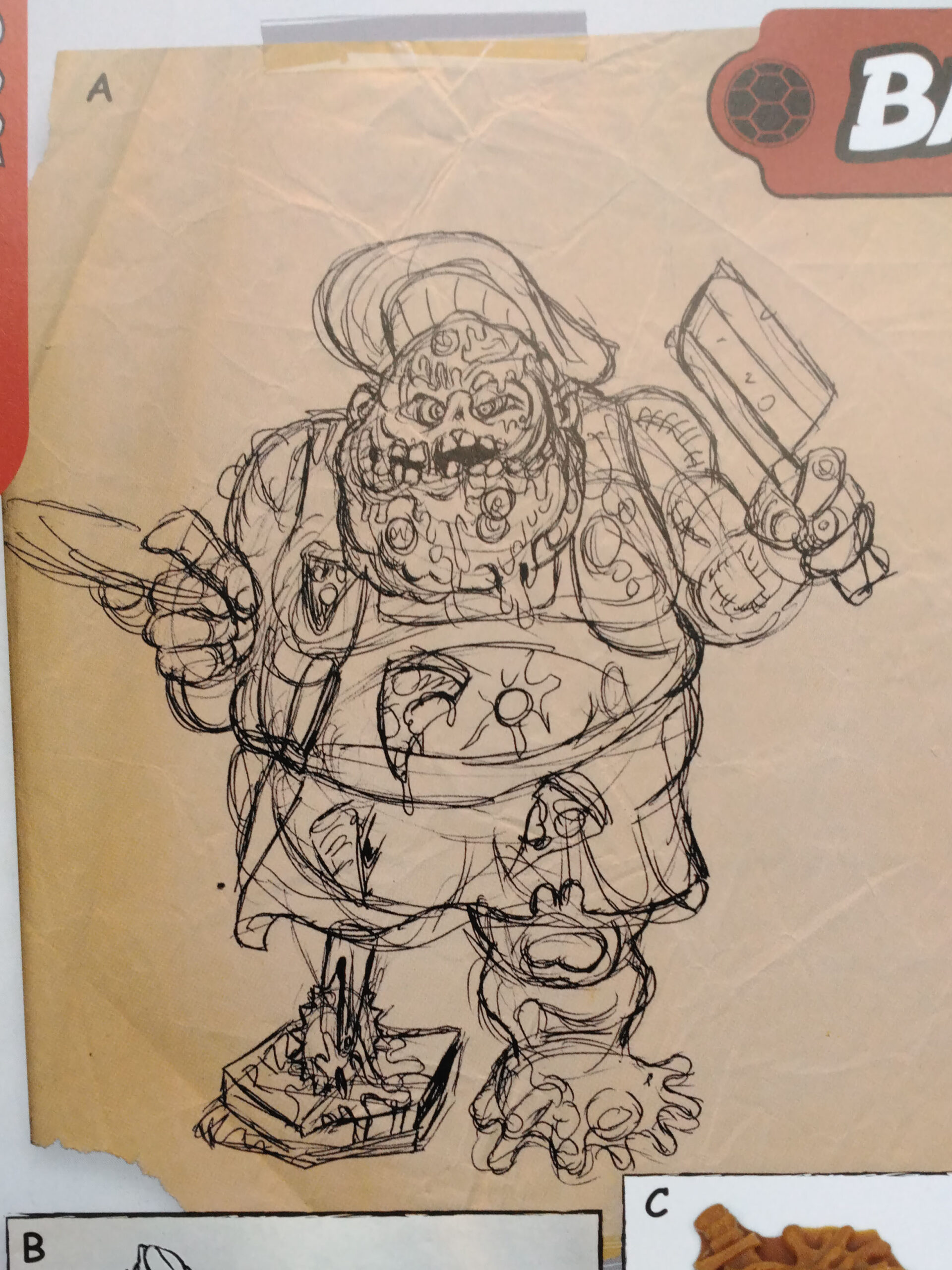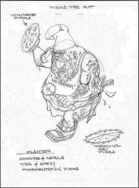 Pizzaface est l’un des rares personnages à n’avoir jamais été introduit dans le dessin animé ou dans les comics contemporains de sa figurine. Un premier dessin préparatoire a été réalisé par Errol McCarthy, qui signe au passage une de ses dernières participations sur les Tortues Ninja (Fig. 1). Et pour une fois, le concept du personnage n’est pas si éloigné du résultat final. Le personnage est un pizzaïolo corpulent, avec un tablier, une toque et qui lance des pizzas. Le nom de travail n’était autre que… Pizza the Hut ! Bel hommage à Star Wars.