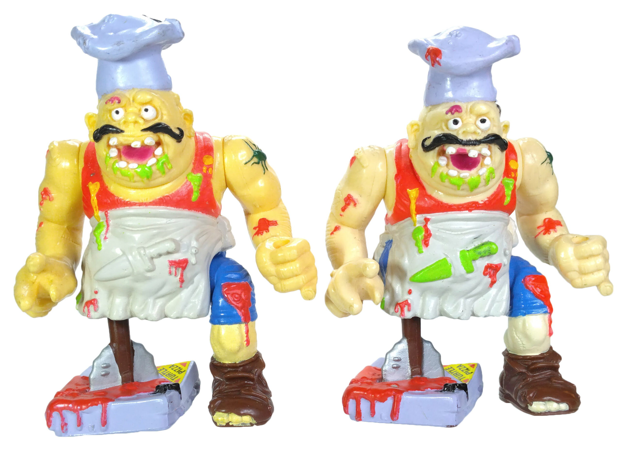Il existe deux versions pour Pizzaface, une dite « white knife » et l’autre « green knife ». C’est très simple, l’une possède un couteau non peint (couleur du tablier) et l’autre peint de vert. Ce ne sont pas les seules différences. La version au couteau blanc possède les sauces dans le dos peintes de vert. Inversement, le couteau vert ne les possède pas peintes. Cette seconde version possède également plus de taches rouges sur ses vêtements et sa toque sur la face avant. Ces deux variantes sont assez étonnantes, car elles ont toutes les deux été produites en Chine en 1990. La version au couteau verte est beaucoup moins courante et produite plutôt en 1991. Pour cette raison, l’Europe et la France ont été approvisionnées par cette version.