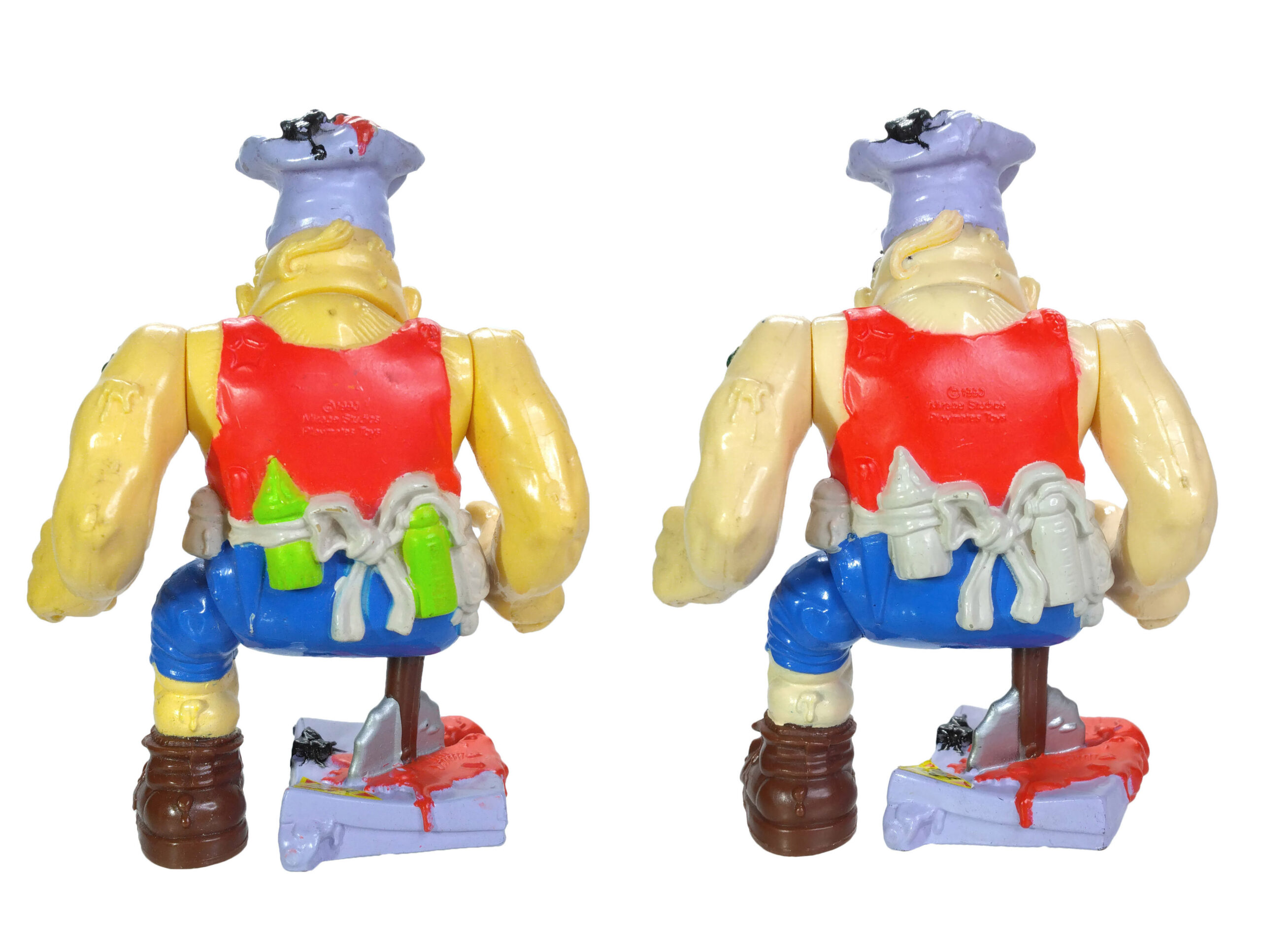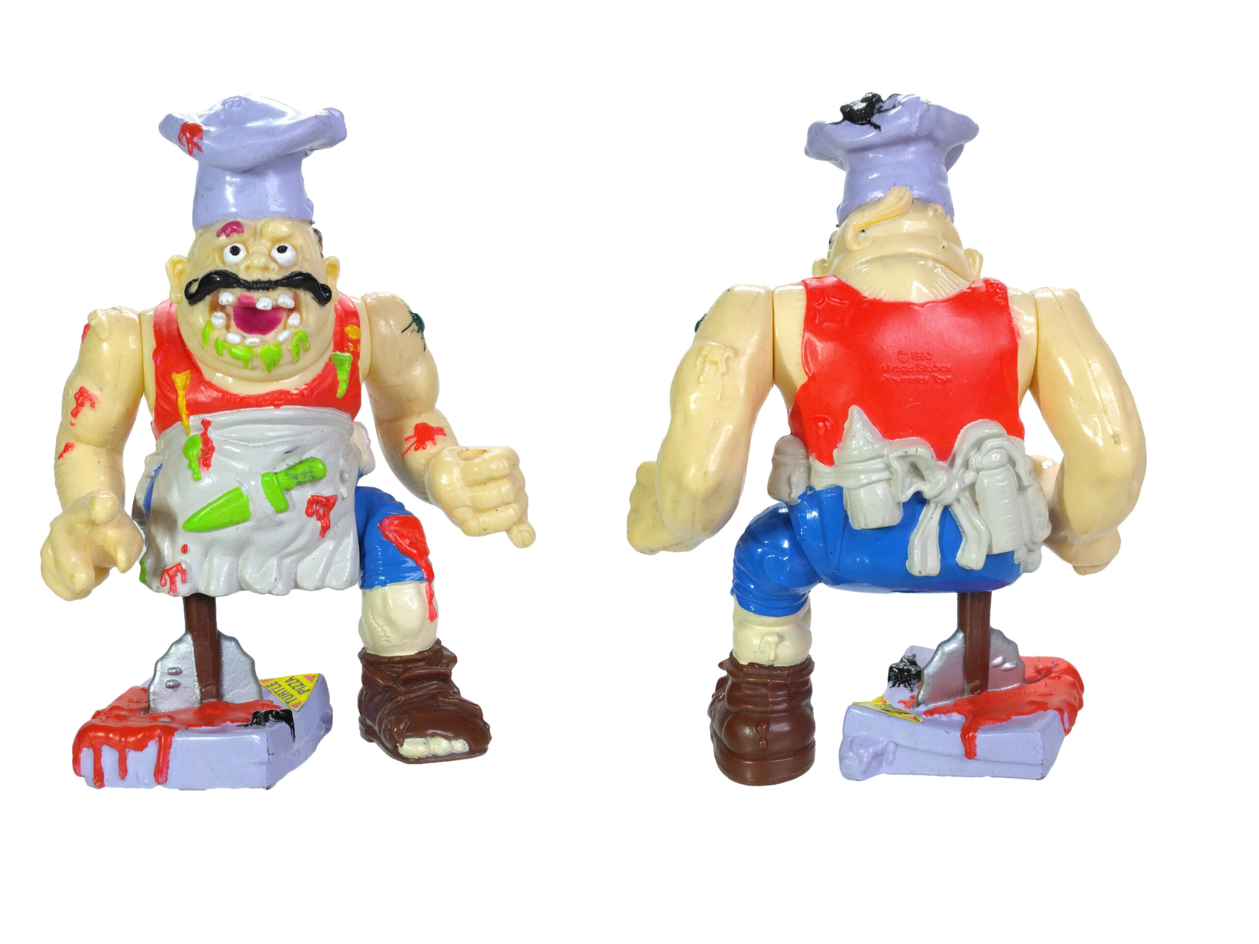 La figurine de Pizzaface est sortie en fin d’année 1990. S’il était déjà prêt lors des photographies officielles pour le catalogue de Playmates Toys de début 1990, il ne serait pas impossible qu’il ait rencontré quelques retards de production – peut-être à cause de la seconde tête qui posait question ? D’ailleurs, si l’on regarde attentivement la photo du catalogue, on se rend compte qu’il s’agit bien du modèle avec une seconde tête cachée sous la toque (le modèle des figures 12 et 13).