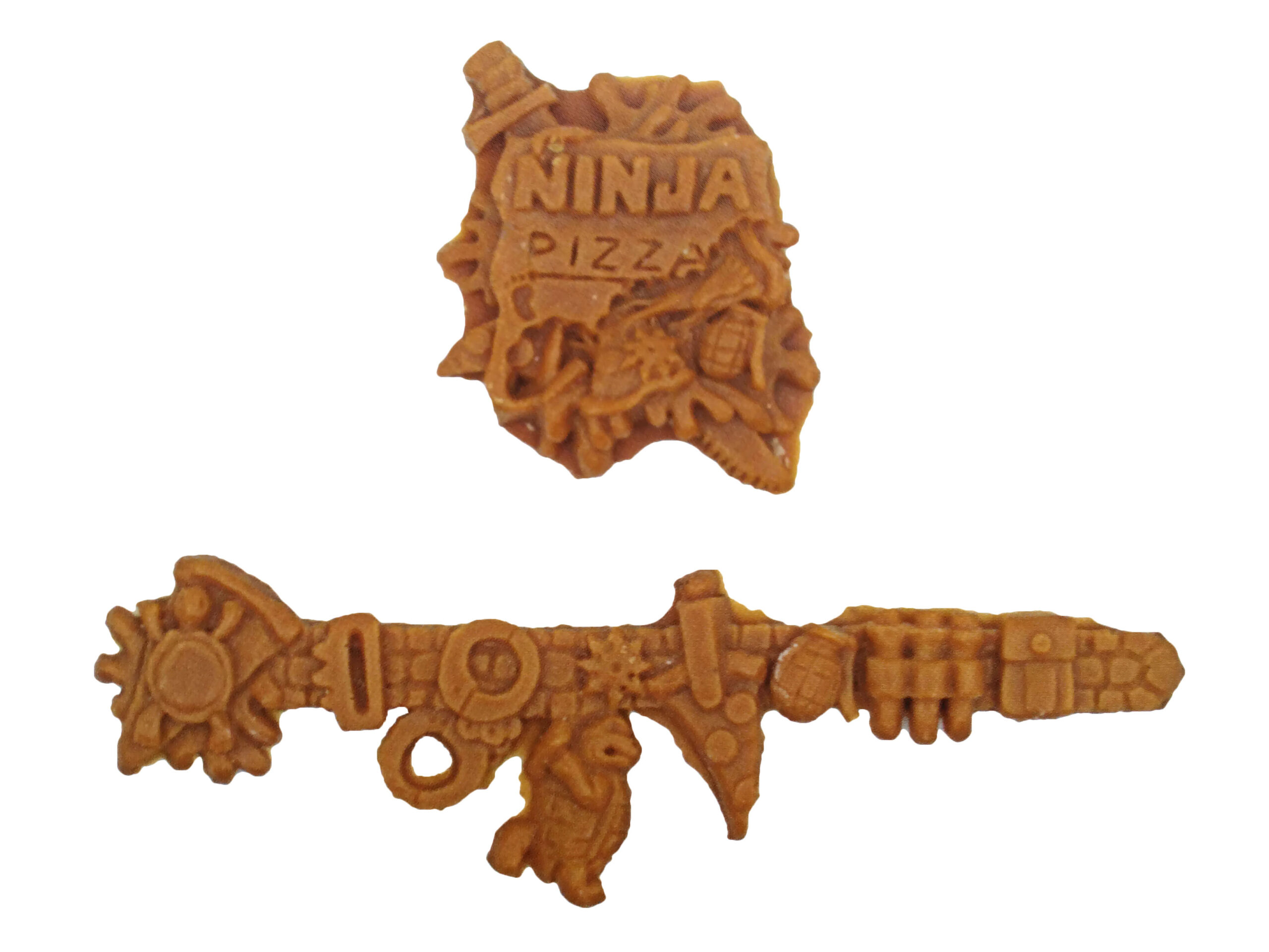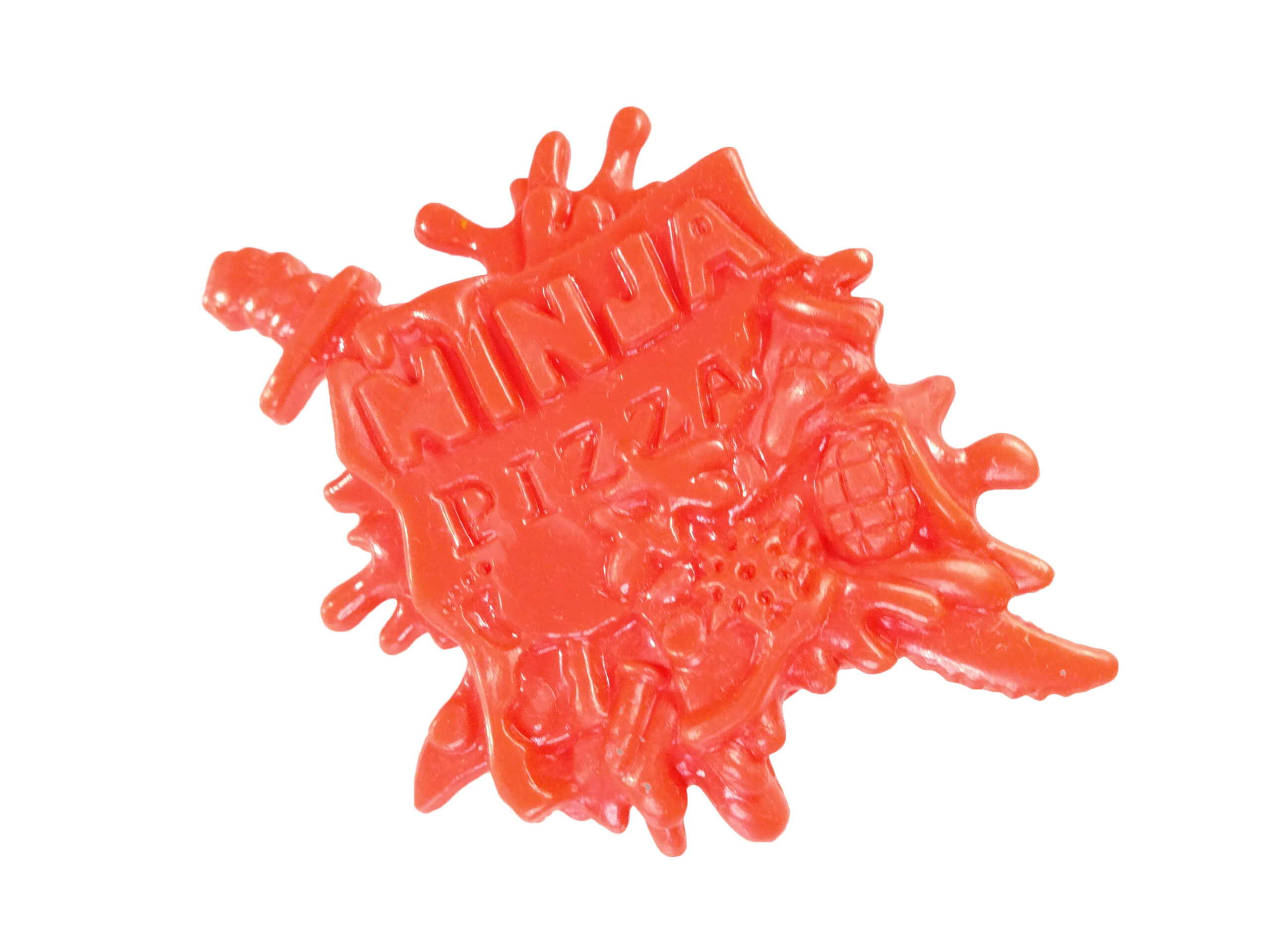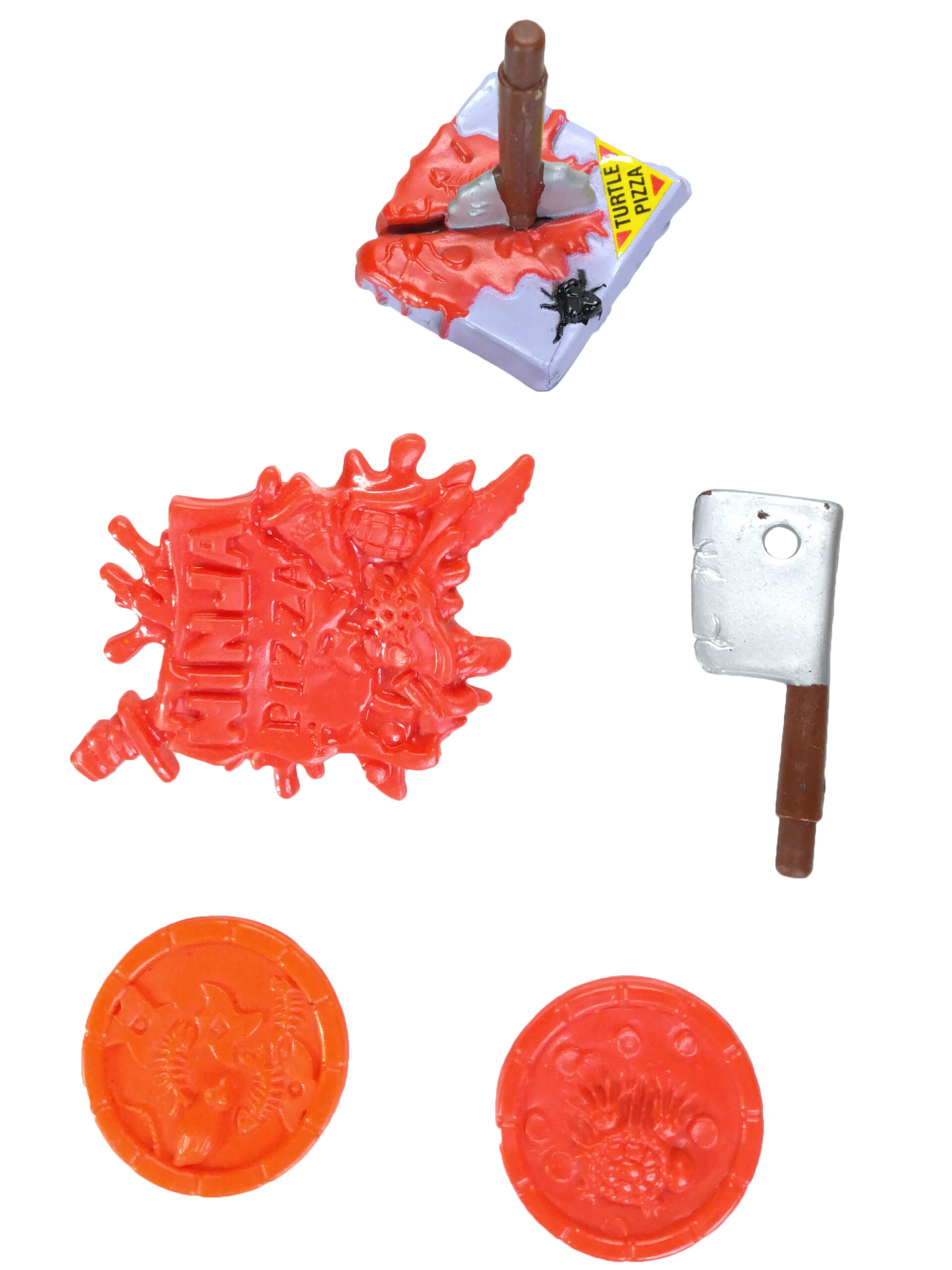Enfin, notre pizzaiolo de l’enfer possède deux pizzas. Celles-ci sont entièrement moulées dans un plastique rouge et épais. Il arrive que ce plastique vieillisse mal, notamment du fait de son exposition. C’est le cas de l’un de mes exemplaires, présenté dans cette review. Il ne s’agit que d’une altération et non une variante ou un changement volontaire. Ces pizzas sont entièrement sculptées. Il ne s’agit pas de stickers posés sur une surface lisse comme pour le Pizza thrower ou les pizzas des Storage shell turtles. Sur l’une des pizzas, nous voyons une petite tortue non mutée totalement embourbée dans le fromage. Sur la seconde, des shurikens et le squelette d’un poisson.