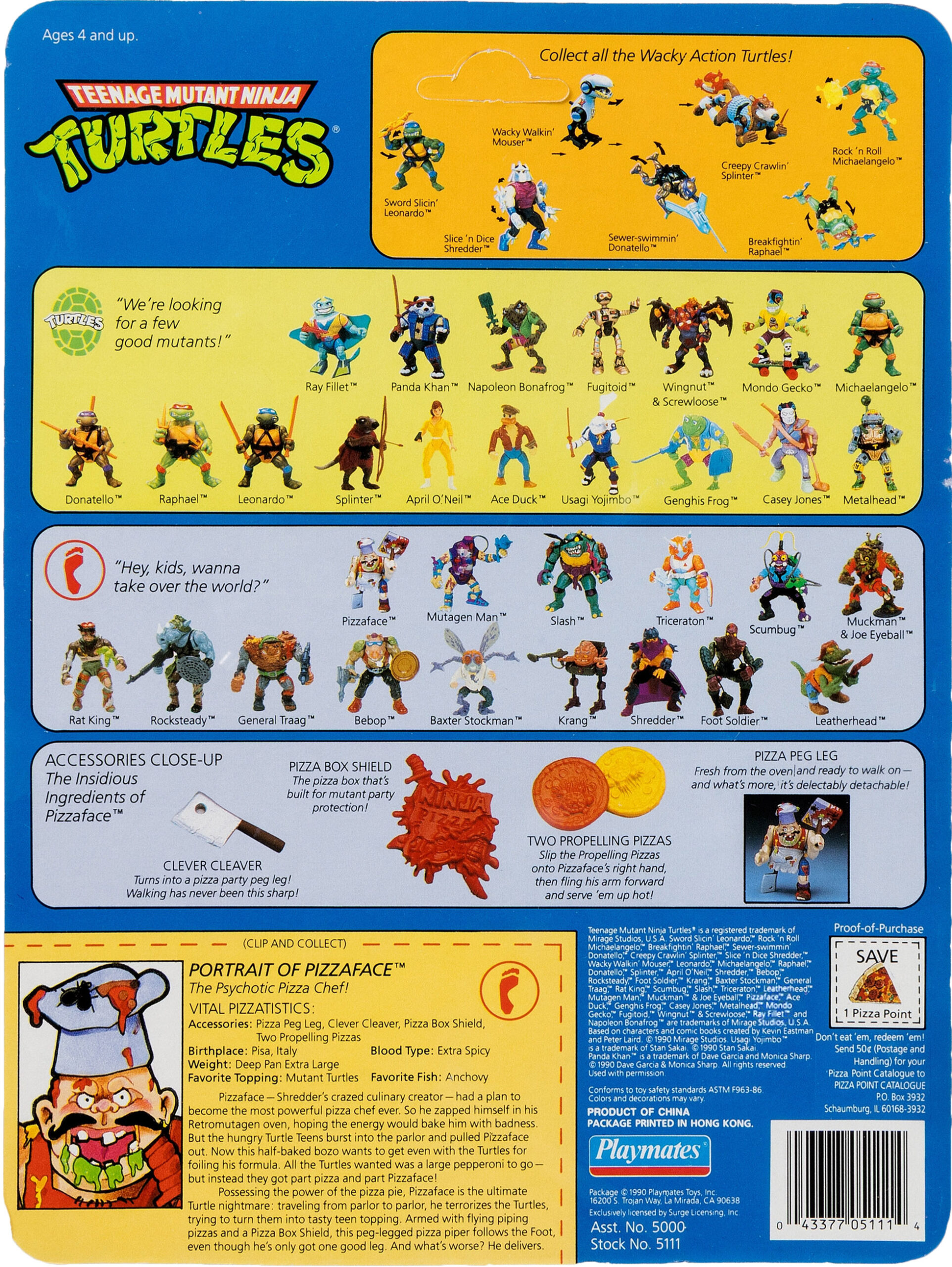 Au sein du blister, nous voyons la figurine derrière sa bulle de plastique. À l’arrière, le style du blister est également très proche de ceux de l’année précédente. Évolution de la gamme oblige, nous retrouvons sur la première édition de Pizzaface 44 figurines au dos. La gamme est complète et le style reflète la fin de l’année 1990. Le blister évoluera très légèrement pour la réédition du début de l’année suivante.