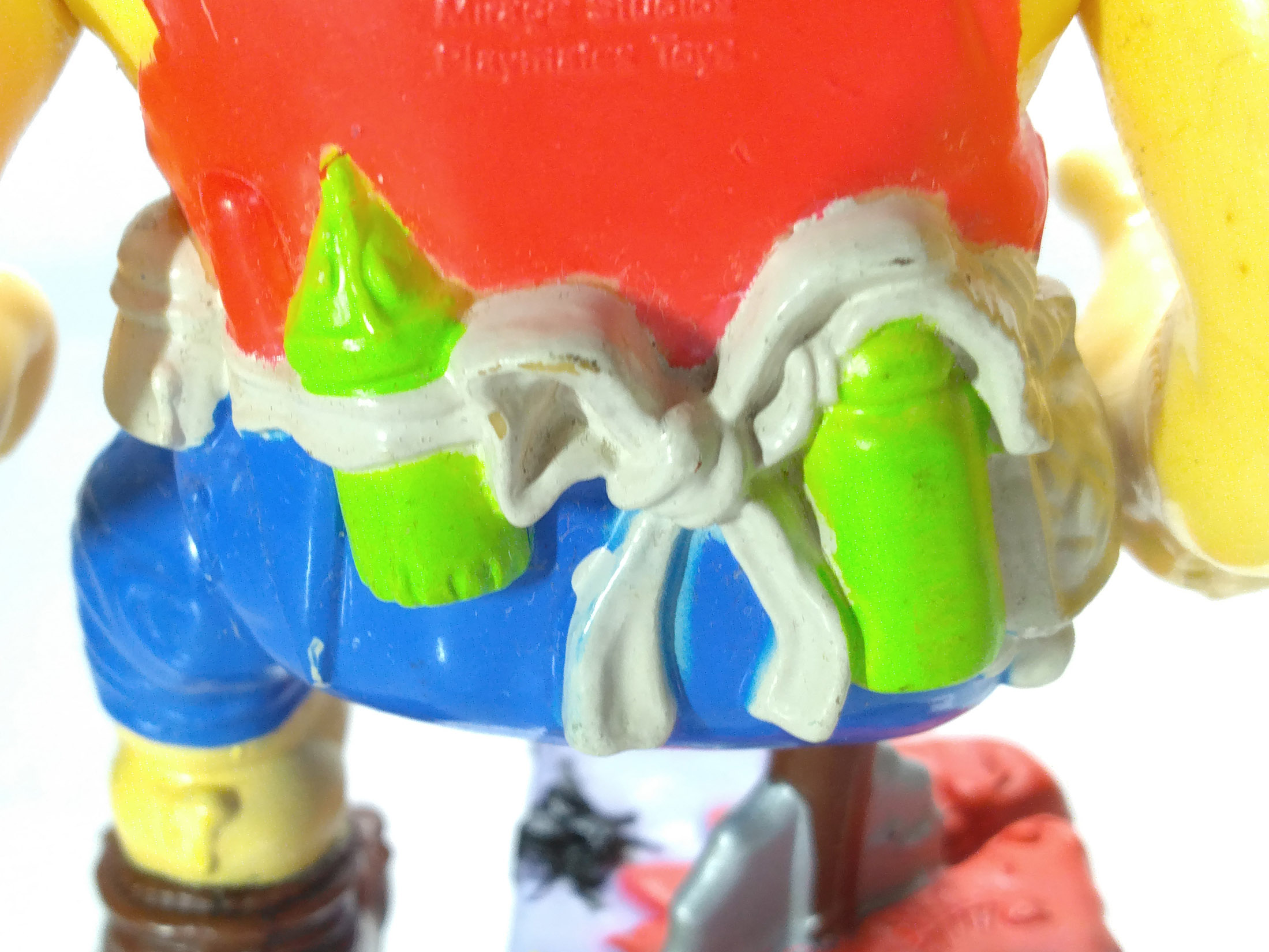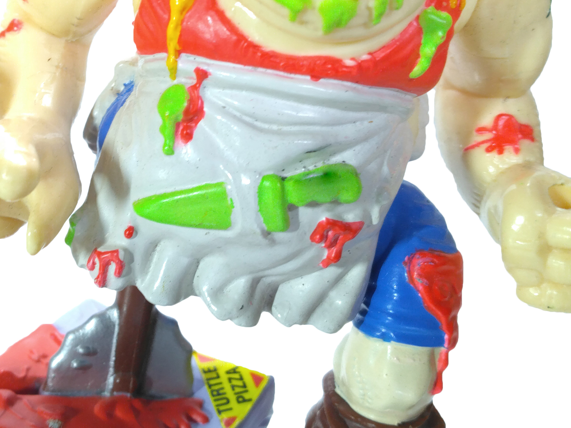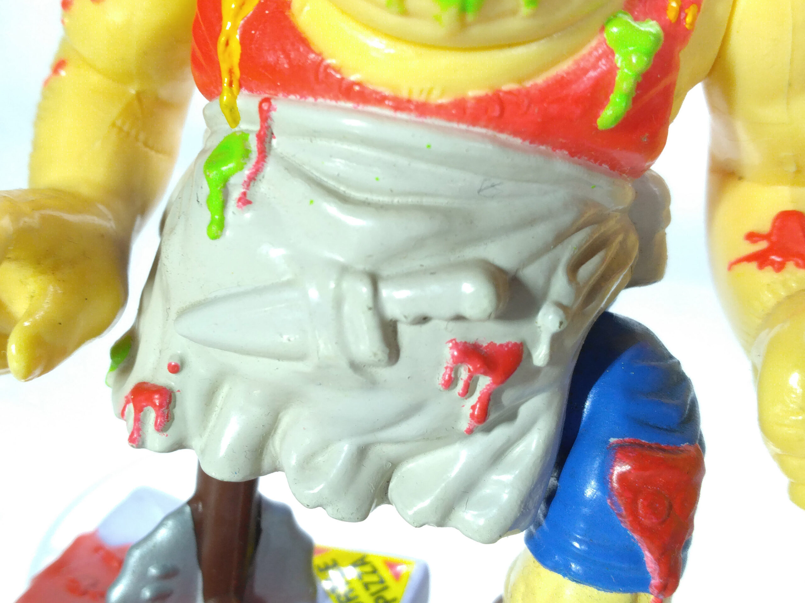 La peinture est un gros problème pour cette figurine. Si elle possède d’innombrables détails, le rendu fait vraiment très brouillon, avec des alternances de rouge et de vert (sauce tomate et mutagène) sur un personnage avec des couleurs criardes. C’est assez dommage. Au-delà de la couleur chair, il possède un vêtement rouge, un tablier blanc et un pantalon bleu. Quelques détails noirs au niveau de la moustache ou des yeux, des cafards.