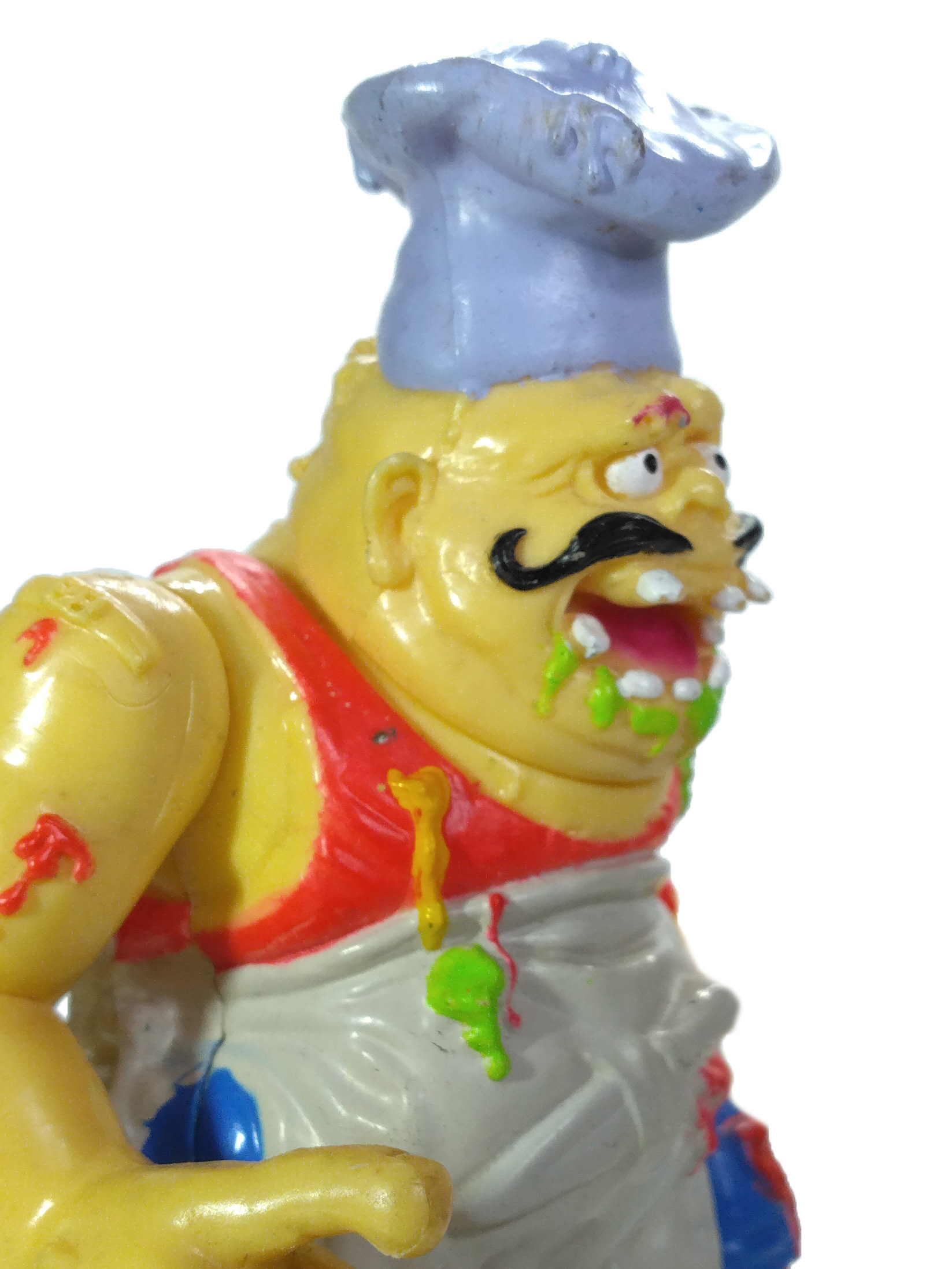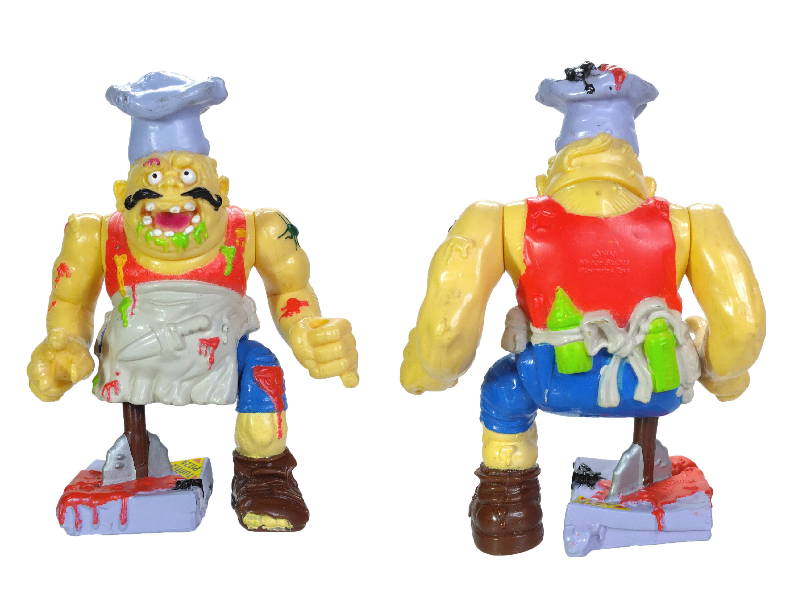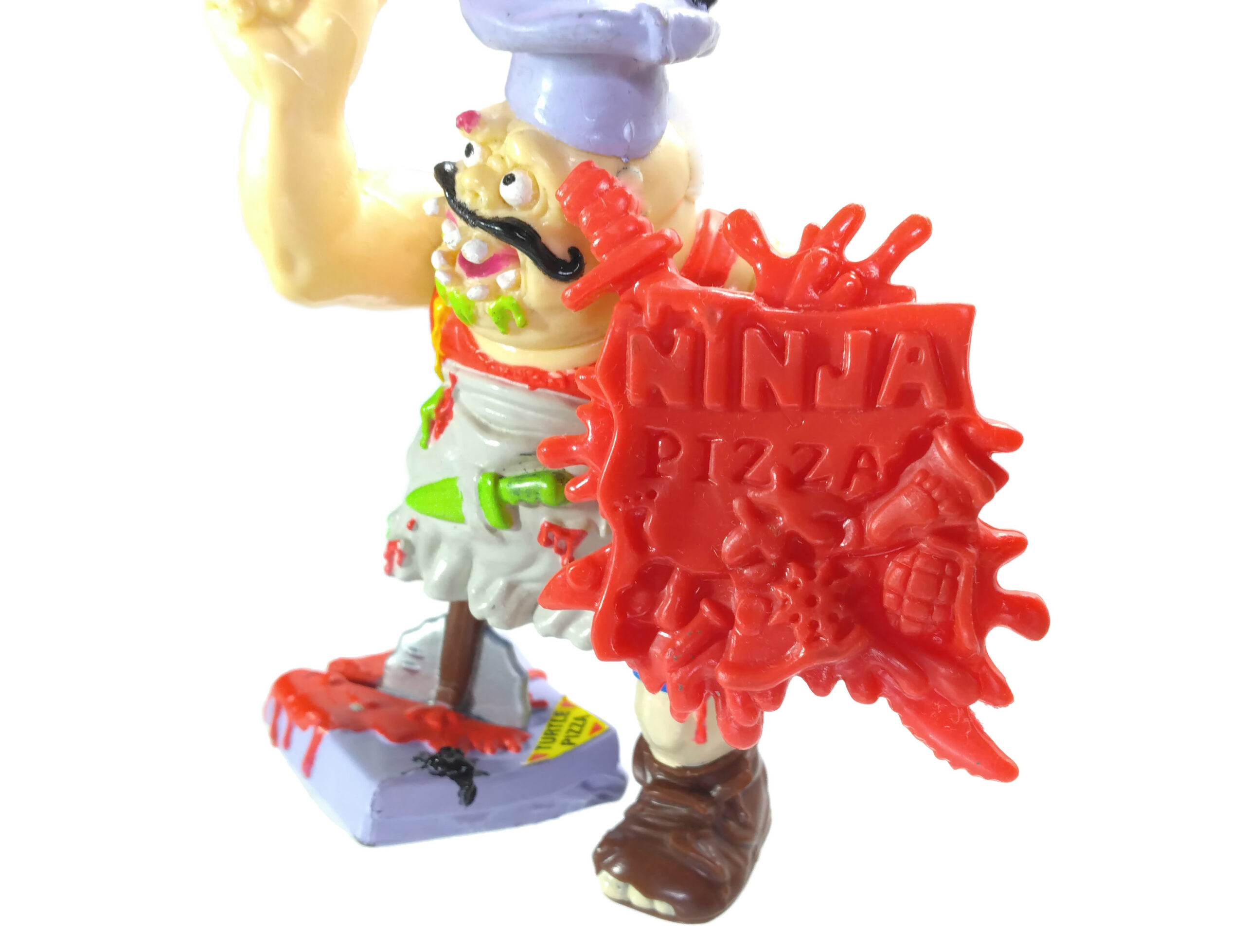 Et la couleur n’est pas le seul problème, puisque les articulations sont terriblement minimes. C’est vraiment dommage, car cette figurine aurait gagné à être moins rigide. Plus fidèle à l’idée initiale, avec cette seconde tête cachée sous la toque. Le doigt sectionné sur l’une des pizzas. Beaucoup de potentiel pour un résultat décevant.