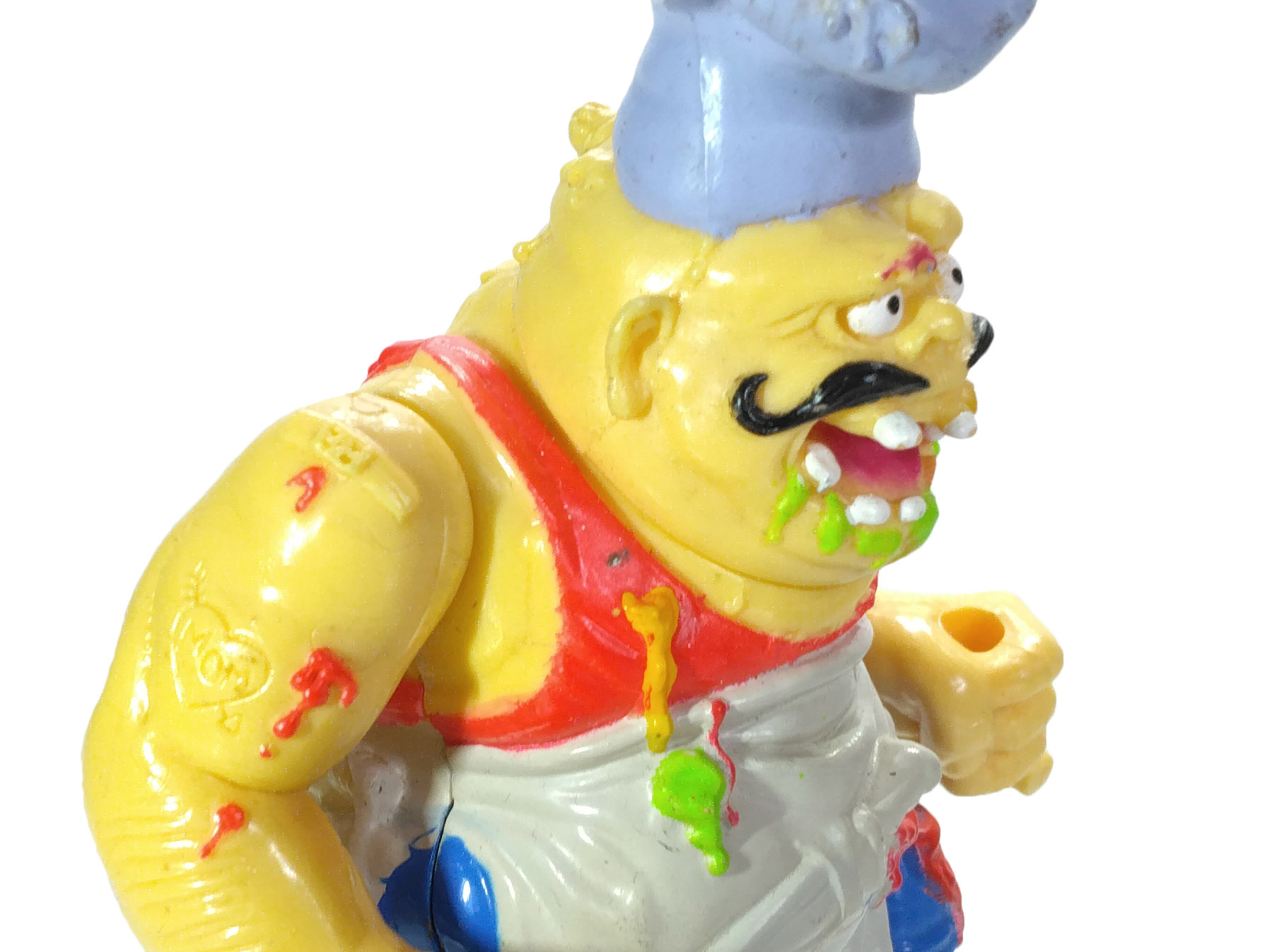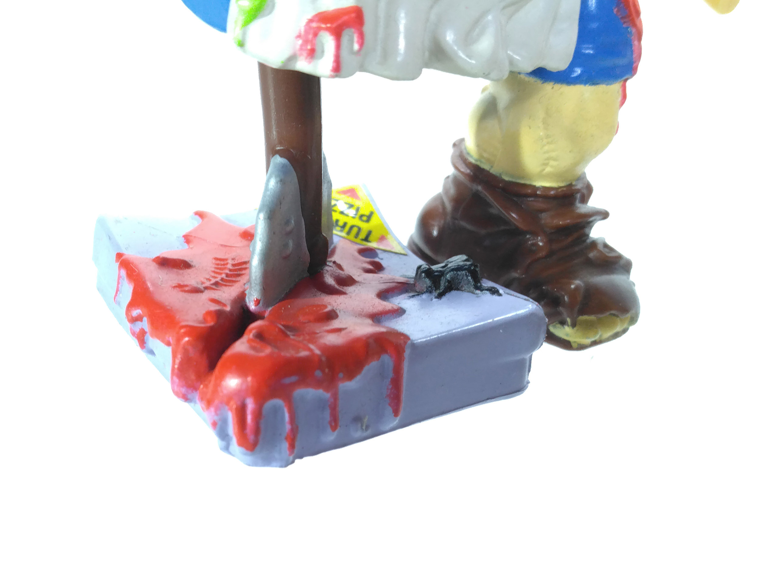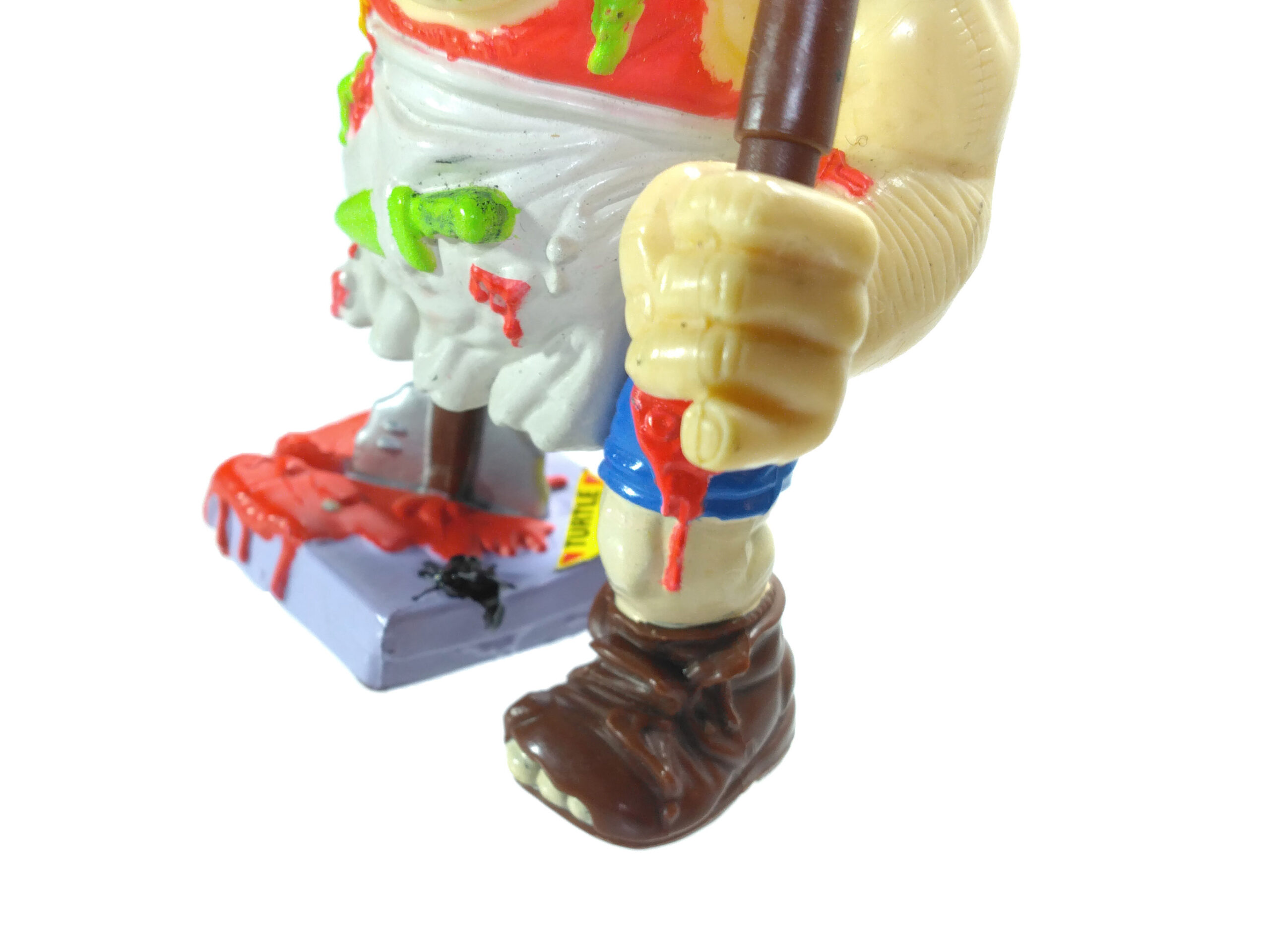 Et la couleur n’est pas le seul problème, puisque les articulations sont terriblement minimes. C’est vraiment dommage, car cette figurine aurait gagné à être moins rigide. Plus fidèle à l’idée initiale, avec cette seconde tête cachée sous la toque. Le doigt sectionné sur l’une des pizzas. Beaucoup de potentiel pour un résultat décevant.