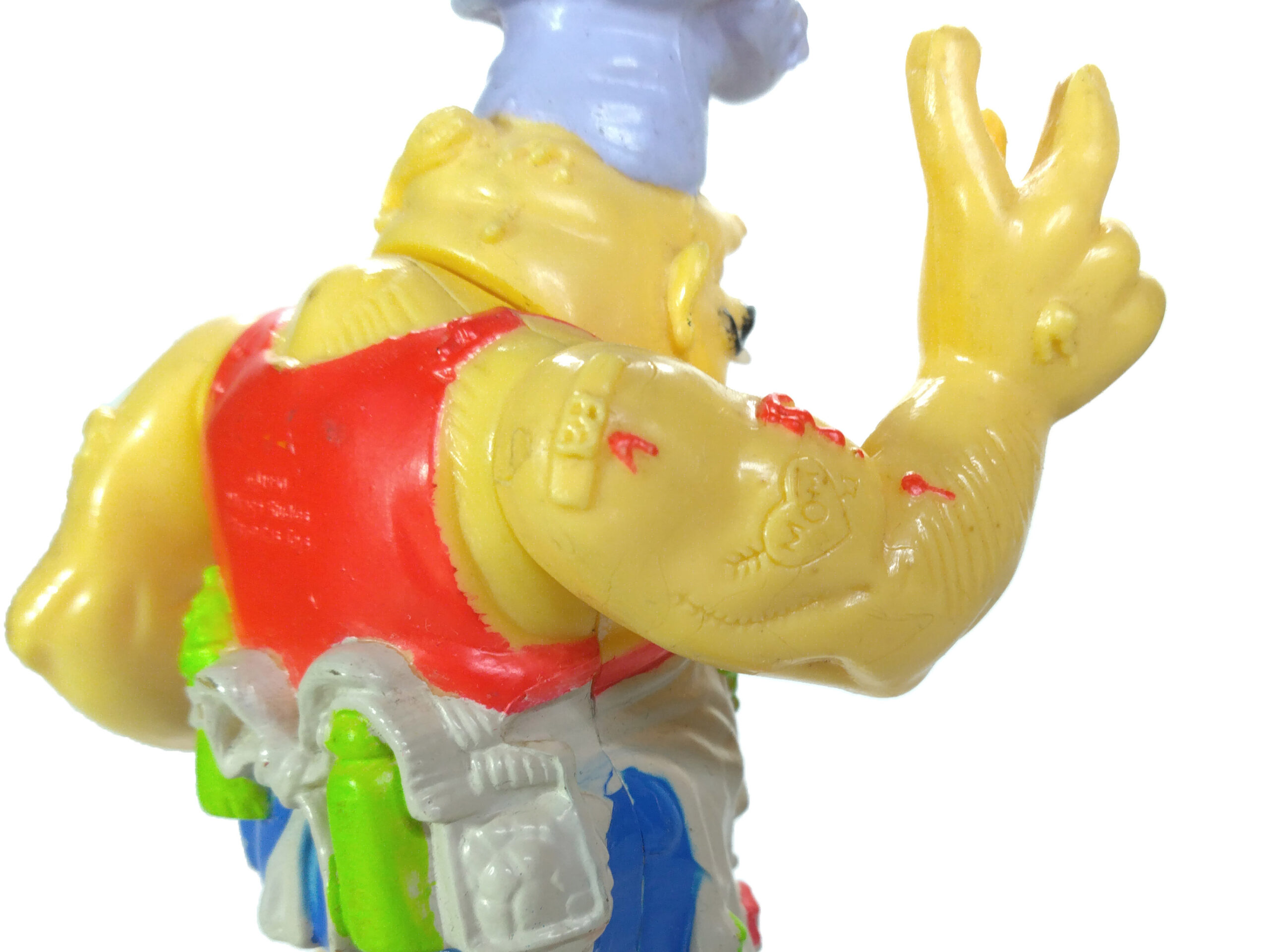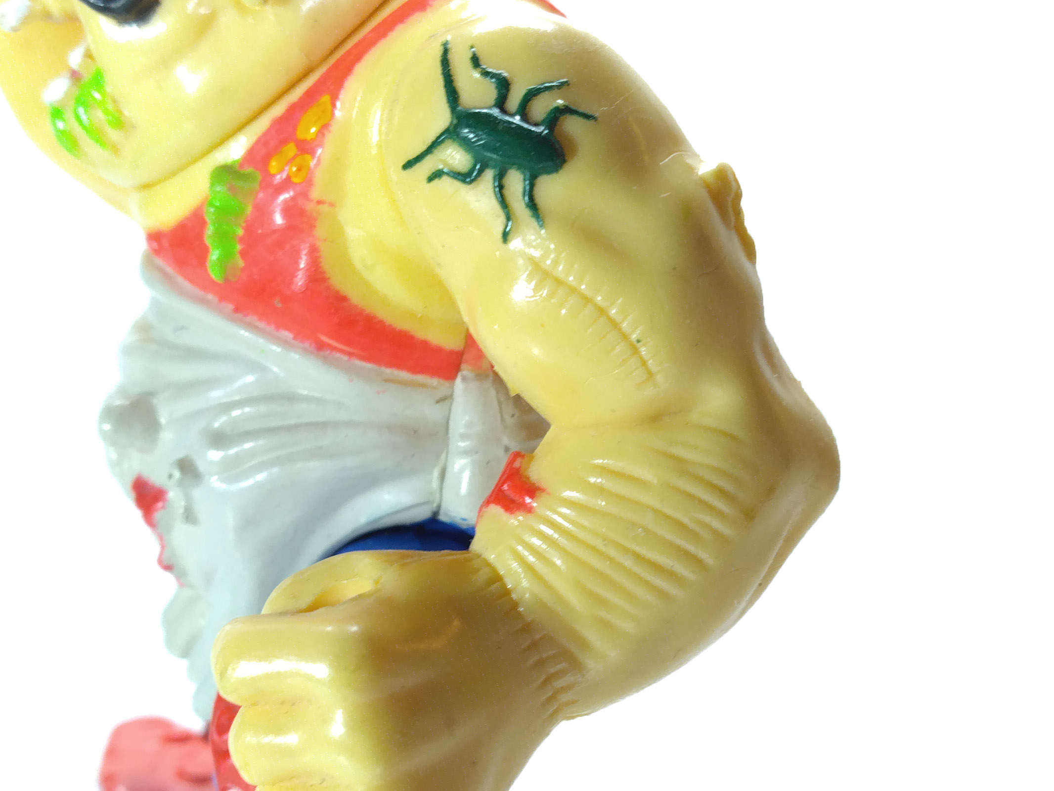 Nous possédons quelques photos de hard copies avec des études de couleurs. La première montre le personnage avec un haut jaune (Fig. 11). Ce n’est qu’après qu’il devient rouge. De la même manière, plusieurs détails étaient peints de manière plus réaliste, comme le couteau, de couleur métallisée. Finalement ce dernier n’a pas été peint, avant de passer au vert que l’on retrouve sur l’ensemble de la figurine. Là encore, une crainte d’effrayer les parents ?