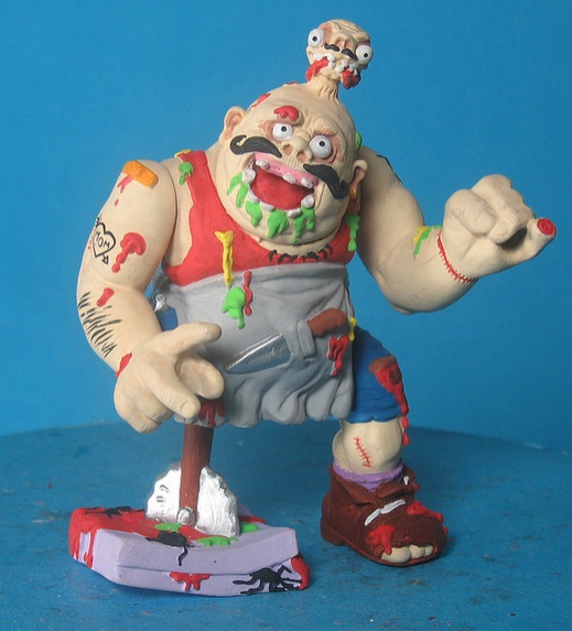 Le corps de ce personnage est en grande partie encore humain. Hélas, le pauvre bougre a perdu une jambe à la cuisine. Ses bras sont forts, avec quelques incisions pour marquer les poils. Mais surtout de nombreuses cicatrices. Il ne s’est pas raté ! Le poignet et un doigt sectionnés à gauche, une plaie à la jambe gauche, au bras droit… Et surtout, il n’a pas une gueule de porte bonheur. Le visage est très travaillé au niveau de l’expression, avec cette bouche ouverte, le nez retroussé, le regard écarquillé. La toque est bien moulée avec la tête et ne peut être ôtée.