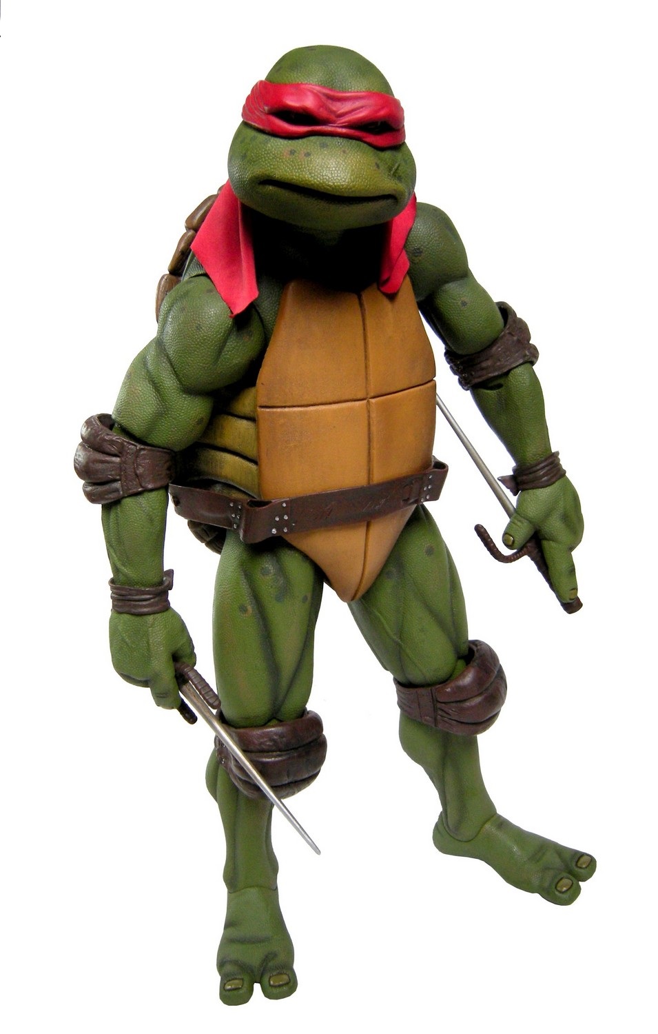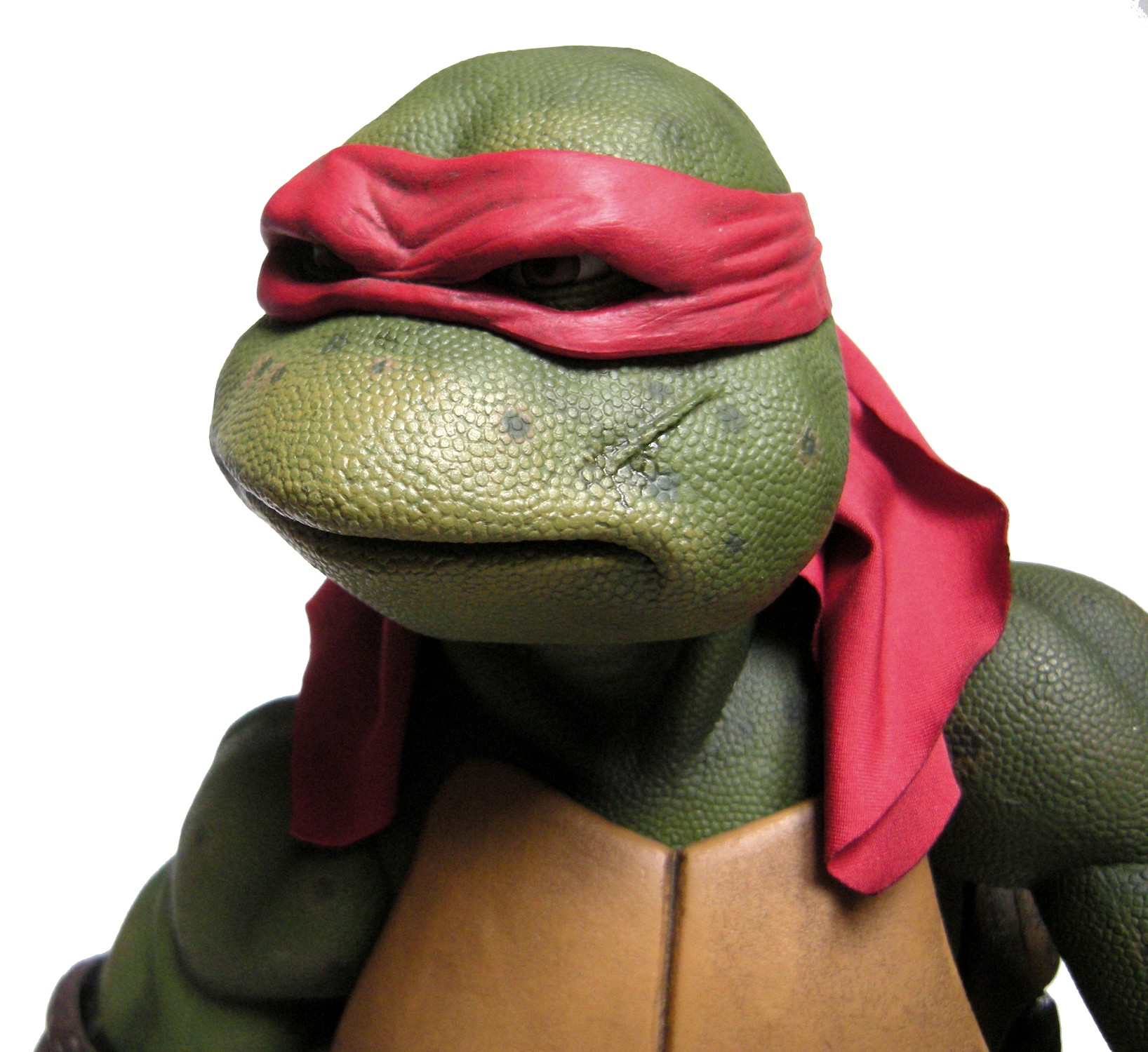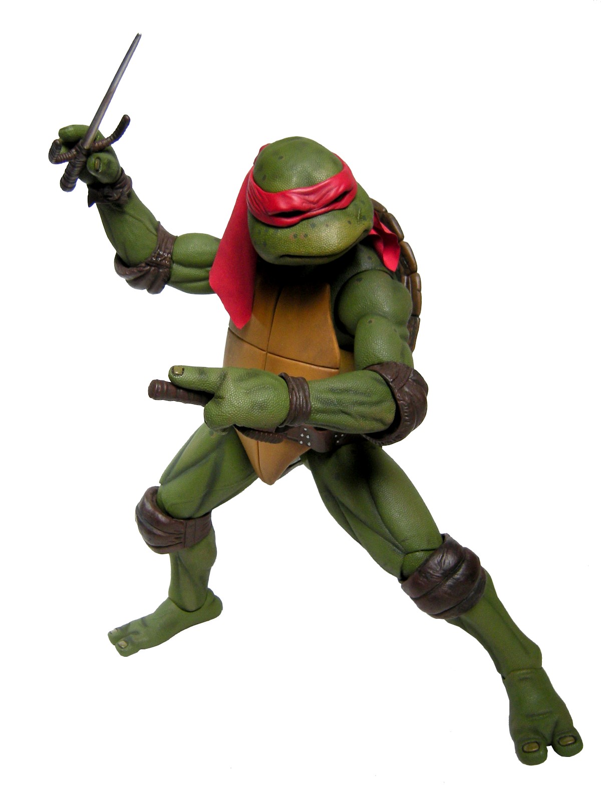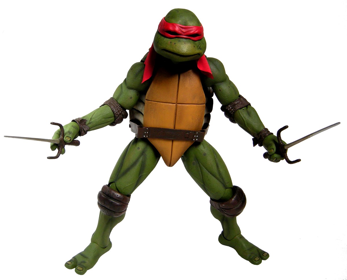 Raphael mesure 42 cm de haut. Cette dimension, si imposante, vient du fait que NECA n’a pas une liberté totale sur sa production de figurines de la licence TMNT. C’était déjà en partie ce qui leur avait fait arrêter en 2009. Dans le contrat signé en 2015 avec Nickelodeon, il est stipulé qu’ils ne peuvent vendre des figurines en dehors des États-Unis et que celles-ci ne peuvent être à l’échelle 7″, en dehors de produits réservés exclusivement aux grands salons, comme le pack de quatre tortues de ce même film, sorti en juillet 2018 à l’occasion du San Diego Comic Con et qui reprennent à l’exactitude ces figurines de 42 cm, à plus petite échelle. Avec l’assouplissement de cet accord, les figurines 7″ purent être vendues aux États-Unis en exclusivité chez Gamestop à partir de septembre 2018, puis à l’automne 2019 en France.