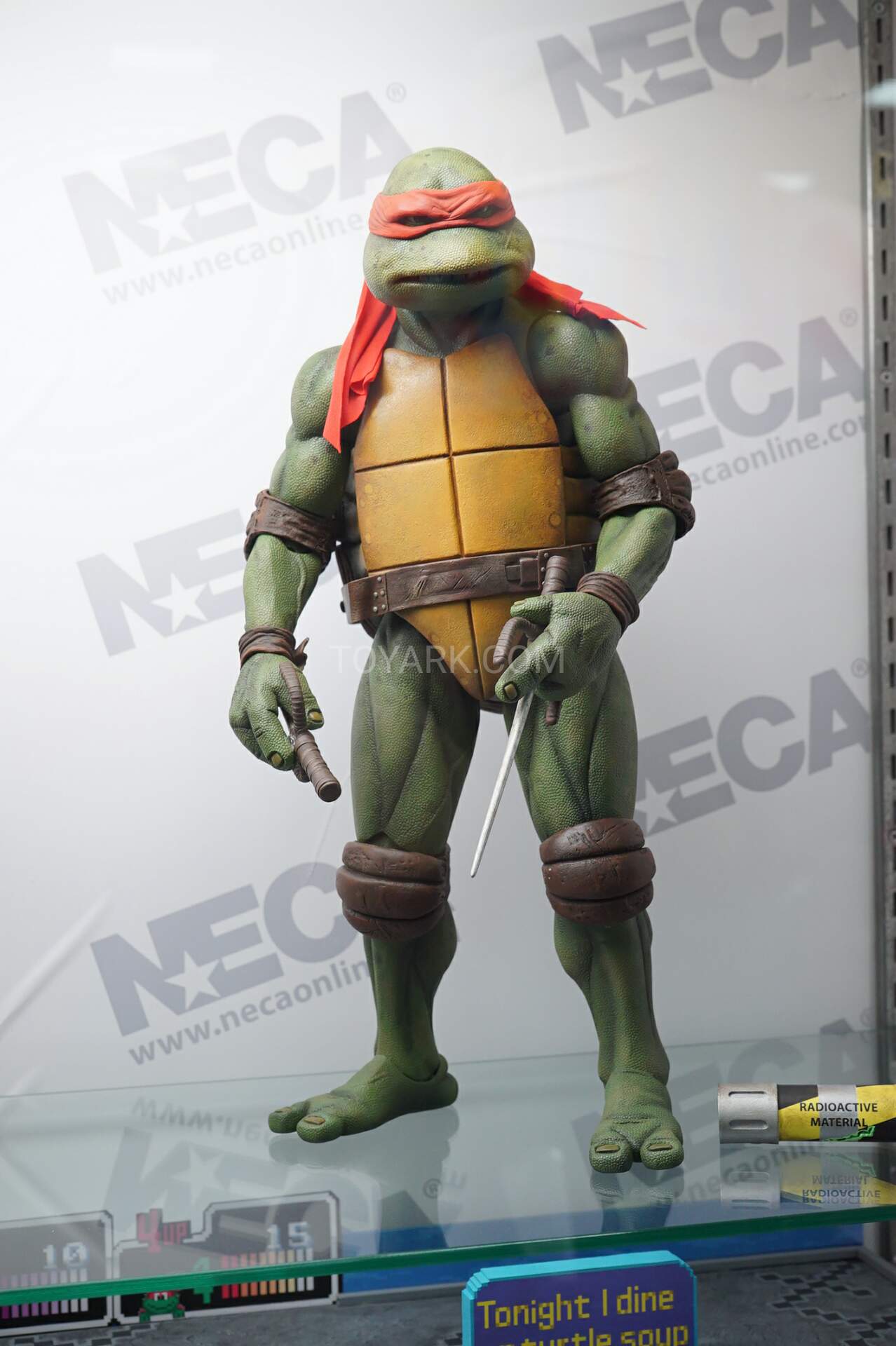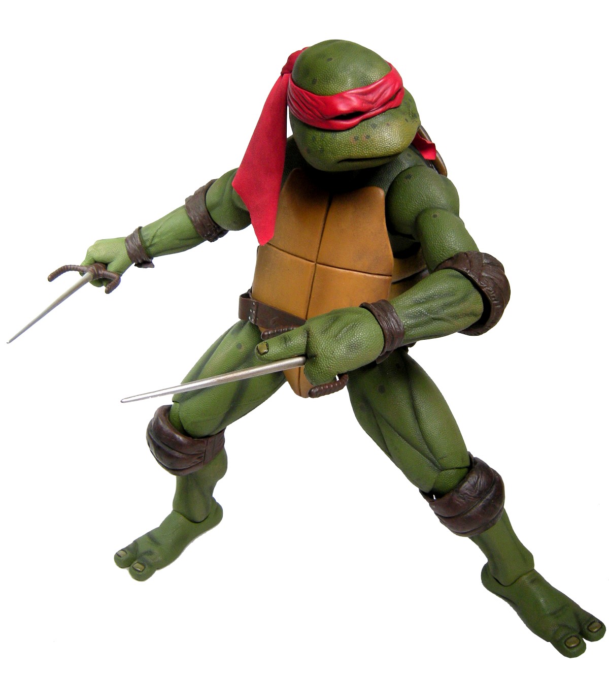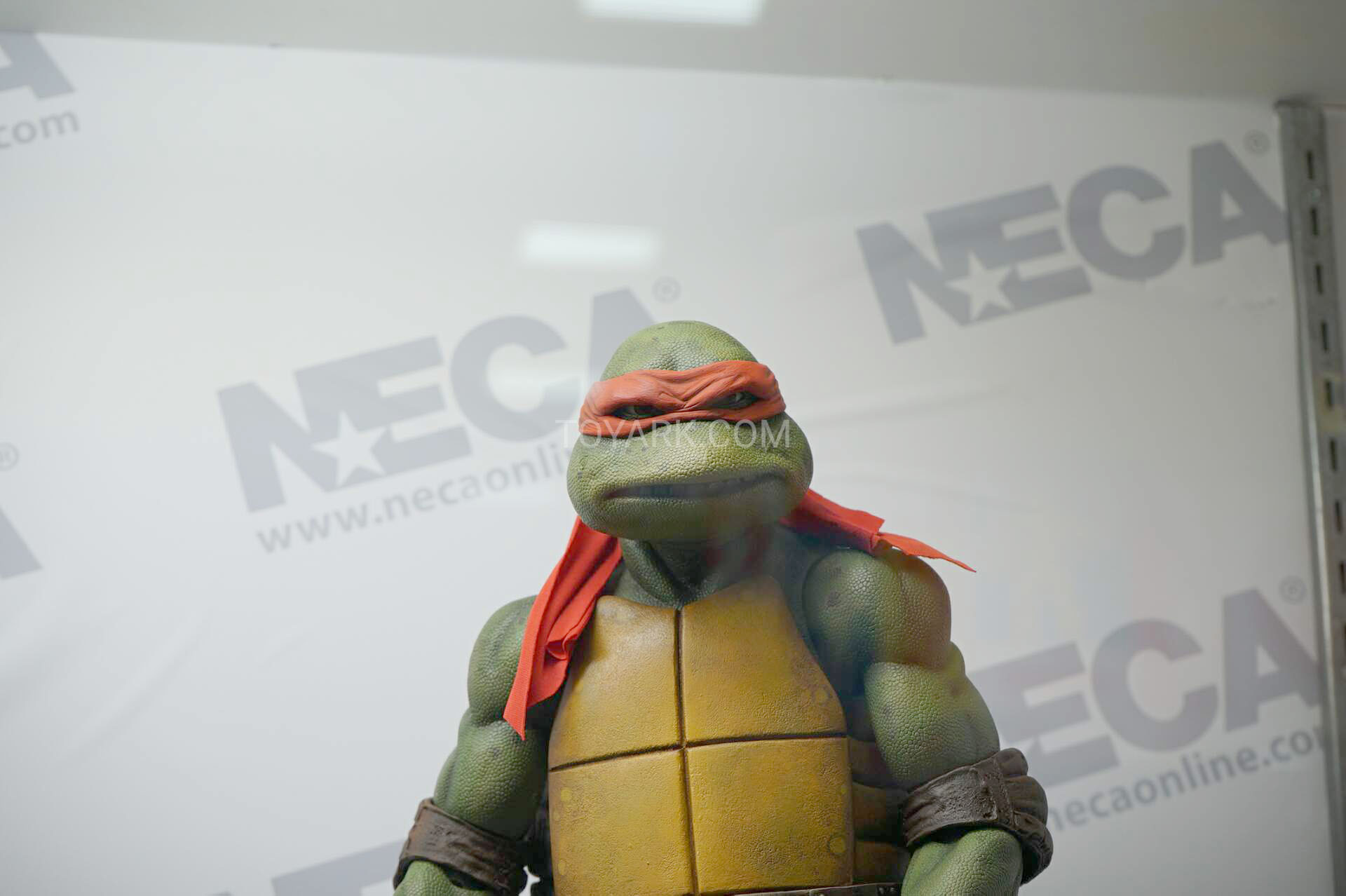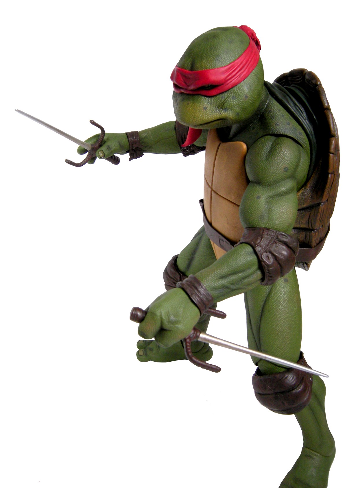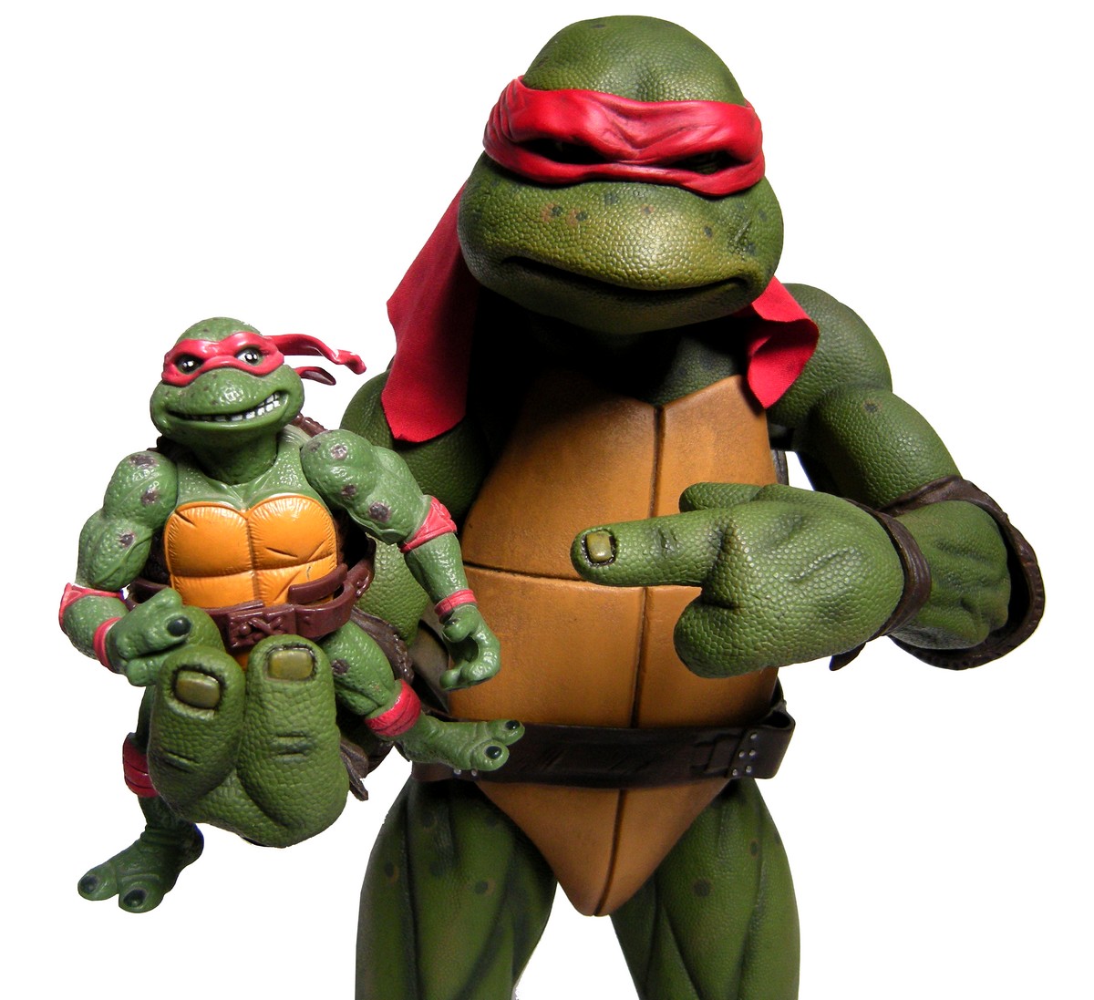 Raphael mesure 42 cm de haut. Cette dimension, si imposante, vient du fait que NECA n’a pas une liberté totale sur sa production de figurines de la licence TMNT. C’était déjà en partie ce qui leur avait fait arrêter en 2009. Dans le contrat signé en 2015 avec Nickelodeon, il est stipulé qu’ils ne peuvent vendre des figurines en dehors des États-Unis et que celles-ci ne peuvent être à l’échelle 7″, en dehors de produits réservés exclusivement aux grands salons, comme le pack de quatre tortues de ce même film, sorti en juillet 2018 à l’occasion du San Diego Comic Con et qui reprennent à l’exactitude ces figurines de 42 cm, à plus petite échelle. Avec l’assouplissement de cet accord, les figurines 7″ purent être vendues aux États-Unis en exclusivité chez Gamestop à partir de septembre 2018, puis à l’automne 2019 en France.