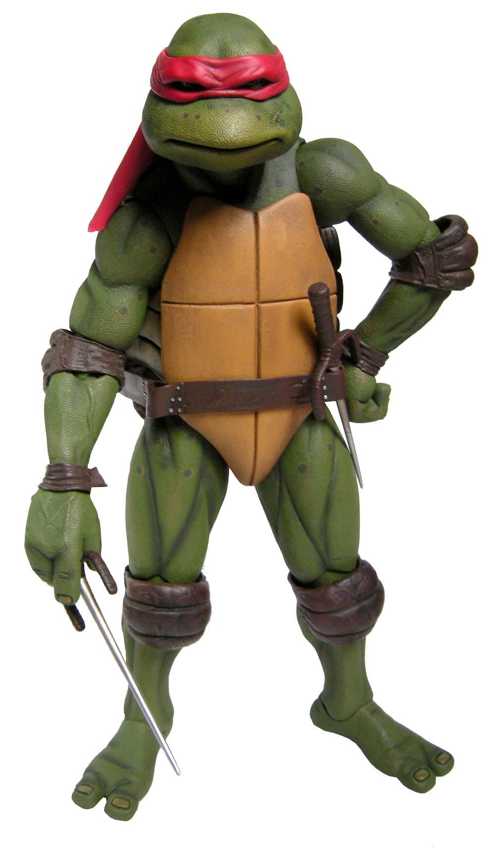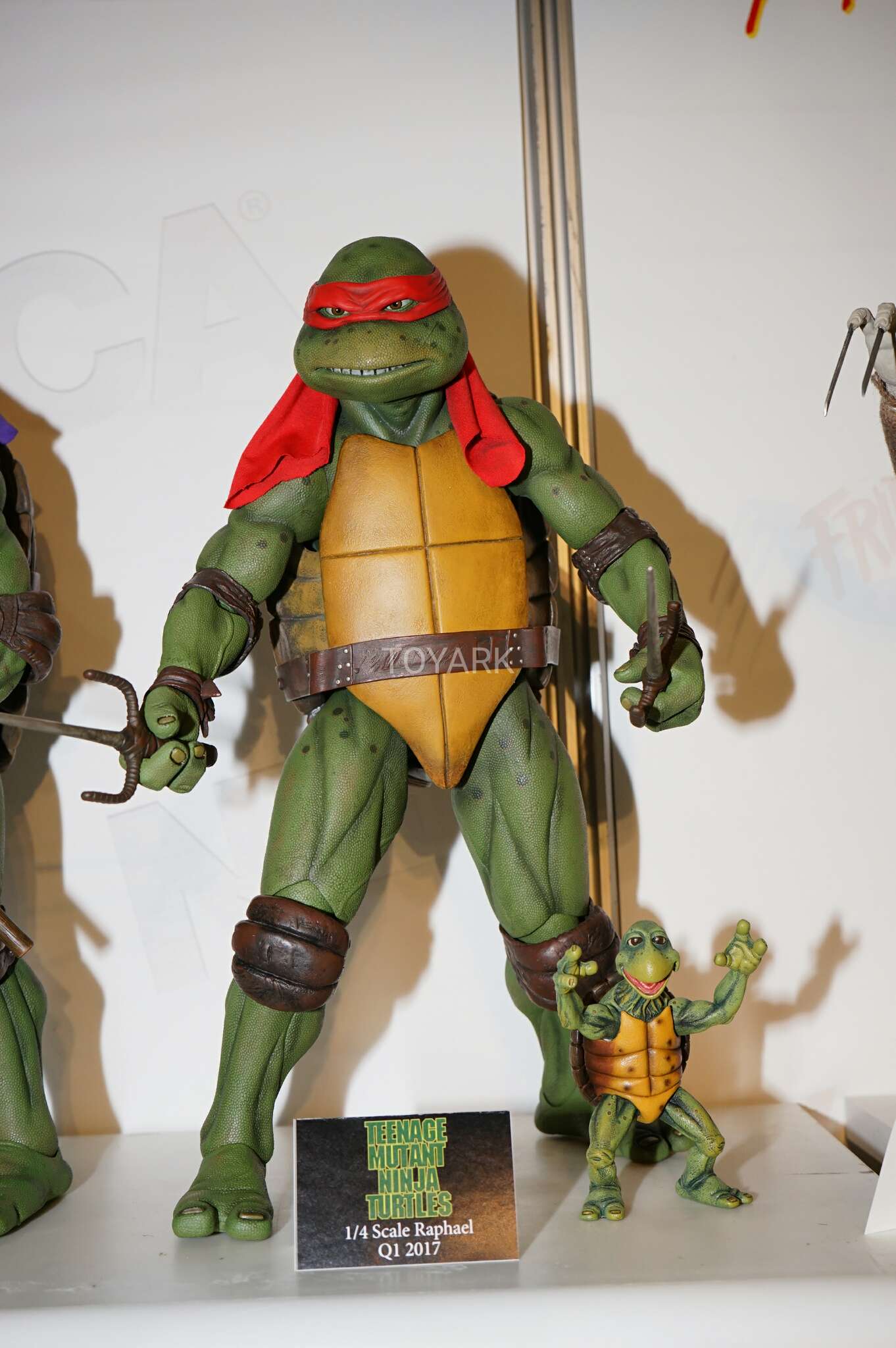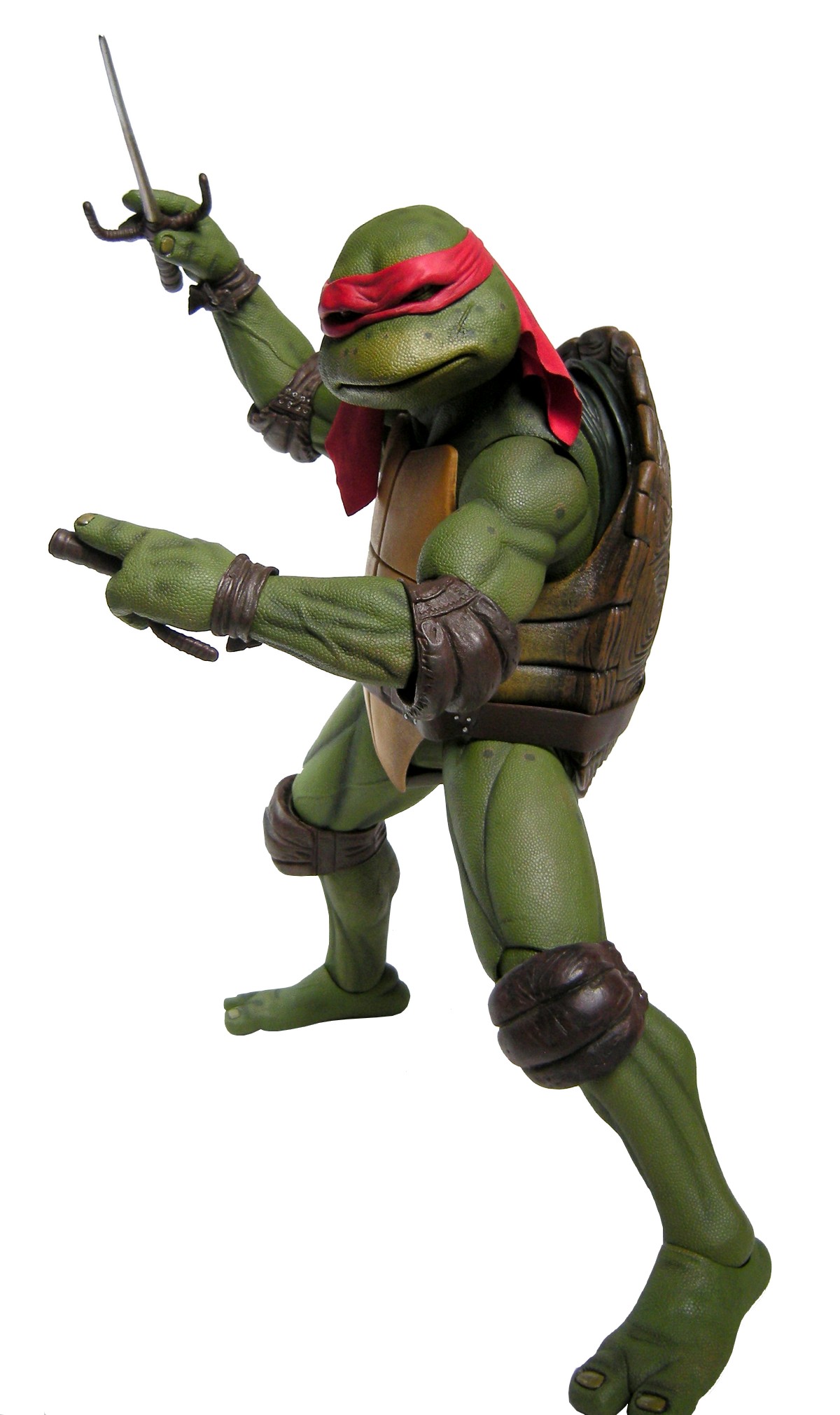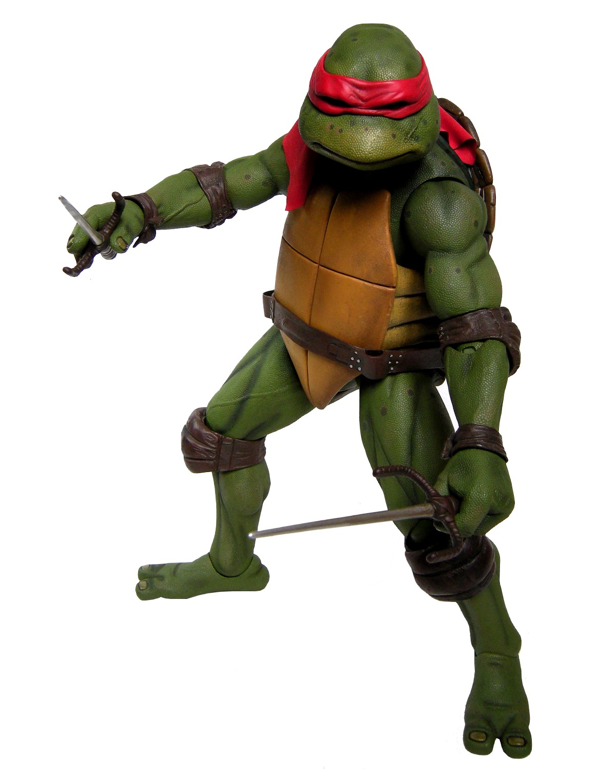 Raphael mesure 42 cm de haut. Cette dimension, si imposante, vient du fait que NECA n’a pas une liberté totale sur sa production de figurines de la licence TMNT. C’était déjà en partie ce qui leur avait fait arrêter en 2009. Dans le contrat signé en 2015 avec Nickelodeon, il est stipulé qu’ils ne peuvent vendre des figurines en dehors des États-Unis et que celles-ci ne peuvent être à l’échelle 7″, en dehors de produits réservés exclusivement aux grands salons, comme le pack de quatre tortues de ce même film, sorti en juillet 2018 à l’occasion du San Diego Comic Con et qui reprennent à l’exactitude ces figurines de 42 cm, à plus petite échelle. Avec l’assouplissement de cet accord, les figurines 7″ purent être vendues aux États-Unis en exclusivité chez Gamestop à partir de septembre 2018, puis à l’automne 2019 en France.