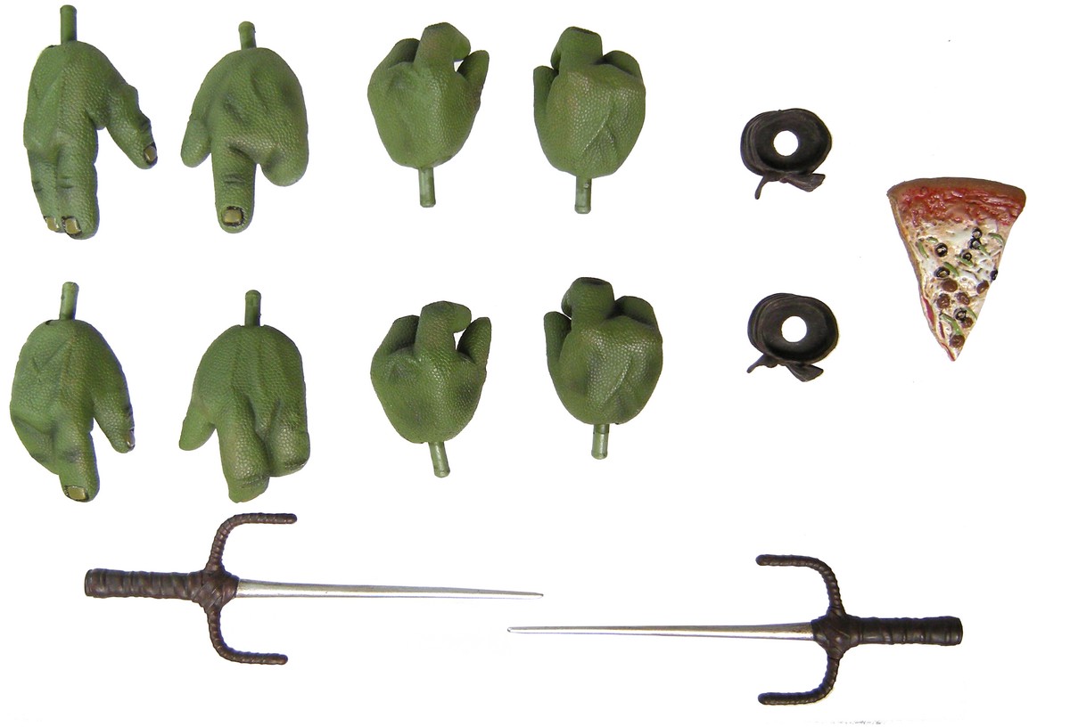 Raphael est accompagné de huit mains (quatre paires), une part de pizza et sa paire de saïs. À cela, on peut éventuellement rajouter ses deux bracelets, amovibles lorsque l’on change les mains de la tortue.