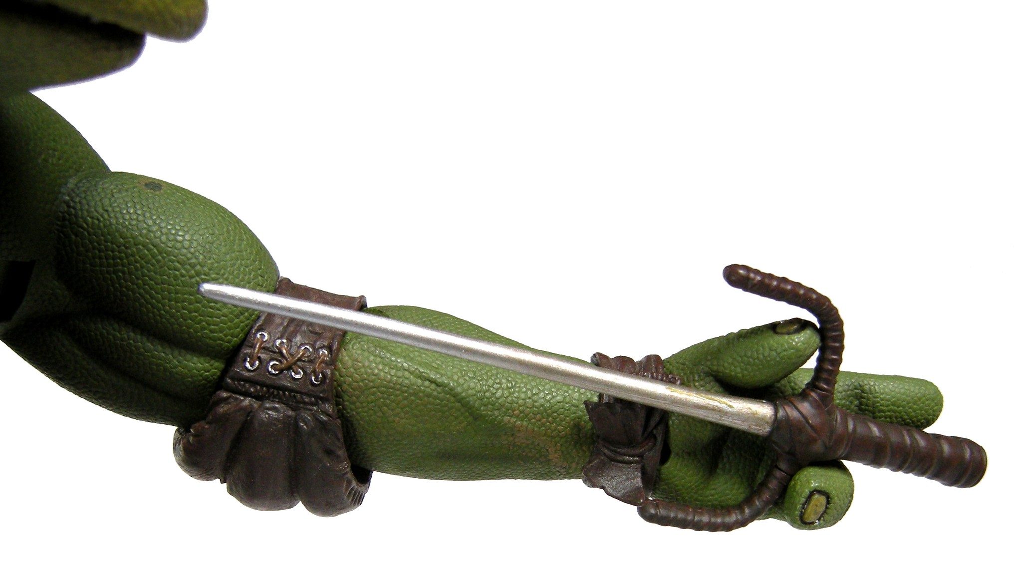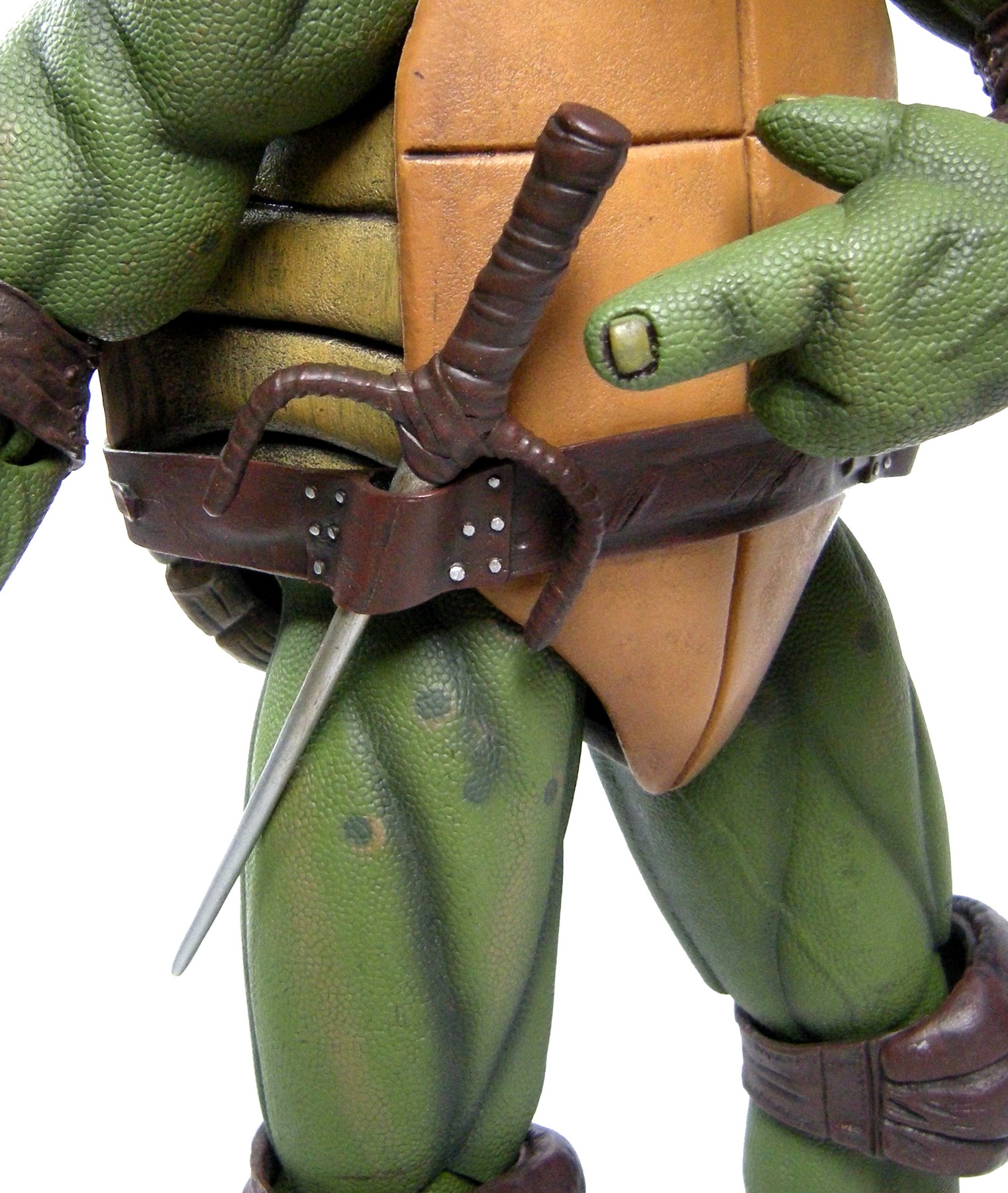 La ceinture, également en plastique, est retenue à la carapace et au plastron par deux points de colle. Très fine, elle est parsemée de détails, comme les lanières qui la longent. La lanière à l’avant de la figurine retient tout particulièrement l’attention. Visible au niveau de l’attache de saï à la gauche de la tortue, on peut facilement la deviner passant derrière la ceinture par un habile relief estompé par l’usure du cuir et quelques jeux de luminosité renforcés par la peinture. On y retrouve également quelques usures, qui avec des effets de pliages, renforcent le réalisme.