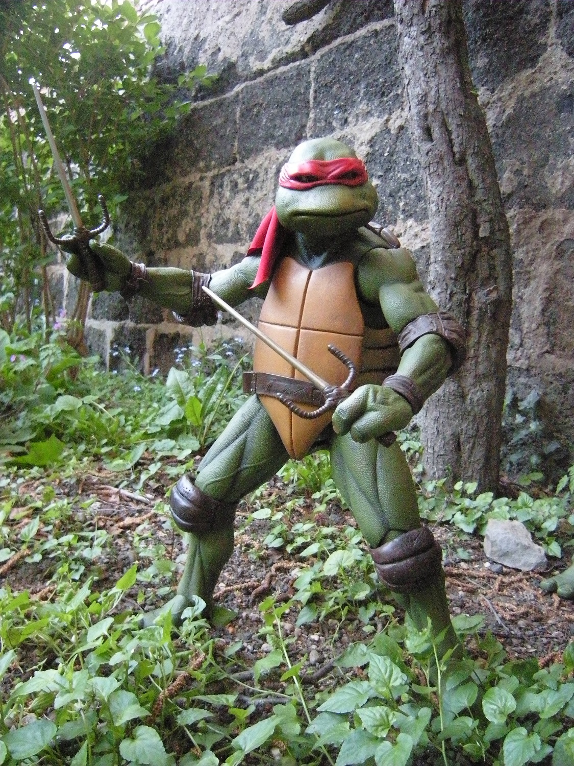 Les yeux de Raphael peuvent, sur certains modèles, présenter un léger strabisme. Rien de comparable cependant à la gamme Classic collection de Playmates, rassurez-vous ! Ses yeux sont détaillés avec un iris brun et une pupille noire. Contrairement au Donatello, il ne semble pas qu’un vernis ait été utilisé pour rendre les pupilles plus brillantes.