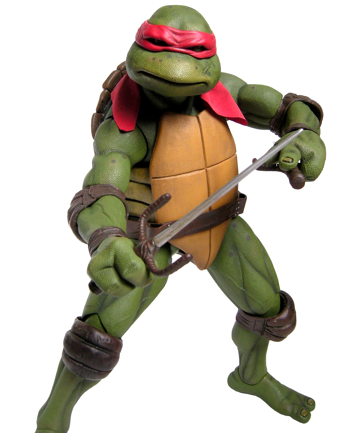 Les équipements de Raphael sont bruns foncé de base. La couleur du plastique naturel peut être vue au revers de la ceinture, non peinte. De nombreuses couches de peintures se succèdent sur ces parties afin d’offrir le réalisme adéquat au cuir, variant les teintes brunes plus claires et légèrement rouges. Le travail de la ceinture est très différent de celui de Donatello, où quelques touches claires venaient gâcher le naturel apporté au cuir. Ici, seules quelques nuances suffisent pour donner tout son réalisme à la lanière de cuir.