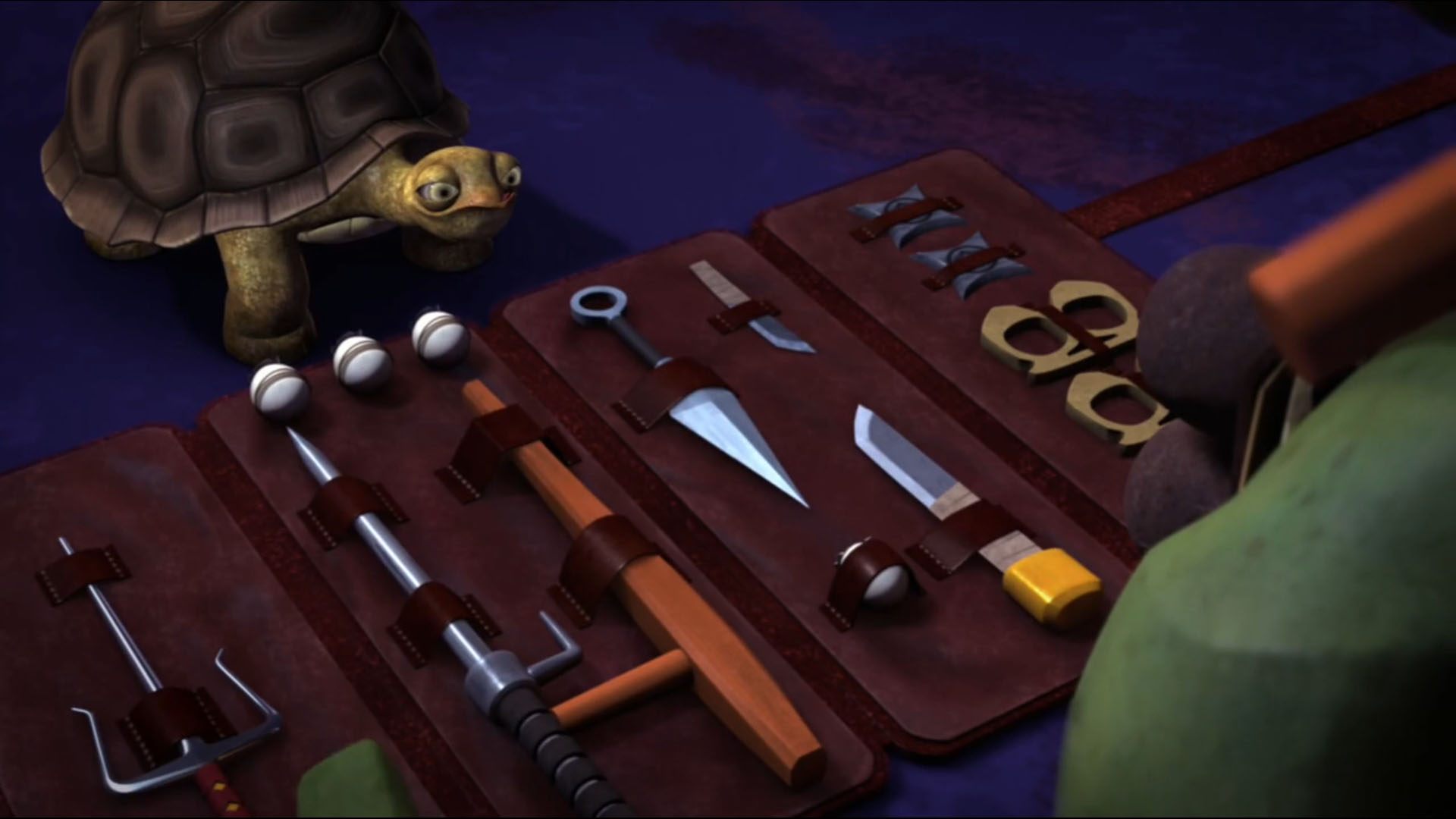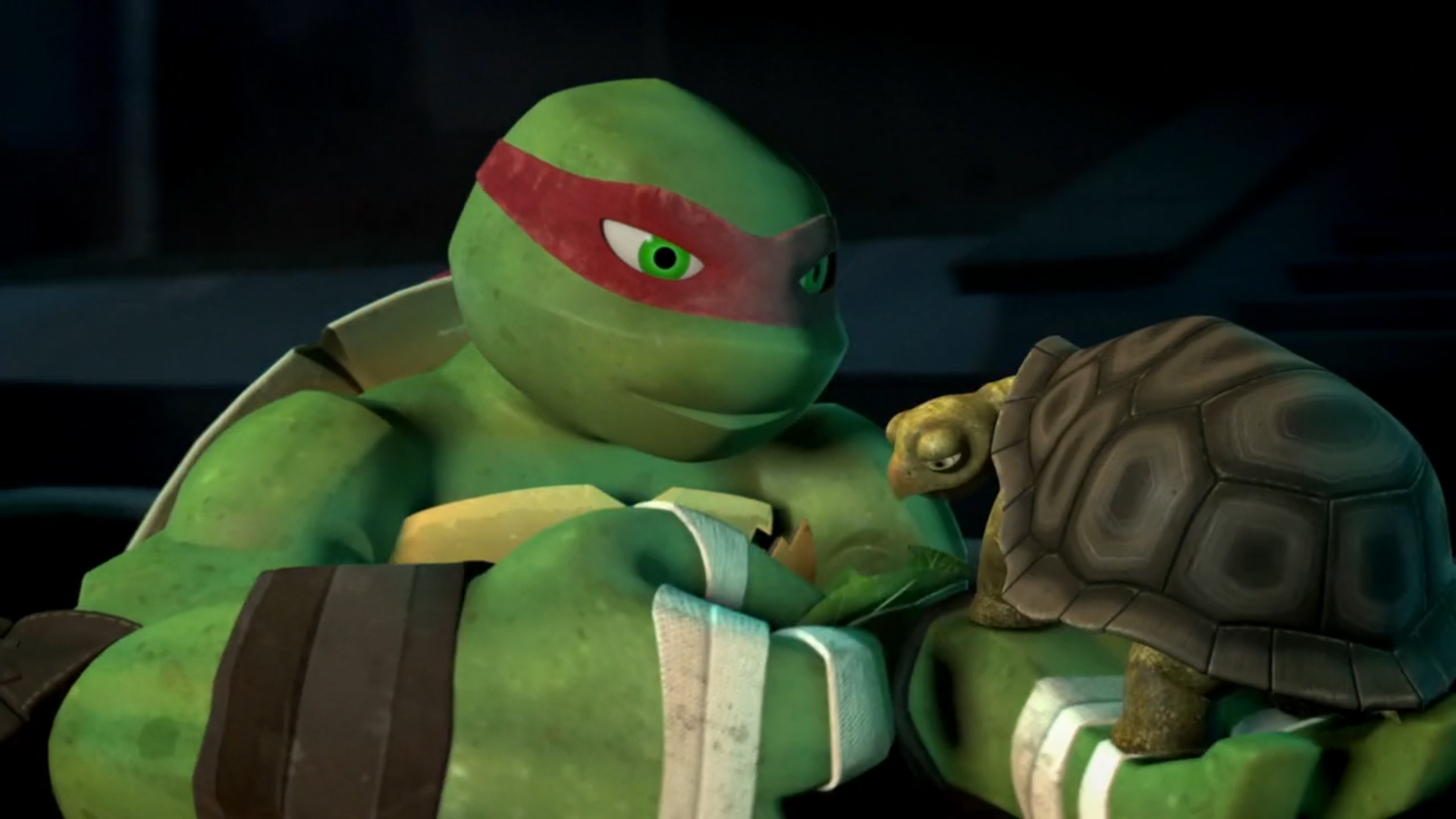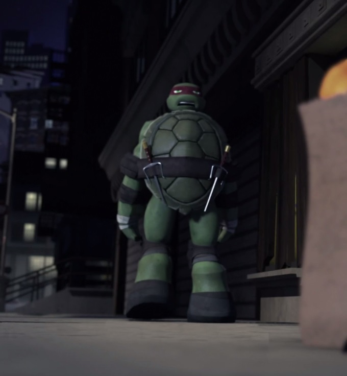 - Le plastron et la carapace de Raphael son égratignés à un même endroit. Une histoire sur son passé au cours de la saison 3 devrait expliquer ce qu’il s’était produit. Ce n’est finalement qu’au cours de l’épisode Il était une fois Splinter et les tortues… (S5 E5) que cette aventure est racontée. C’est en dévalant des escaliers dans un caddie que Raphael s’est blessé, alors que Splinter essayait d’échapper à des kraangs.