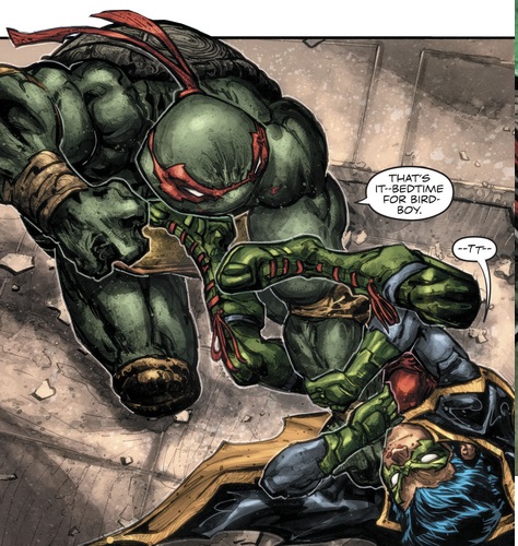 Après être parvenus à vaincre Shredder et s’apprêtant à retourner dans leur dimension, les tortues firent leurs adieux à Batman. Raphael reconnut qu’ils avaient lutté aux côtés d’un grand guerrier (Batman / TMNT, part. 6).
