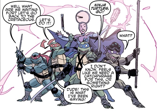Peu après, les tortues firent la connaissance d’une Lita venue du futur. Celle-ci leur apportait de mauvaises nouvelles, et notamment une fracture au sein de leur famille après que Jennika ait tué Karai pour se venger. Raphael était particulièrement touché par son devenir, puisqu’il perdrait Alopex (TMNT (Vol. 5) #113). Inquiet de ces nouvelles, le ninja alla jusqu’à demander à Lita si Hob paierait pour ce qu’il avait fait aux humains touchés par sa bombe ou si son comportement changerait à l’avenir. Le silence de la tortue en dit long sur l’avenir (TMNT (Vol. 5) #116).