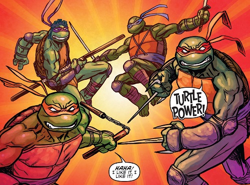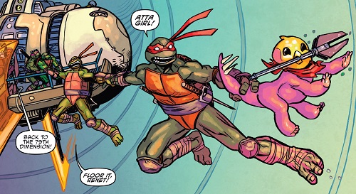Une fois à l’extérieur, la tortue demanda à Harold Lillja d’ouvrir un portail en direction de Mutant Island pour ses amis. Il avait également retrouvé Pepperoni dans les couloirs du hangar dans lequel ils étaient retenus et leur demandait de la garder avec eux le temps qu’il termine son road trip. Reprenant sa moto, la tortue poursuivit sa route vers Las Vegas (Mutant Nation #4).