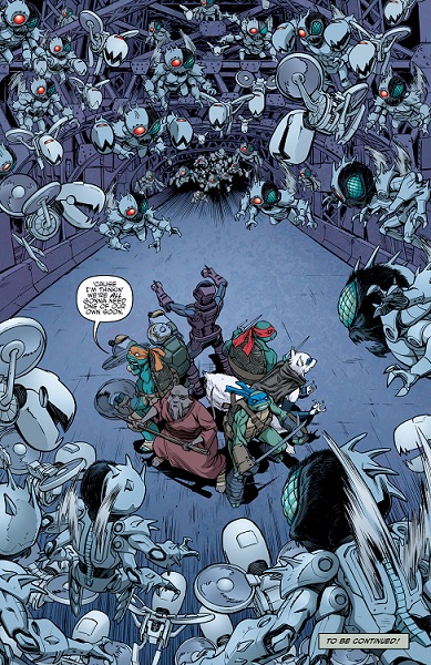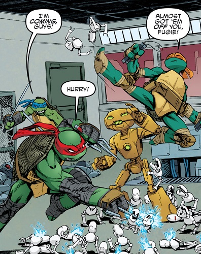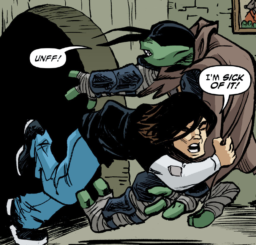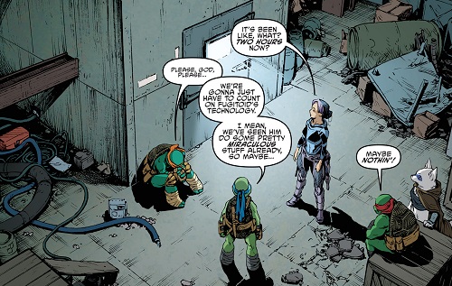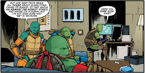 Donatello, toujours enfermé dans son laboratoire, agaçait ses frères. Raphael, qui était resté jusque-là en retrait et abattu de sa dispute avec Alopex, intervint et accusa son frère de ne pas vouloir les aider à retrouver la belette. Le génie de l’équipe refusait de parler d’Armaggon tant qu’il n’en savait pas plus. Mais n’acceptait pas ces accusation et poussa violemment Raphael, entraînant une dispute généralisée. Les tortues avaient passées un cap dans leurs agacements mutuels. Finalement, Donatello acceptait de leur en dire plus.