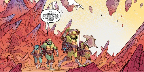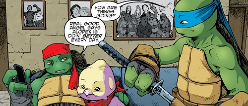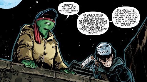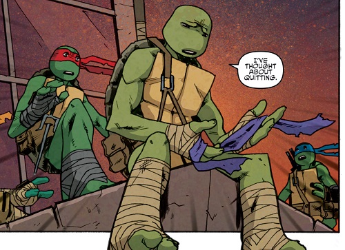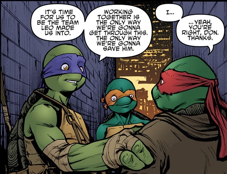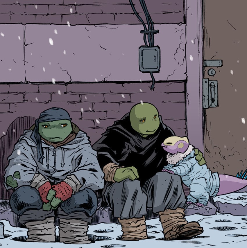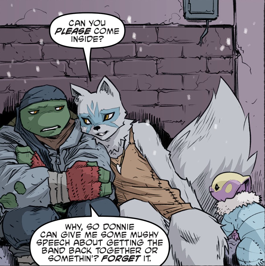 Les semaines suivantes, Leonardo menait toujours ses frères dans des patrouilles à travers les rues. Mais personne n’était réellement concentré. Raphael était surtout préoccupé à l’idée de renouer le lien avec Alopex, déçue de l’avoir vu revenir vers ses anciens ennemis, Saki (TMNT #131) et Old Hob (TMNT #135). Elle refusait toute communication.