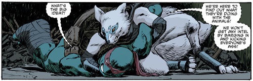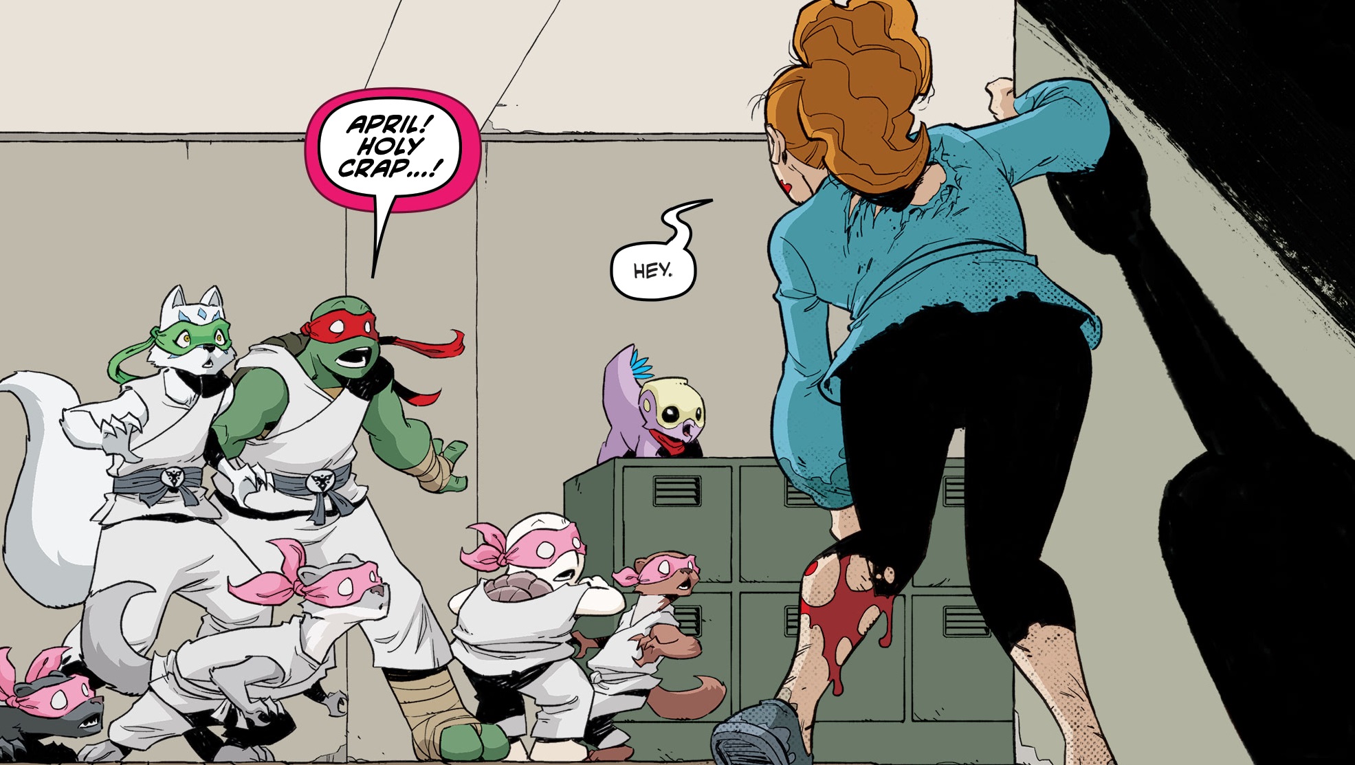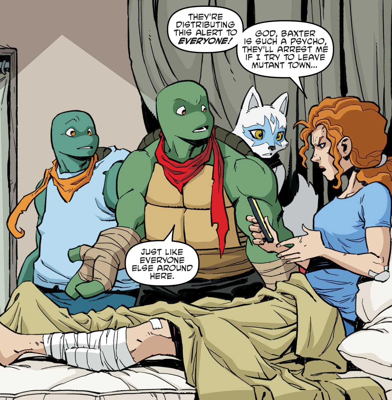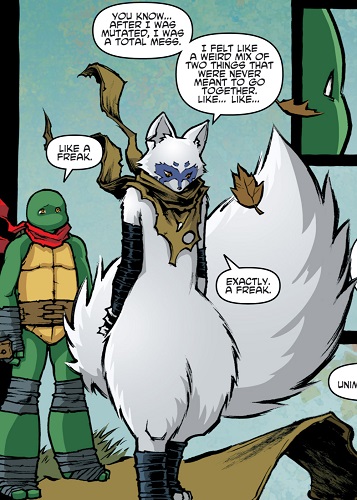 Alopex était parvenue à remonter la piste de l’enlèvement de Mushroom mais s’était faite sauvagement attaquer par Dirtchuck. Elle fut sauvée in-extremis par Leatherhead, qui s’attaqua au mutant hybride, permettant à la renarde de battre en retraite (TMNT #142). Mis au courant, Raphael partit au chevet de son amie. Il lui présentait ses excuses pour son attitude des derniers mois.
