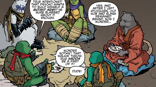 Quand les tortues revinrent à New York, Old Hob envoya Slash les inviter à la présentation de leurs membres. Les tortues ne prenaient pas cela au sérieux et se méfiaient surtout, au vu des antécédents du chat, mais cette armée pouvait être bénéfique (TMNT #38). Pigeon Pete cherchait à travers la ville de nouveaux mutants pour intégrer l’équipe d’Old Hob. Il fit la rencontre de Bebop et Rocksteady, qu’il invita à la réunion du chat. Si Hob essayait de calmer les tensions, il tira sur les deux colosses apprenant qu’ils étaient d’origine humaine, ce qu’il ne tolérait pas. Une forte lutte éclata (TMNT #39). Les Mutanimals purent prouver leur valeur au cours du combat. Raphael retrouva quant à lui Alopex, qui était de retour à New York, accompagnée d’une nouvelle équipière, Nobody (TMNT #40).
