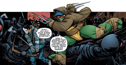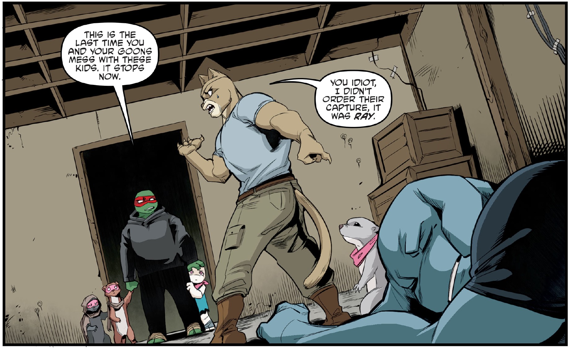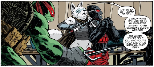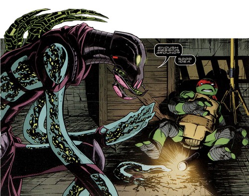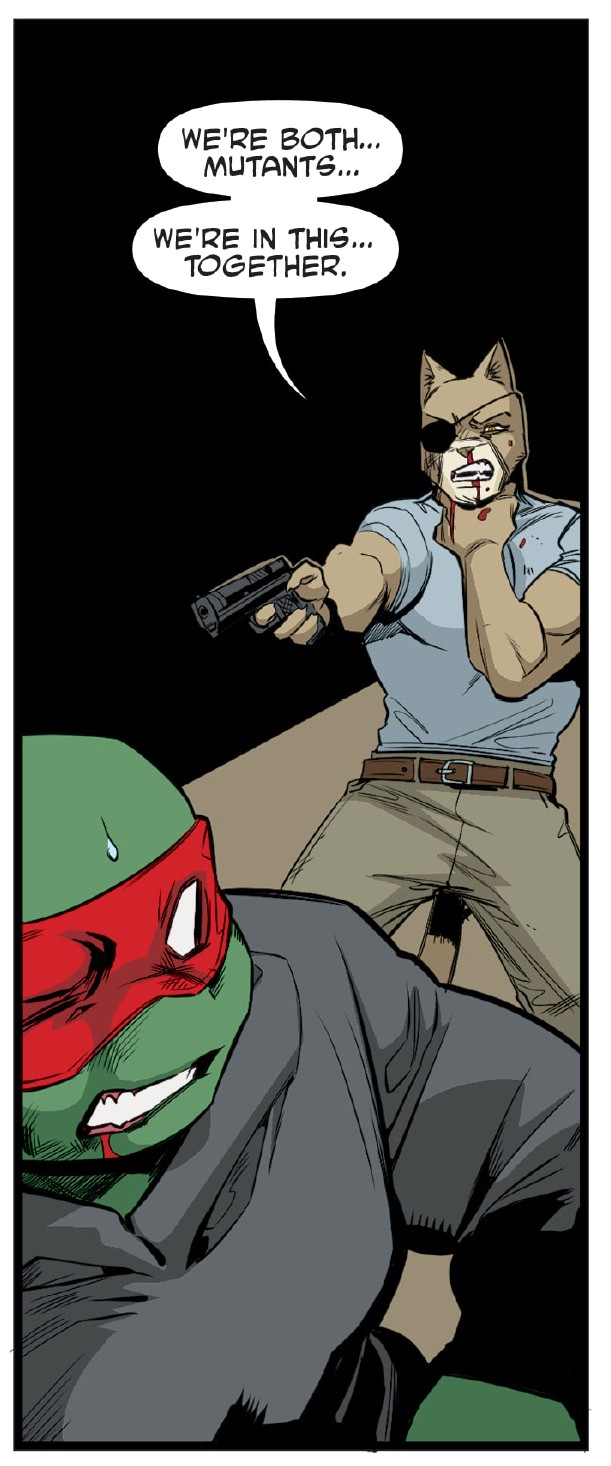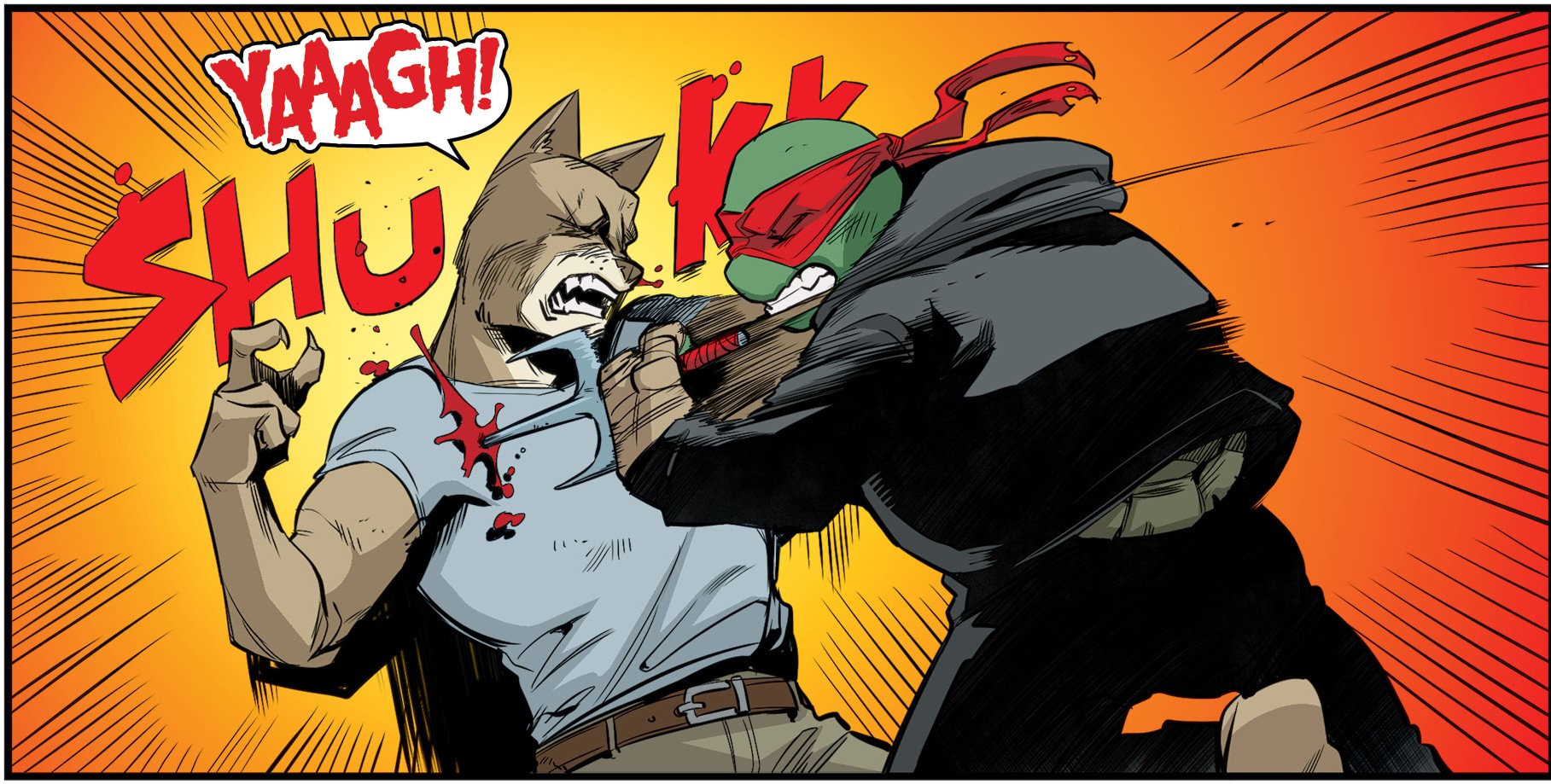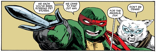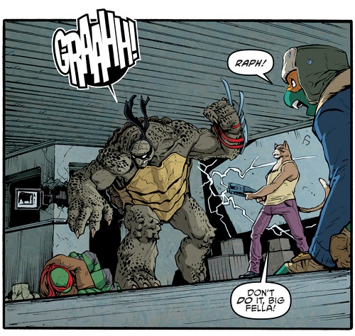 ses frères. Pris au piège, le chat pointa ses armes en direction du reptile. Si Leonardo lui demandait de ne rien faire, craignant qu’il se fasse toucher, Raphael n’en fit qu’à sa tête et sauta sur le chat. Essuyant un tir à l’épaule, il le laissa s’enfuir (TMNT (Vol. 5) #123).