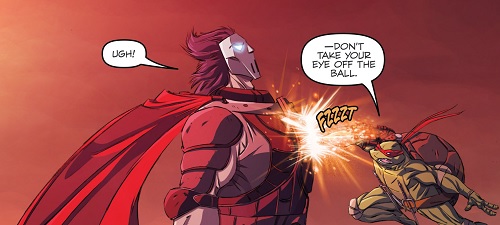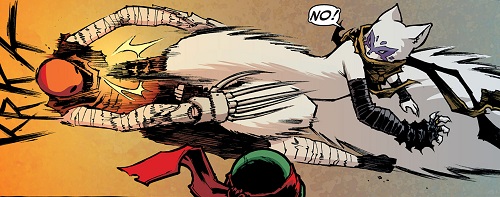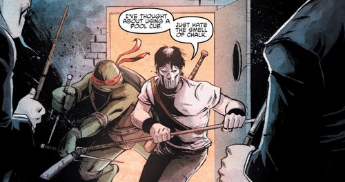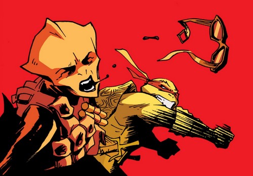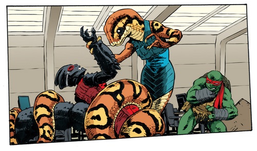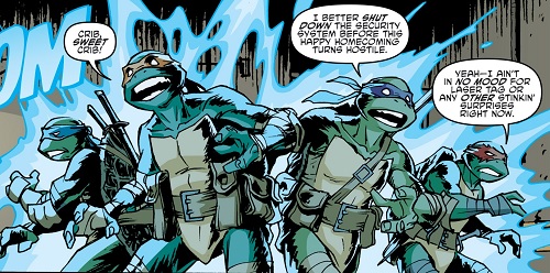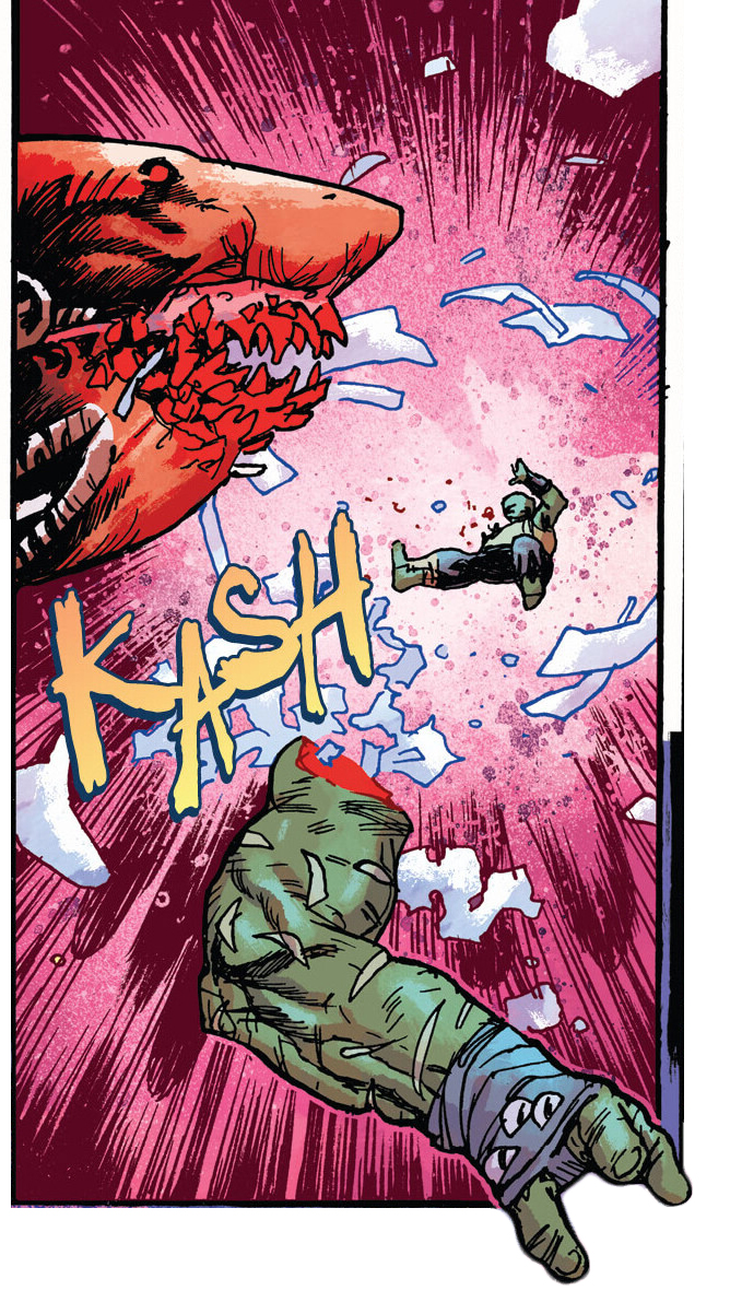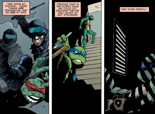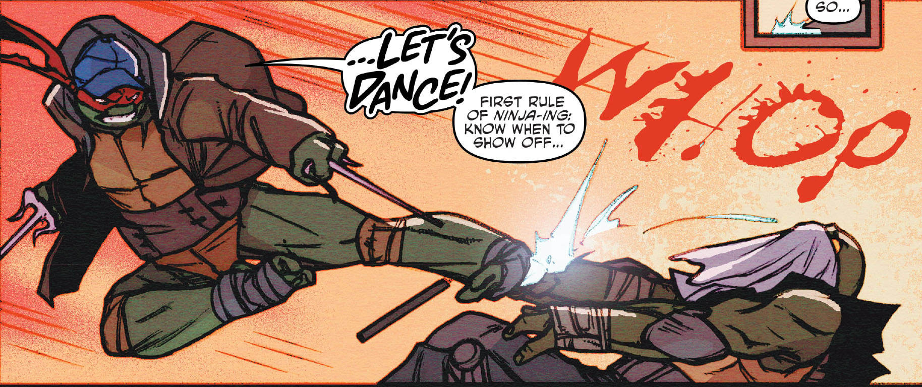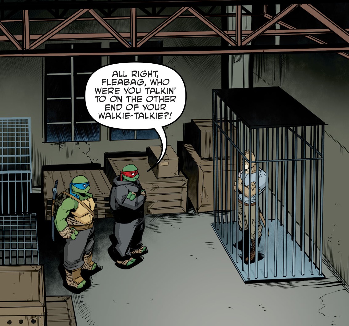 ses frères. Pris au piège, le chat pointa ses armes en direction du reptile. Si Leonardo lui demandait de ne rien faire, craignant qu’il se fasse toucher, Raphael n’en fit qu’à sa tête et sauta sur le chat. Essuyant un tir à l’épaule, il le laissa s’enfuir (TMNT (Vol. 5) #123).