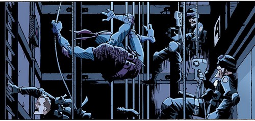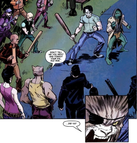Lors d’un meeting de Sally, Man Ray déploya ses mutants pour semer le chaos. Il craignait que la lionne soulève les habitants de Mutant Town contre les Mutanimals. Ainsi, il demanda à ses mutants, sans que Old Hob ne soit mis au parfum, de tirer dans la foule. C’était l’agression de trop. Les mutants partirent débusquer le chat dans ses quartiers, pensant qu’il était le commanditaire de cet attentat (TMNT (Vol. 5) #119). Découvrant ce qu’avait fait son acolyte poisson, Old Hob voulut l’éliminer. Raphael et les autres mutants fondirent sur le félin (TMNT (Vol. 5) #120). Le chat se fit molester jusqu’à l’intervention de Zanna. Il profita de cette distraction pour prendre la fuite. Raphael le rattrapa et lui planta son saï dans l’épaule droite. Cloué au mur, Old Hob fut jeté en prison, jusqu’à ce que les belettes, qui le considéraient comme son père, le délivrèrent en cachette (TMNT (Vol. 5) #122). Alors qu’il essayait de délivrer son équipier Herman, il fut surpris par Raphael et Sally Pride, venus leur rendre visite. La tortue, qui venait d’être nommée gardienne de la paix se lança à sa poursuite dans les égouts, accompagné de
