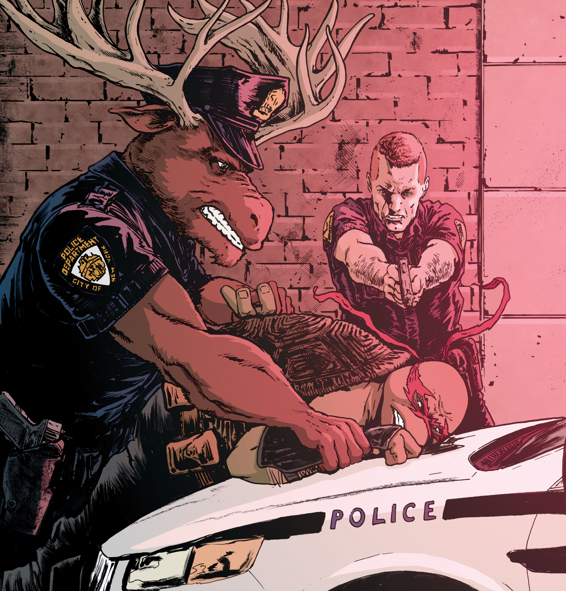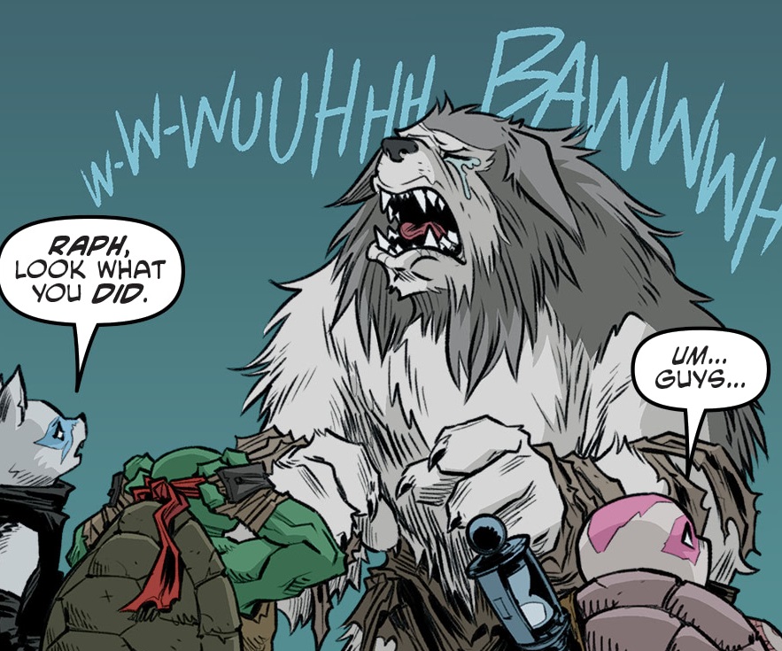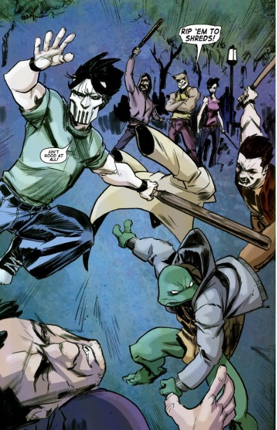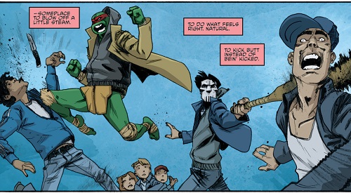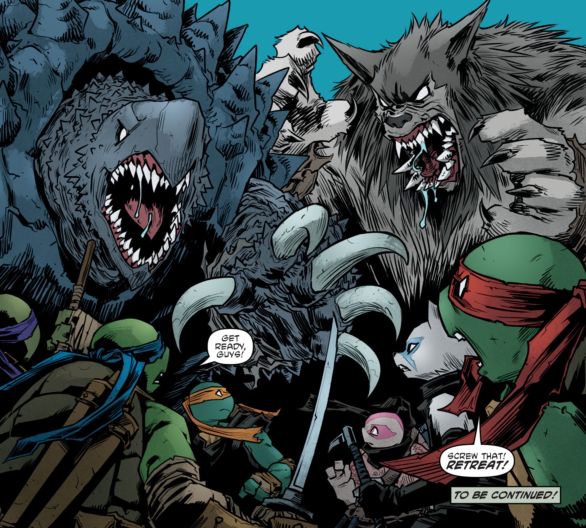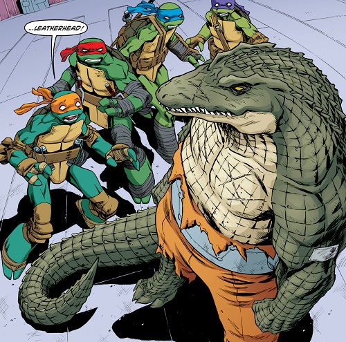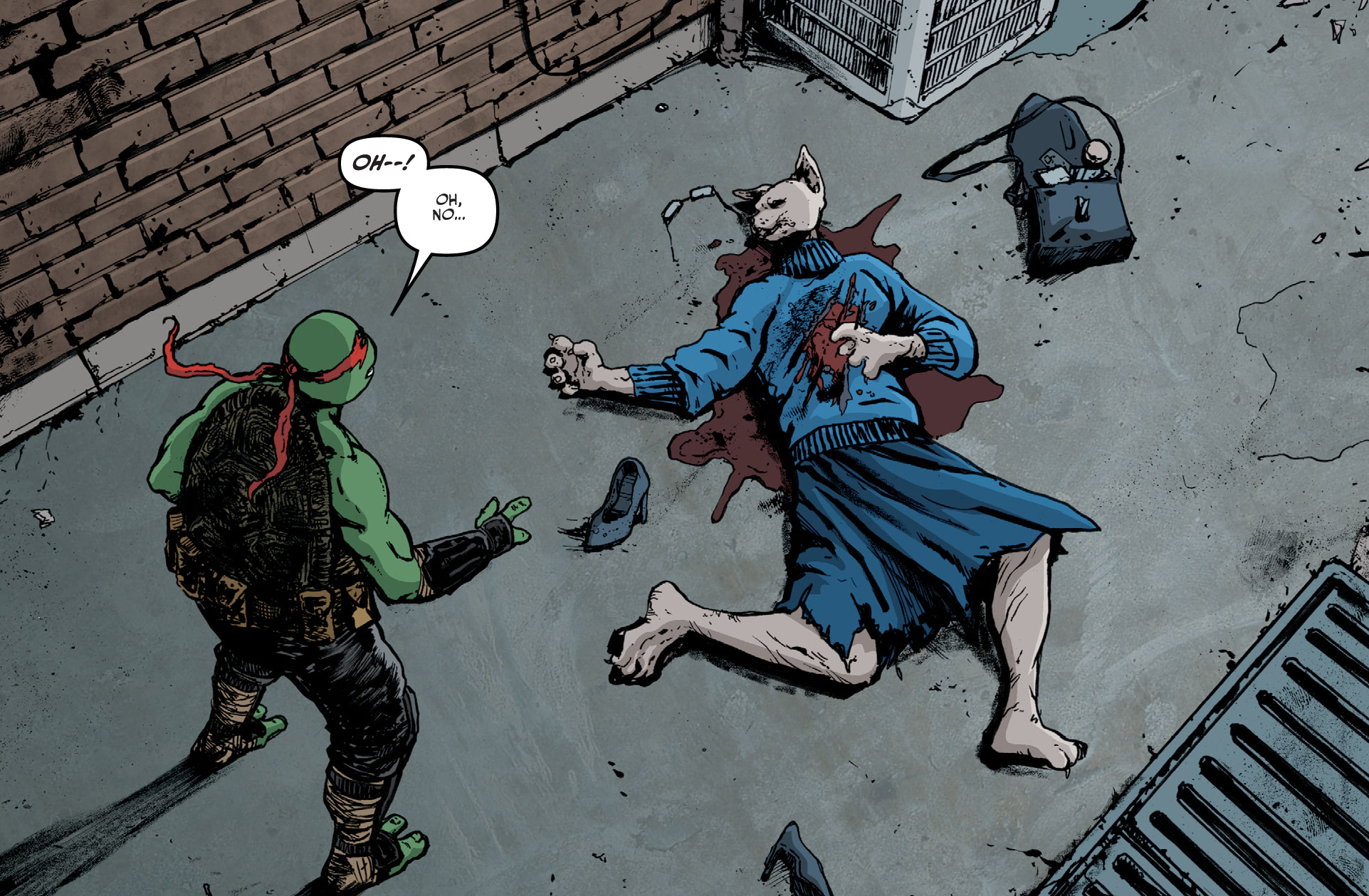 De retour au repaire, les esprits s’échauffèrent. Chaque tortue voulait vaquer à ses occupations au détriment des patrouilles. Raphael, furieux, partit se changer les esprits dans la rue et découvrit le cadavre d’un mutant dans une ruelle. Un tueur en série sévissait depuis quelques temps. Une voix effrayante lui demandait de ne pas rester là. Au même instant, la police arriva pour arrêter la tortue (TMNT #140). Au poste, Raphael fut libéré par Kara Lewis et Jennika. Désirant en savoir plus sur le crime qui s’était produit, les deux tortues retournèrent sur les lieux pour trouver des indices. Cela les mena à un entrepôt où elles découvrirent les trois belettes. Formées à présent par Alopex, celles-ci attaquèrent les reptiles avant de découvrir le criminel à l’origine de la mort des mutants. Leatherhead. Ses esprits étaient une fois encore perturbés et l’alligator s’attaqua à tous les mutants avant de s’en aller, Mushroom sous le bras. Raphael et Jennika partirent à ses trousses. Mais ils le perdirent de vue en rencontrant Leonardo, Michelangelo, Carmen et Bob. Les reproches revinrent sur la table, chacun regrettant que l’autre ne l’ait pas convié à la patrouille (TMNT #141).