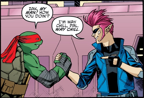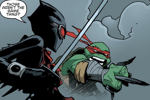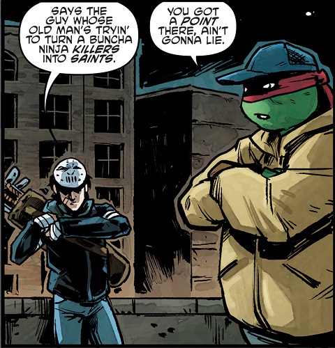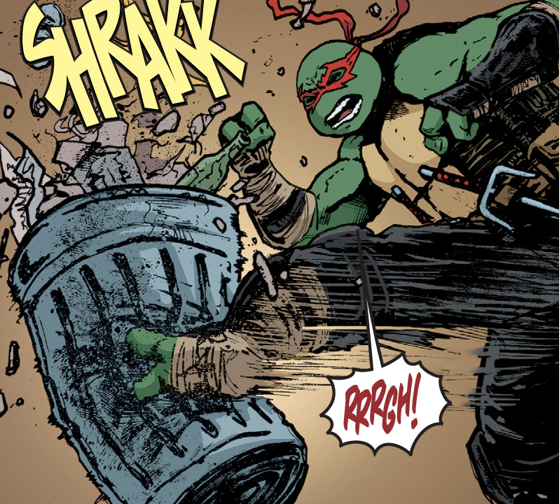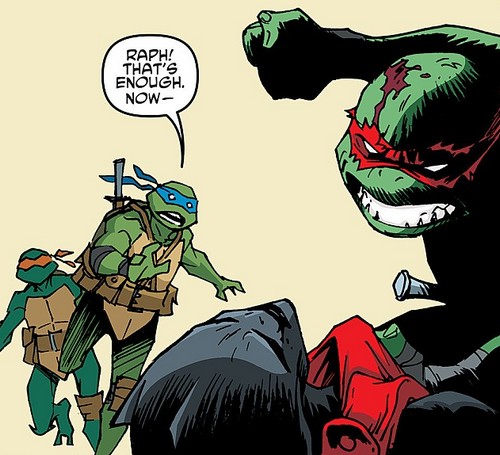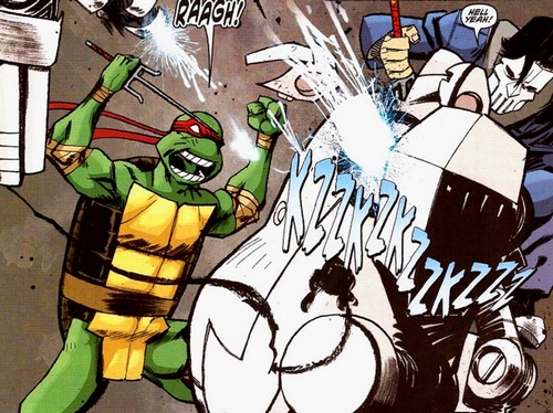 être un vaillant combattant, parfois violent, mais toujours prêt à risquer sa vie pour ses frères. Au cours d’une ronde de nuit avec son amis humain, ils aidèrent une renarde mutante du nom d’Alopex, attaquée par deux individus. Elle s’avéra être une ninja du Foot Clan qui devait gagner la confiance de Raphael pour qu’il lui montre où ils habitaient. Il parvint à se sortir de ses griffes à temps (TMNT Micro-Series #1 : Raphael). Il noua très vite une forte amitié avec Casey Jones qu’il aida notamment à sortir son père d’une affaire de dettes. Lorsque le jeune garçon lui annonça que ses ennuis étaient terminés, Arnold passa ses nerfs sur lui. Casey repartit dans la boutique des O’Neil pour demander des soins à ses amis (TMNT Micro-Series #6 : Casey Jones). Raphael, voyant son ami dans un tel état, partit tête baisser régler son compte à son père. Splinter le suivit et prit un de ses saïs pour montrer à Raphael l’horreur de ce qu’il s’apprêtait à faire (TMNT #13). Cela refroidit la tortue qui comprit son erreur (TMNT #14).