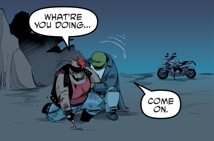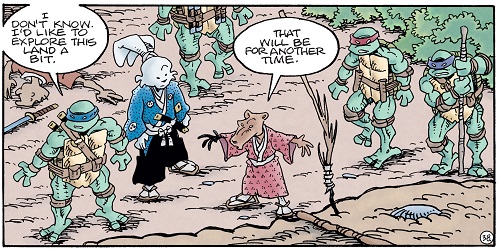 Finalement, les tortues, aidées d’autres alliés, retrouvèrent la cachette de Jasper Barlow et eurent raison de ses gardes (TMNT #143). Ramenant Mushroom à Alopex, Raphael se sentit comme oublié face à la joie de la renarde de retrouver la petite belette. C’était peut-être mieux ainsi. La tortue avait décidé de quitter New York pour suivre un nouveau chemin. Les tensions avec ses frères montraient qu’il avait besoin de prendre ses distances avec sa famille. Enfourchant une moto, il leur fit ses adieux et quitta la ville (TMNT #144).