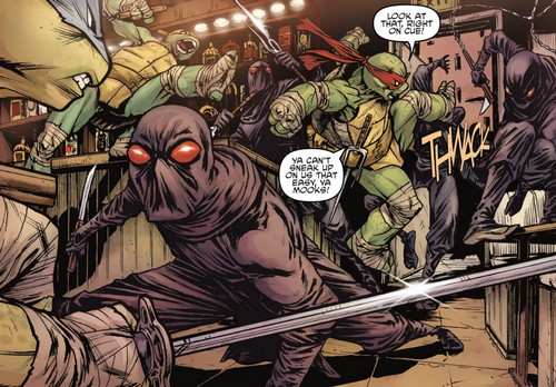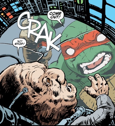 Mais un jour, le mutant retrouva le chef de la prison assassiné de ses saïs. Des ninjas du Foot Clan étaient venus lui faire porter le chapeau pour s’assurer qu’il ne sorte pas de sitôt. Raphael leur livra bataille avant de s’enfuir par un souterrain creusé par d’autres prisonniers dont il avait eu vent. Si le Foot Clan était de retour, ses frères couraient eux aussi un grand danger (TMNT (Vol. 6) #1).
