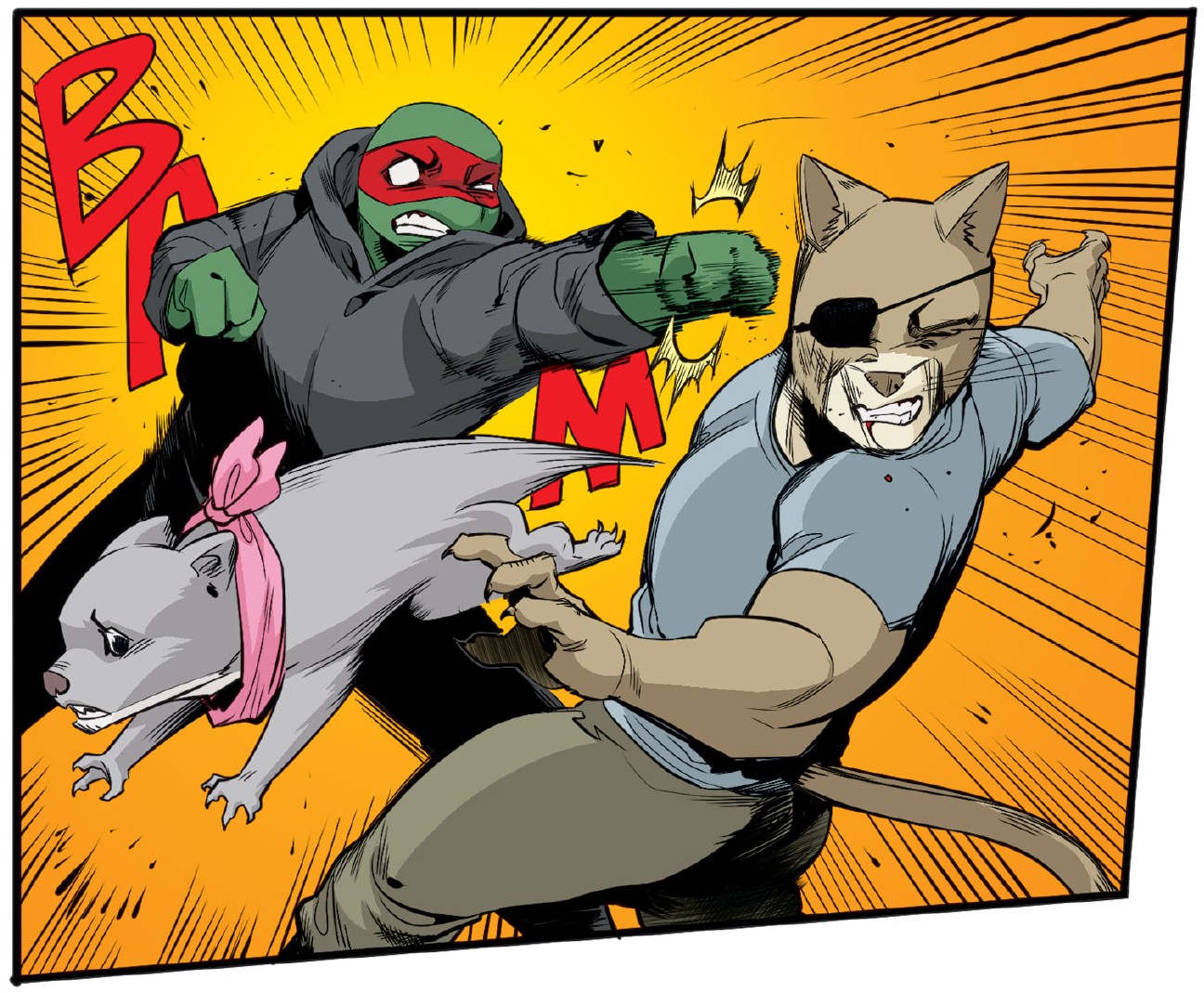 Cette soirée ne fut pas de tout repos. Un chat des rues vola Raphael dans sa gueule. Splinter le sauva de ses crocs, mais ne put le récupérer à temps, interrompu par les ninjas, de retour pour ramasser leur butin (TMNT #2).