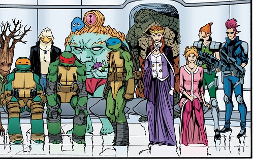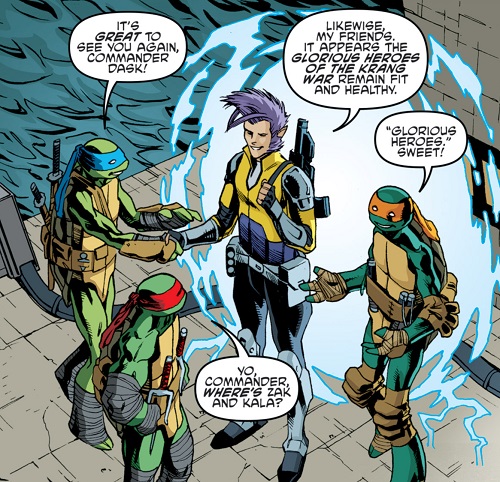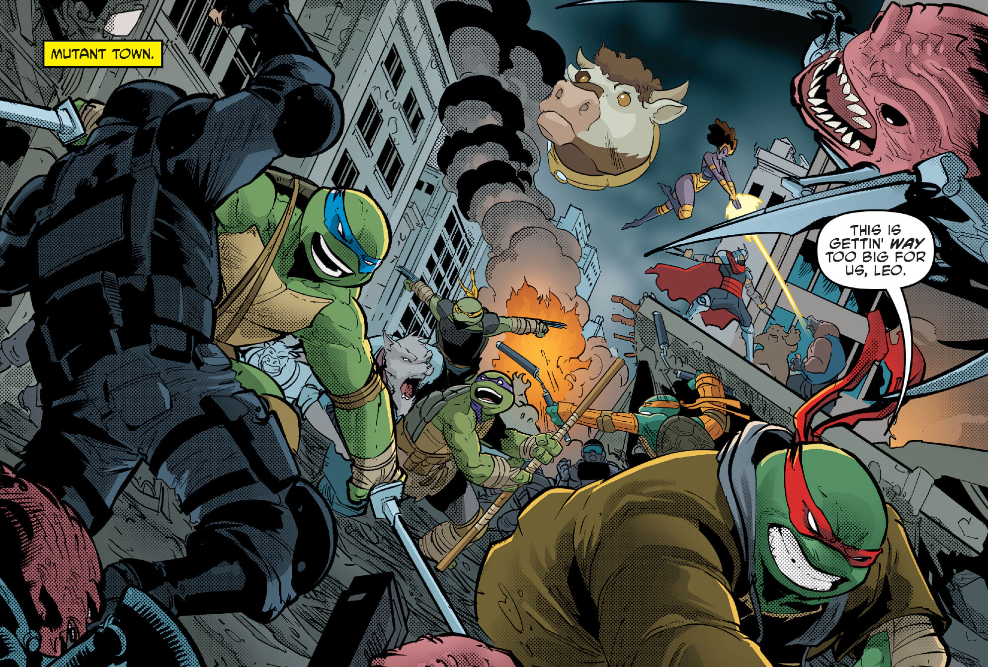 Les tortues durent voler à l’aide de Karai, qui avait un rôle majeur à jouer à l’avenir. Son hélicoptère venait de se crasher au centre de Mutant Town. Les frères volèrent à sa rescousse et l’installèrent dans leur dojo pour son rétablissement. Raphael surveilla notamment Jennika pour ne pas qu’elle s’attaque à sa rivale, ce qui les mena à un affrontement (TMNT (Vol. 5) #114). Après avoir neutralisé Bebop et Rocksteady, Leonardo proposa la paix à Karai. La jeune femme l’accepta et fit preuve de bonne foi (TMNT (Vol. 5) #117).