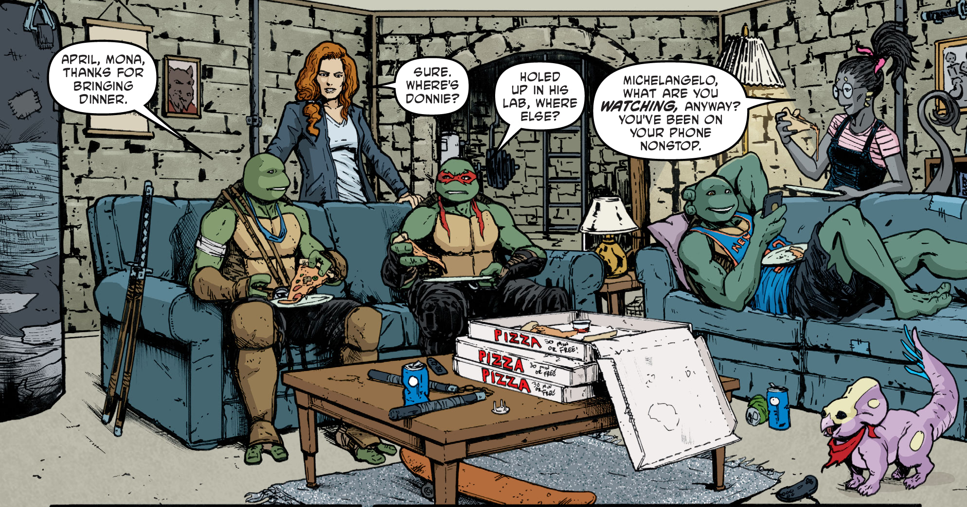 Leonardo n’était pas au mieux de sa forme. Encore confus, il préféra rester à l’écart des siens et vivre quelques jours dans la forêt pour se remettre en question. Cette attitude déplaisait à Raphael, qui voulait voir son frère réagir rapidement. Pour couronner le tout, Alopex, la renarde polaire du Foot Clan les avait suivis. Elle prétendait ne plus vouloir entendre parler de Shredder, mais seul Splinter et Leonardo semblaient la croire (TMNT #29). Raphael avait retrouvé la trace de son frère dans la forêt. Il restait au bord de l’eau à réfléchir sur les évènements des dernières semaines. Il surprit Alopex à l’observer. Plaçant le monouchi de son saï sous sa gorge, il commença à la menacer. La renarde lui expliqua qu’elle venait remercier la tortue de l’avoir défendue plus tôt dans la journée devant sa famille. Elle laissa Raphael sans voix. Le lendemain soir, Michelangelo fatigué de voir les tensions qui prenaient sa famille, décida de faire un barbecue.