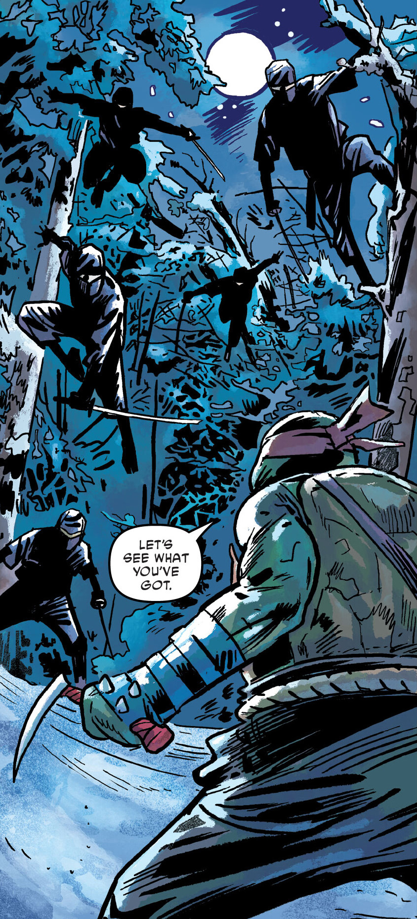 Après les fêtes de Noël (TMNT (Vol. 5) #65), Raphael partit avec Angel en Alaska à la recherche d’Alopex. La renarde fuyait Kitsune et espérait reprendre le cours de sa vieabandonné jadis (TMNT Villains micro-series #4 : Alopex). Mais tout avait été détruit après le passage de Shredder. Sa forêt était dévastée.